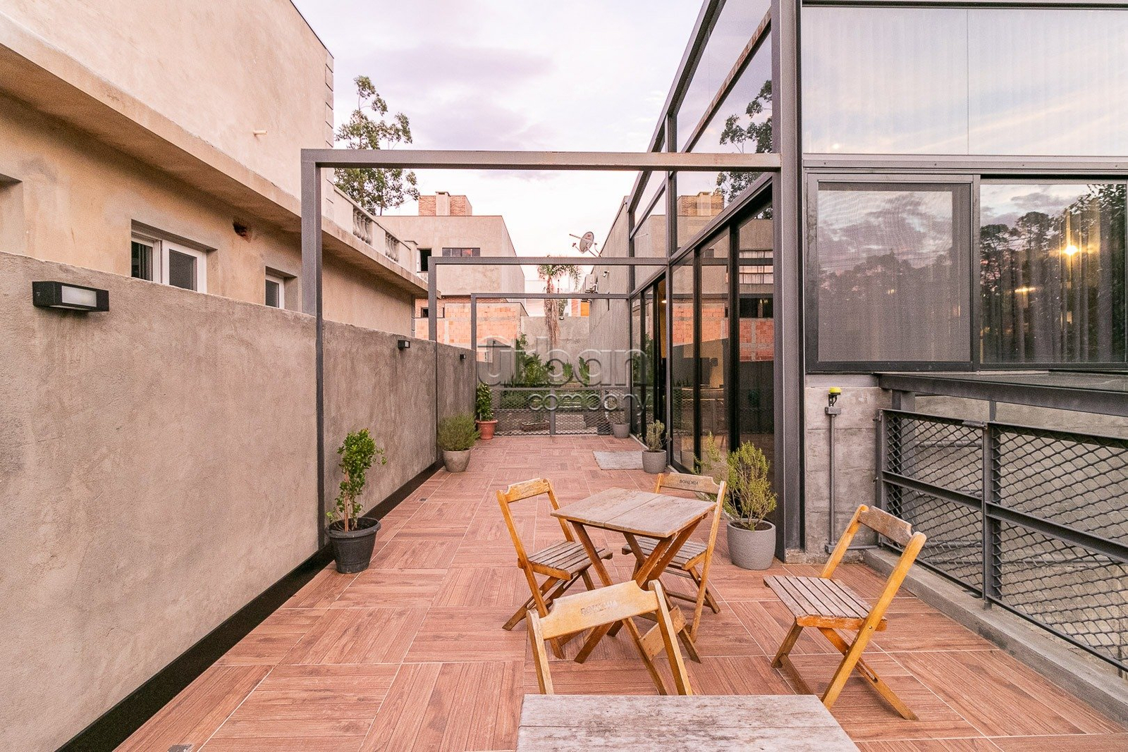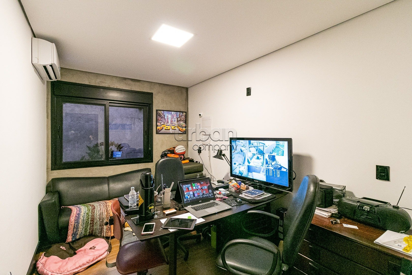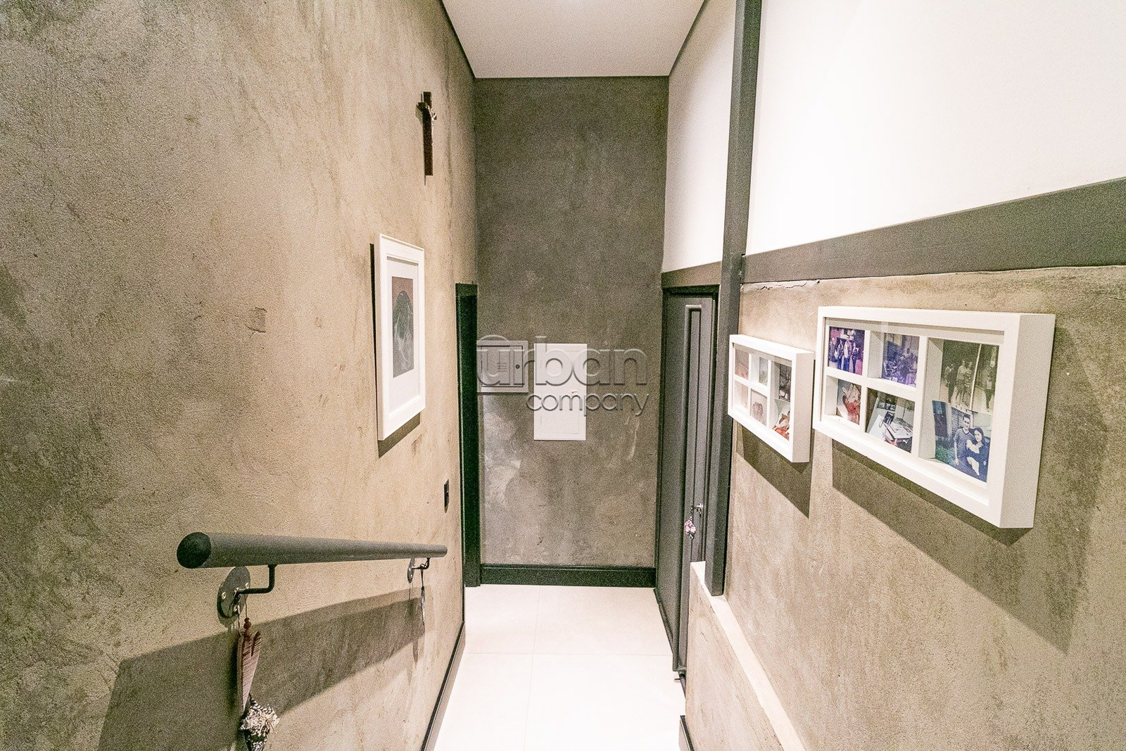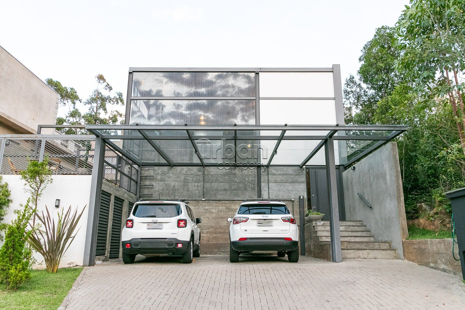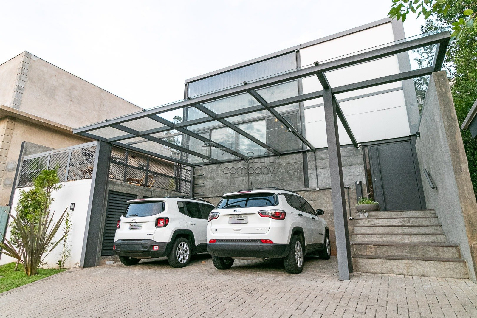 Ao nível da rua, a residência dispõe de um estacionamento coberto para dois automóveis, garantindo praticidade no dia a dia. Além disso, conta com um depósito de 19m², oferecendo espaço adicional para armazenamento.