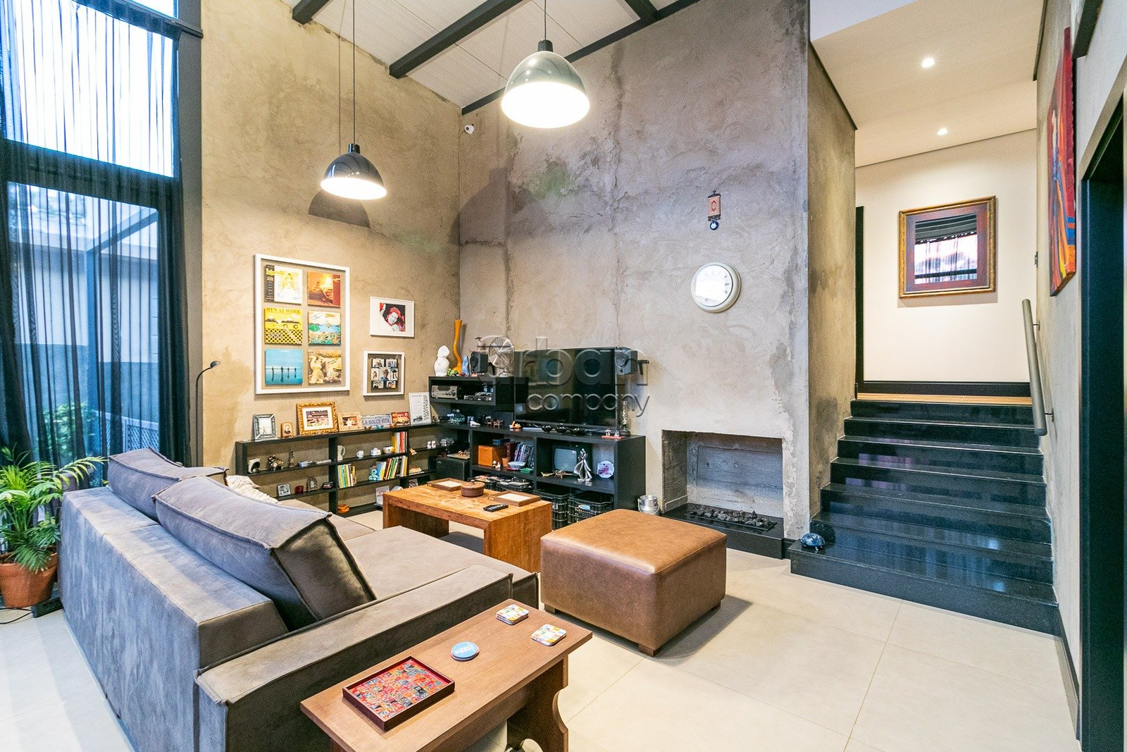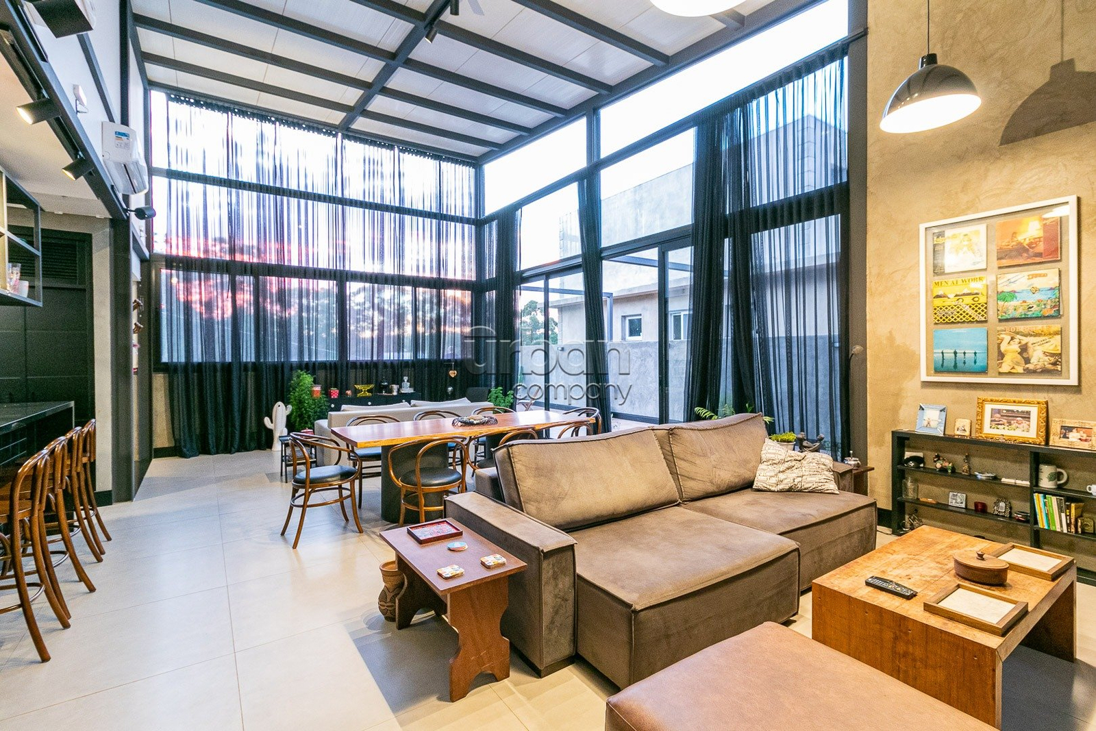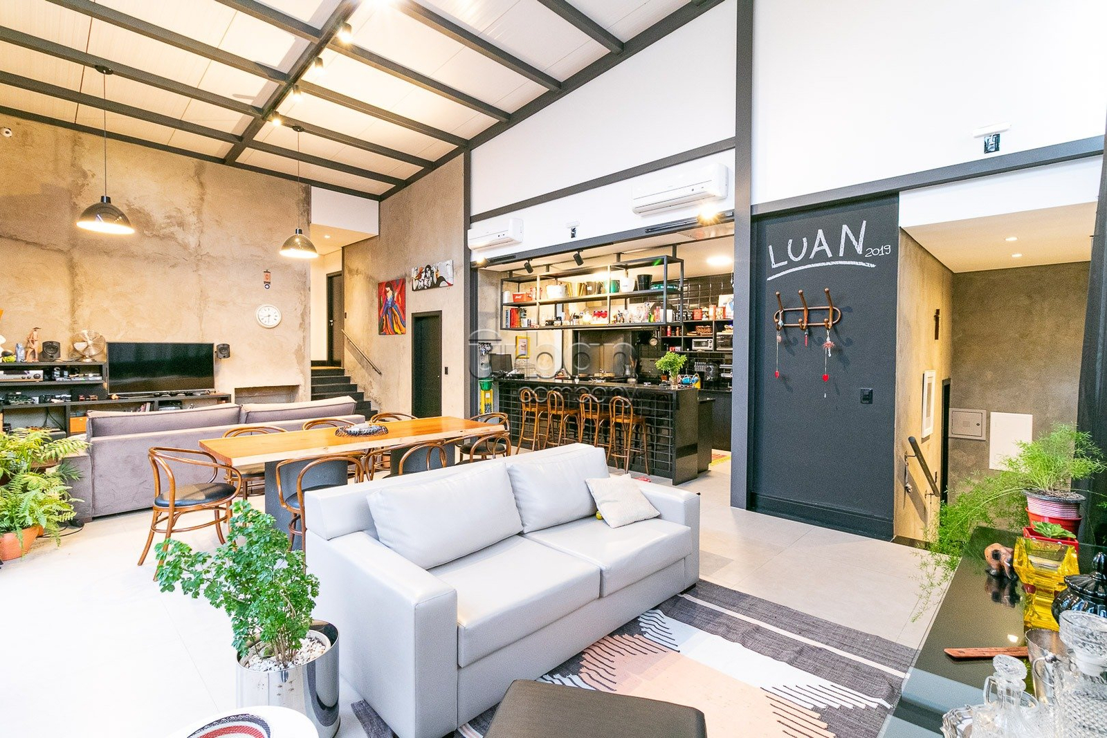 Construída em um pavimento único, a área social conta com um hall de entrada imponente, lavabo e uma ampla sala de estar e jantar, que se conectam harmoniosamente ao terraço, criando um espaço de convivência ideal. O home theater com lareira adiciona aconchego, enquanto o pé direito duplo possibilita a criação de um mezanino, ampliando as possibilidades do ambiente. A cozinha integrada é funcional e sofisticada, equipada com churrasqueira e acompanhada de uma lavanderia bem planejada.