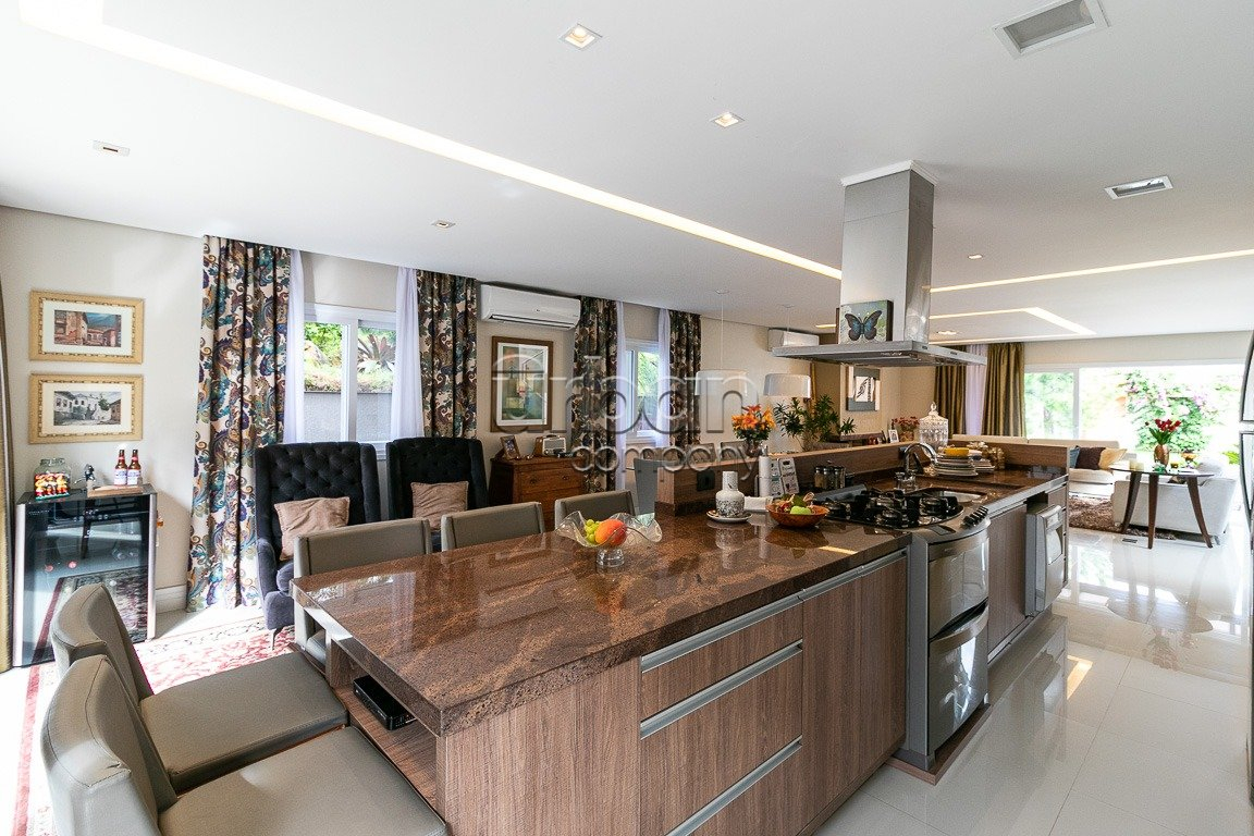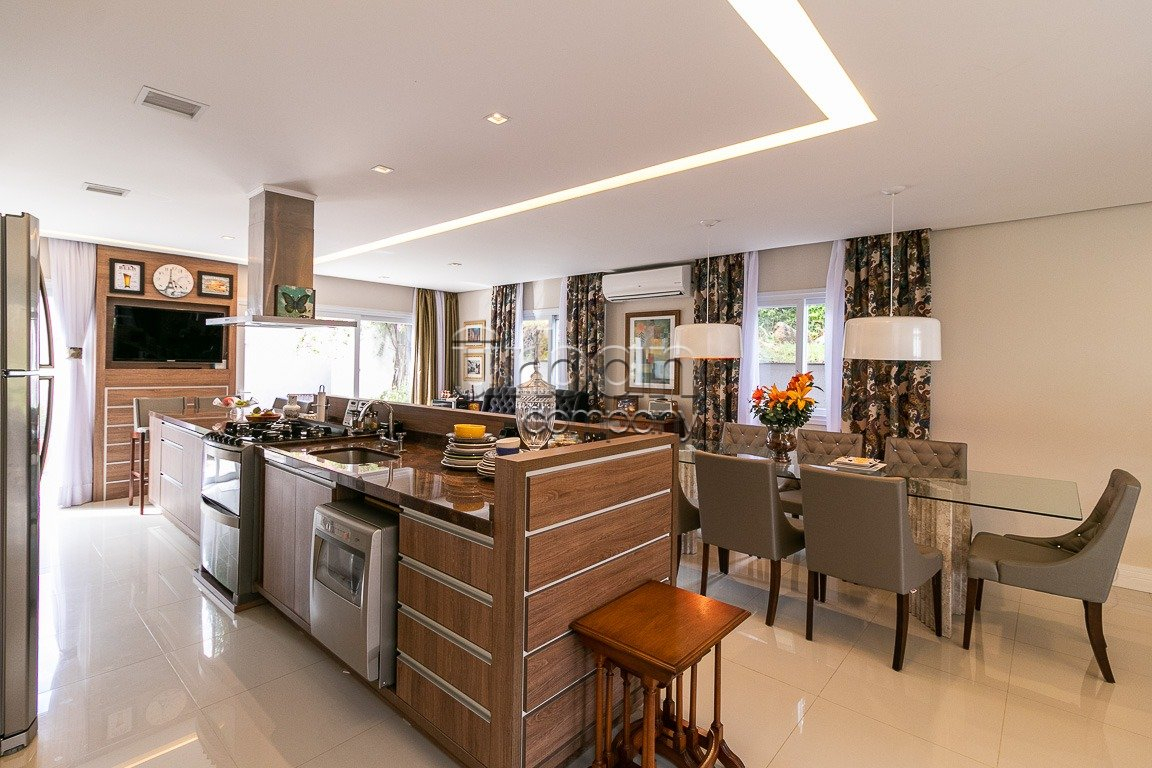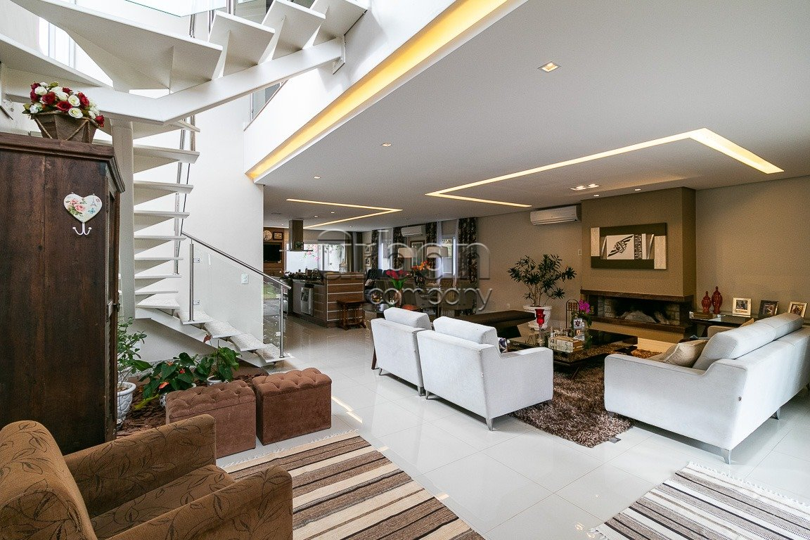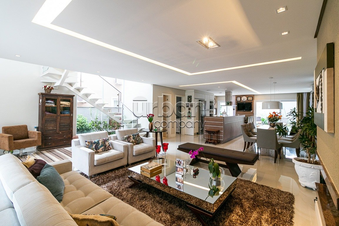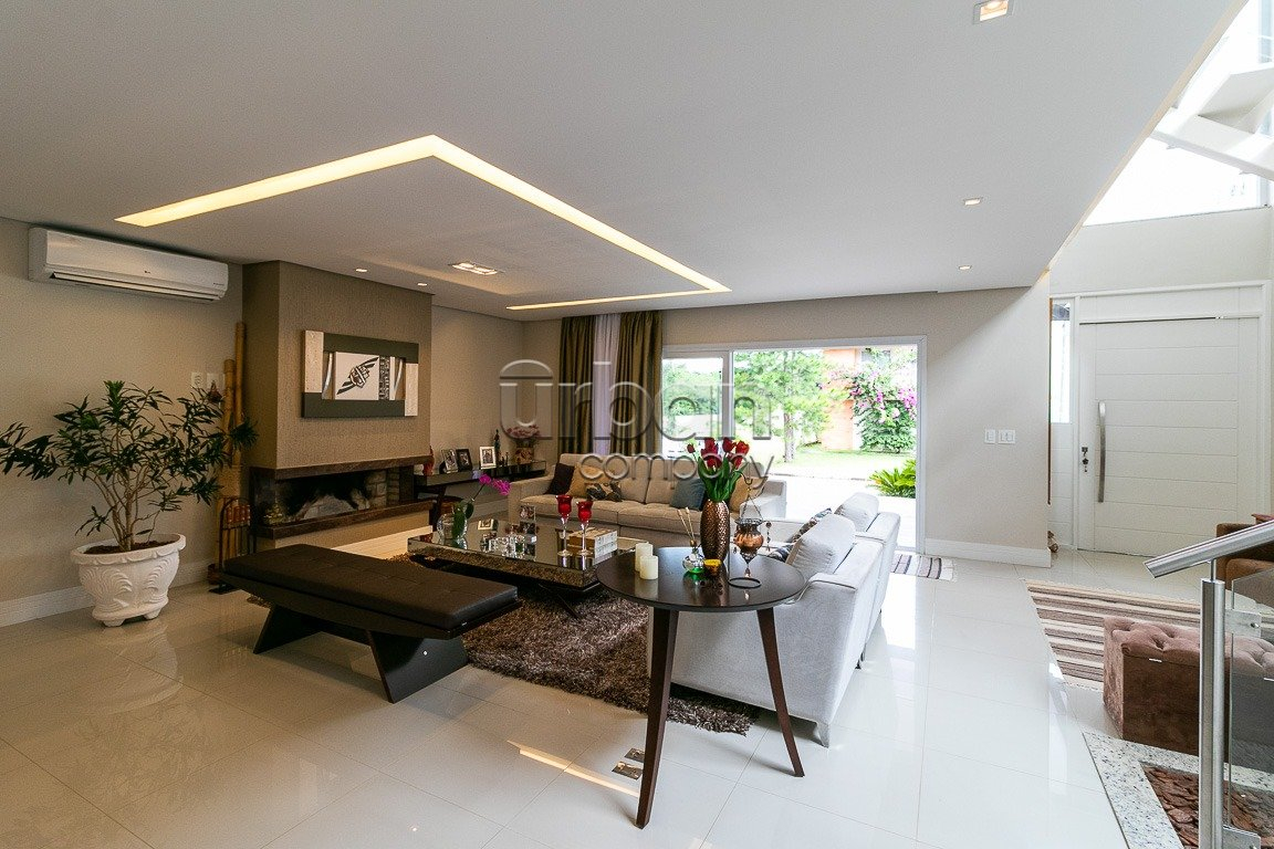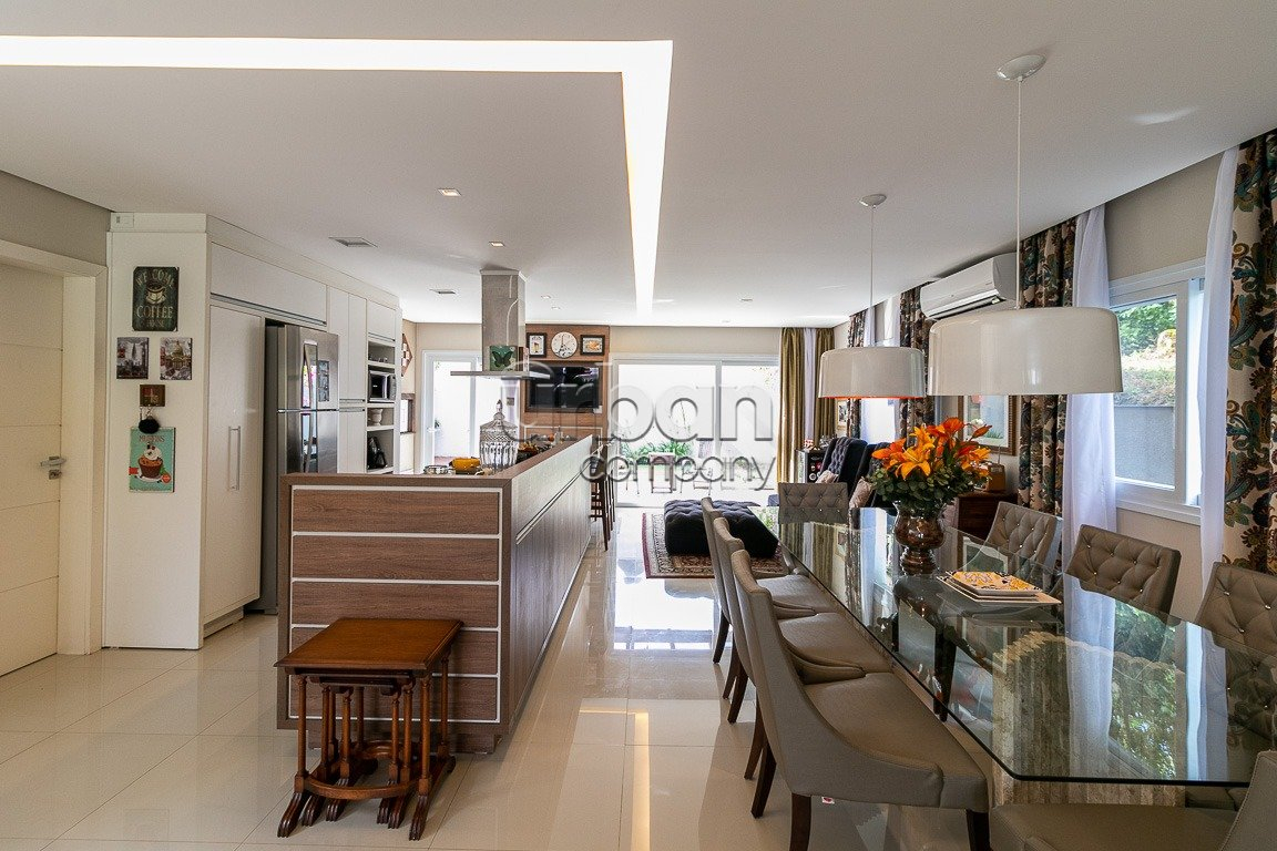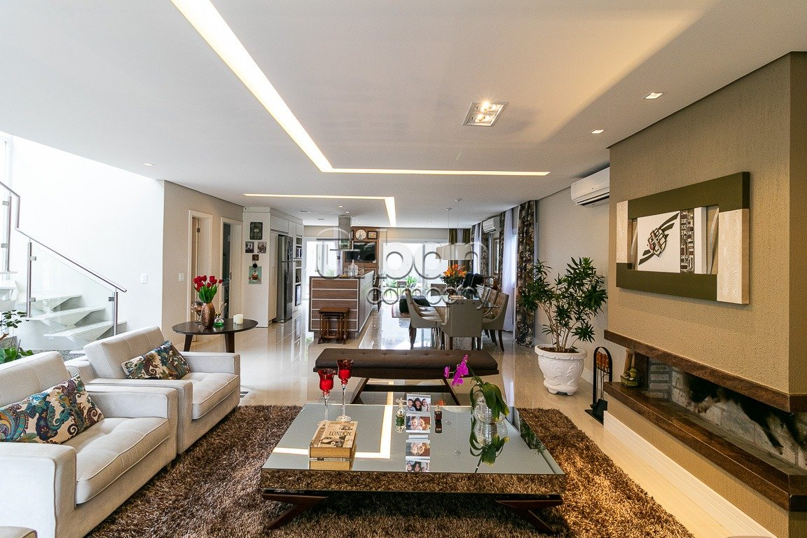 Com 250m² de área privativa, o pavimento térreo dispõe de um hall de entrada que dá as boas-vindas a uma ampla sala de estar com lareira, ideal para momentos aconchegantes. A sala de jantar conecta-se harmoniosamente à cozinha integrada, equipada com bancada de ilha e espaço gourmet com churrasqueira. A área social se estende até um lindo jardim com deck, proporcionando um espaço agradável para lazer e convivência. O térreo ainda conta com lavabo e lavanderia, garantindo praticidade no dia a dia.