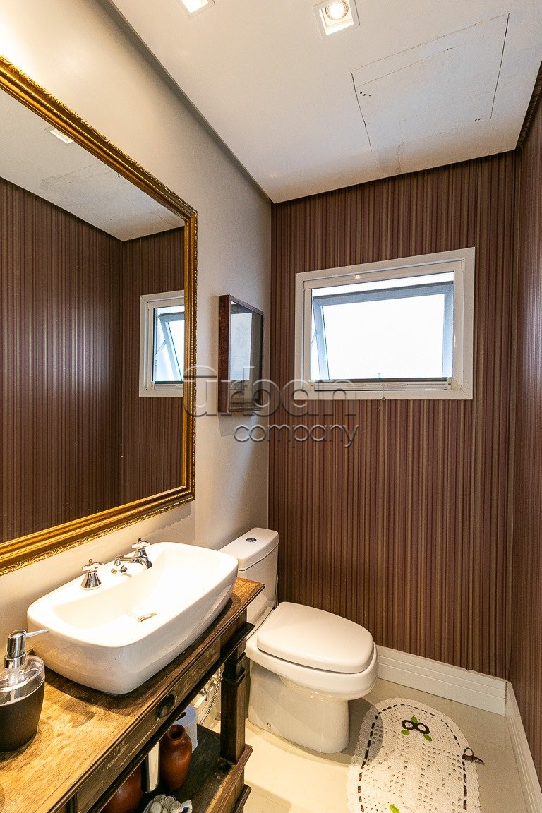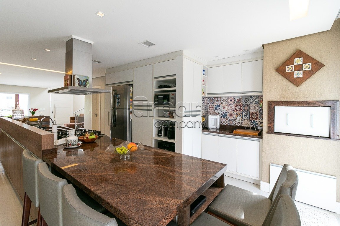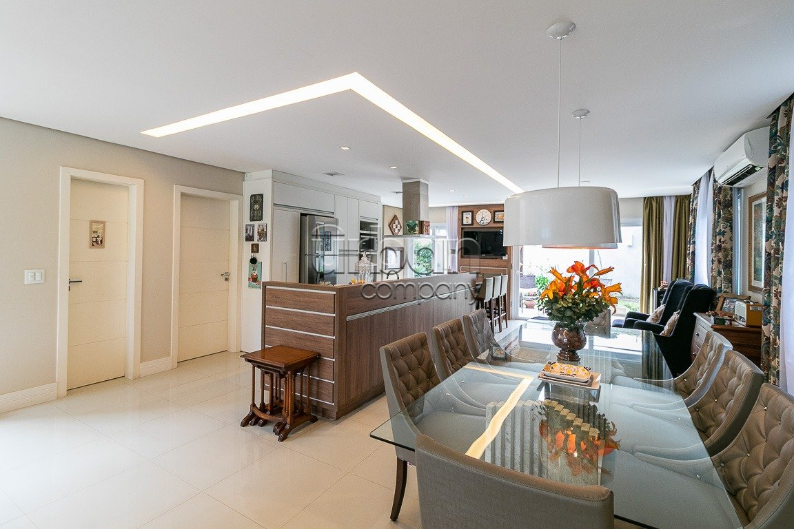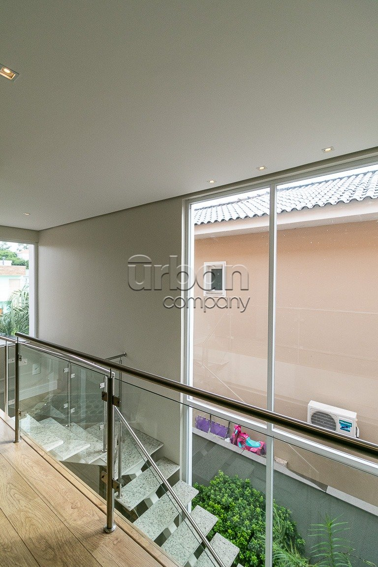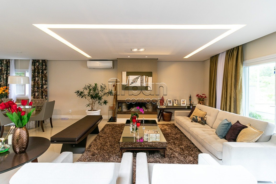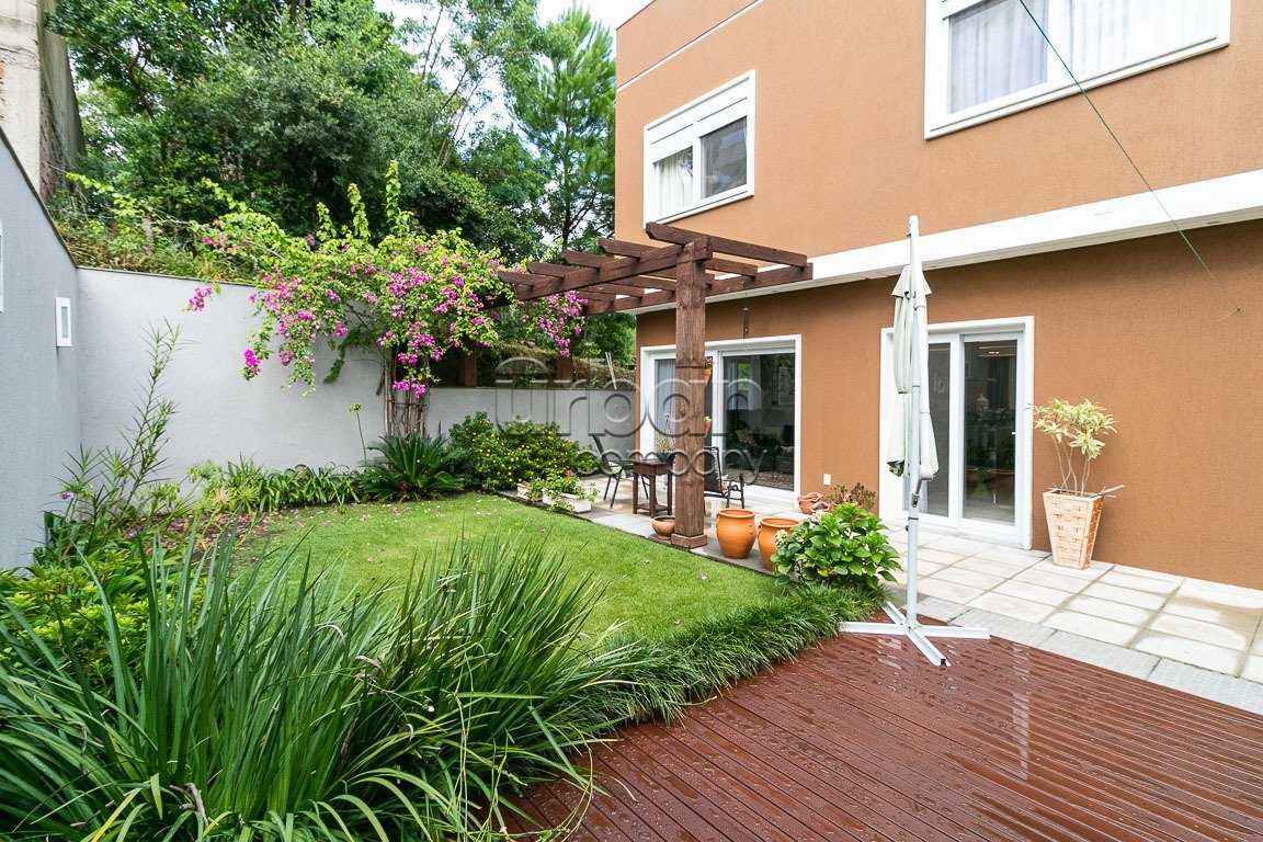 Com 250m² de área privativa, o pavimento térreo dispõe de um hall de entrada que dá as boas-vindas a uma ampla sala de estar com lareira, ideal para momentos aconchegantes. A sala de jantar conecta-se harmoniosamente à cozinha integrada, equipada com bancada de ilha e espaço gourmet com churrasqueira. A área social se estende até um lindo jardim com deck, proporcionando um espaço agradável para lazer e convivência. O térreo ainda conta com lavabo e lavanderia, garantindo praticidade no dia a dia.
