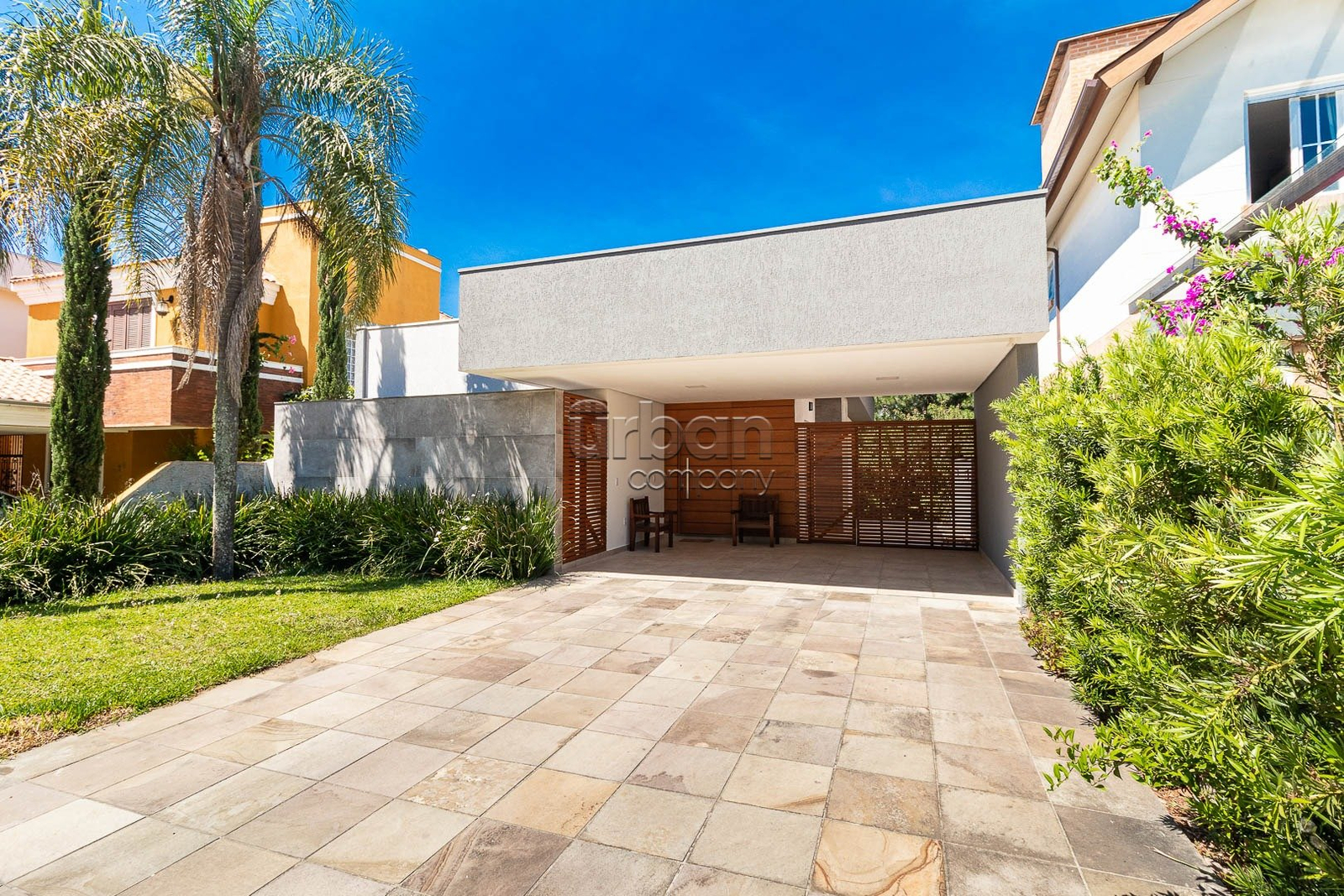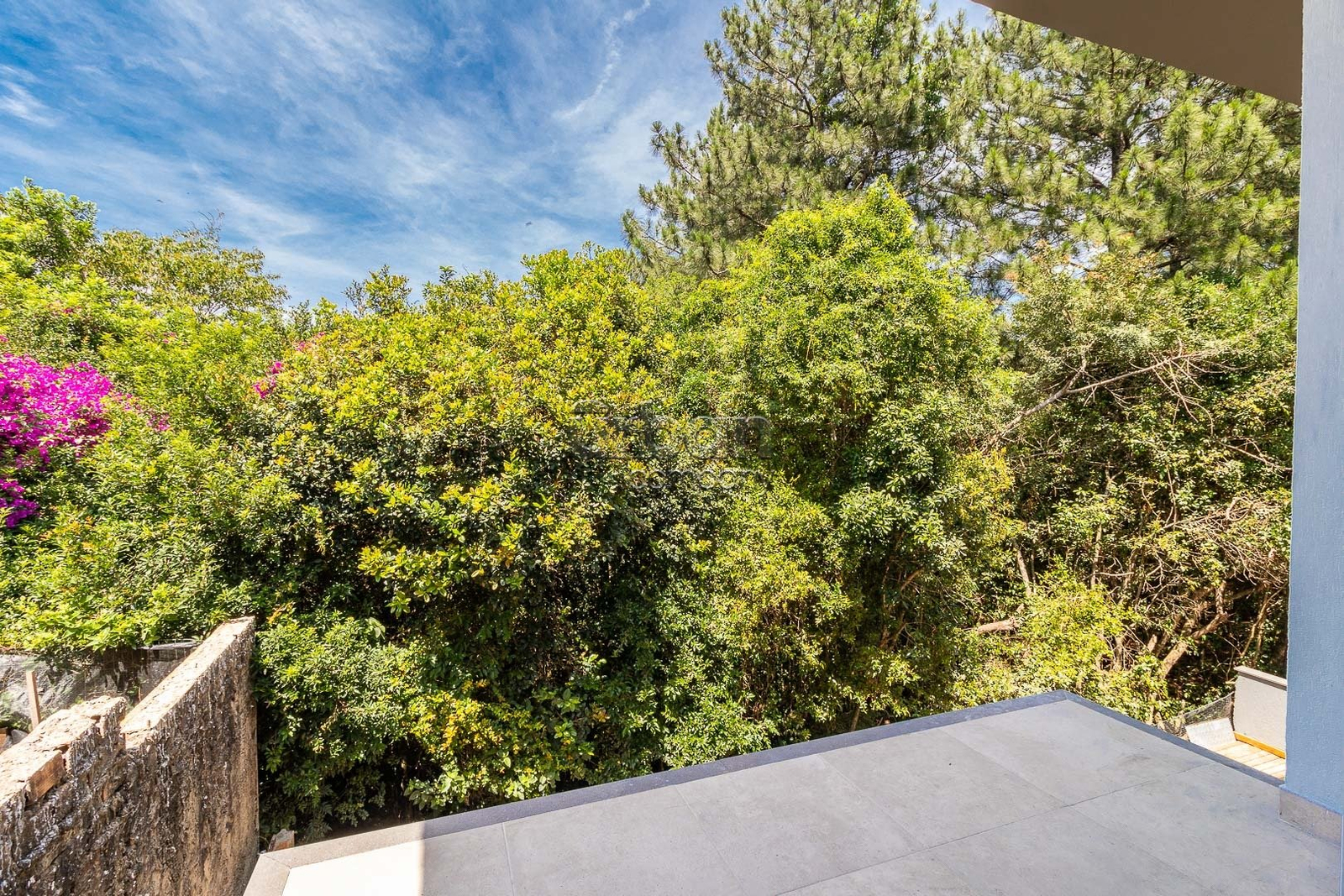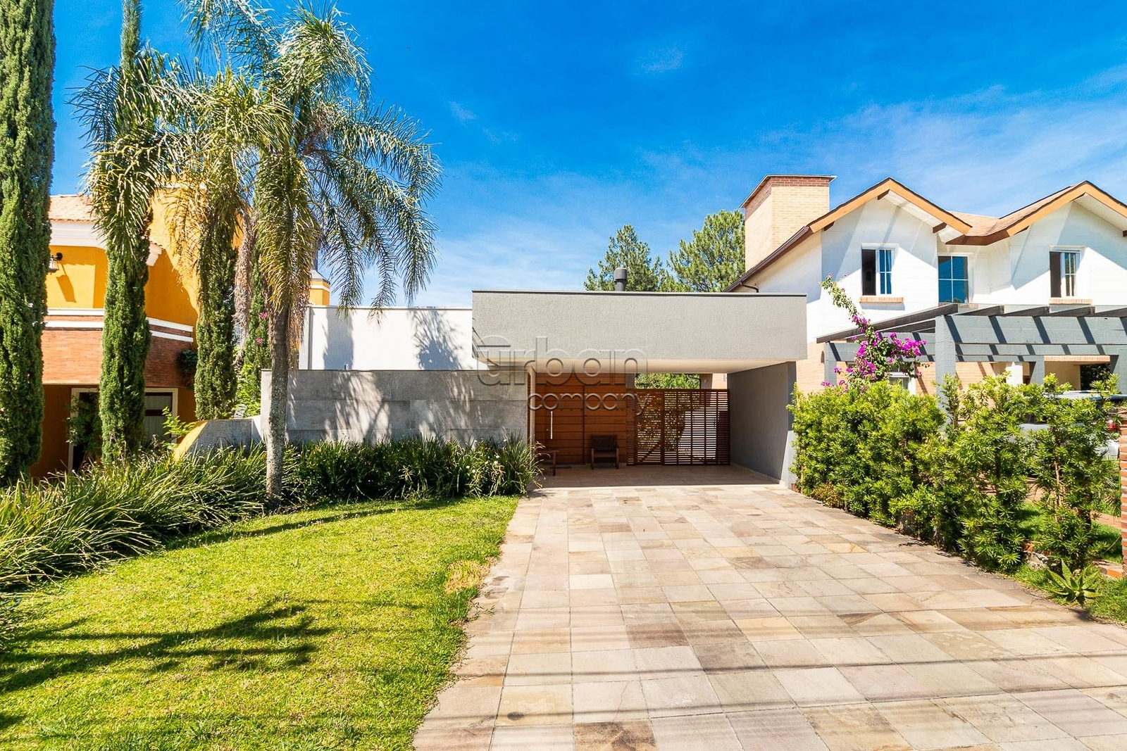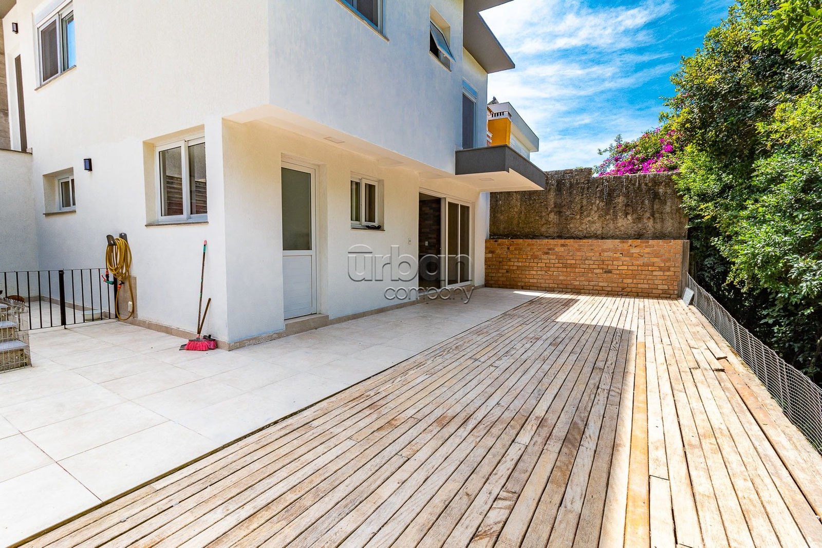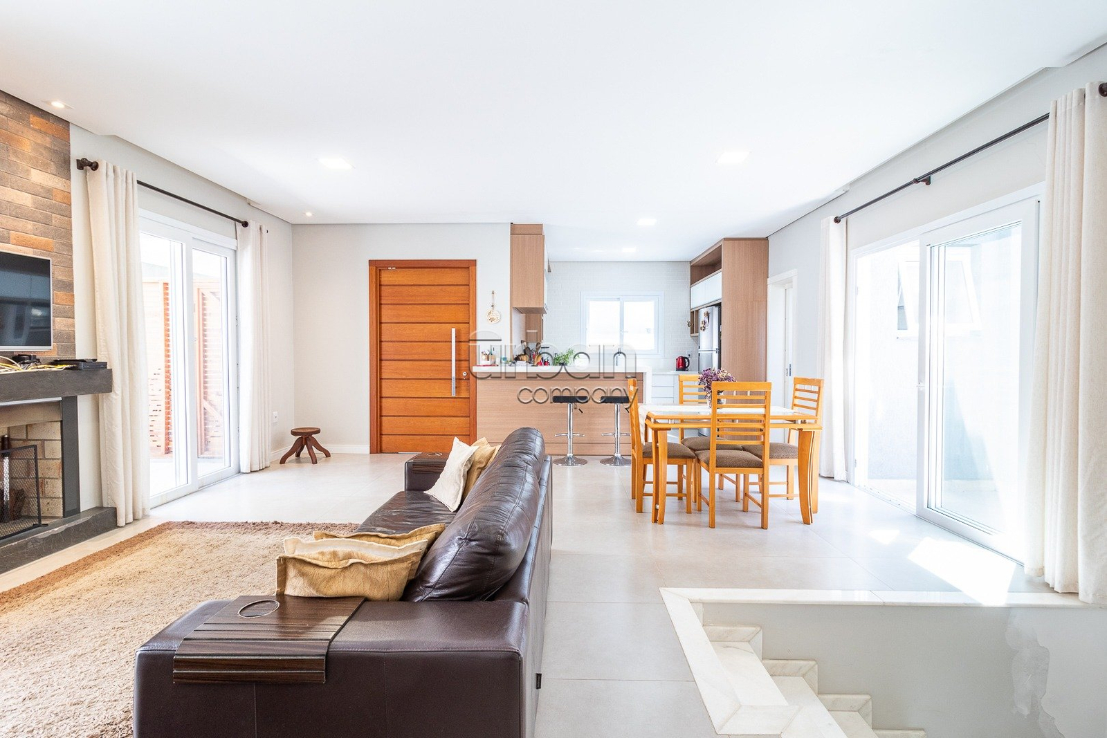 O pavimento térreo conta com sala de estar com lareira, sala de jantar, cozinha mobiliada e lavanderia. Na área íntima, três dormitórios, sendo uma suíte com sacada e um banheiro.