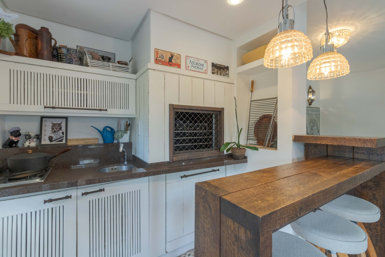 Piso superior com living para 2 ambientes com lareira, espaço gourmet com churrasqueira, gabinete, terraço com deck e jacuzzi.