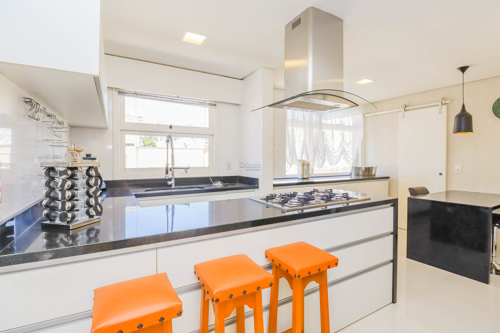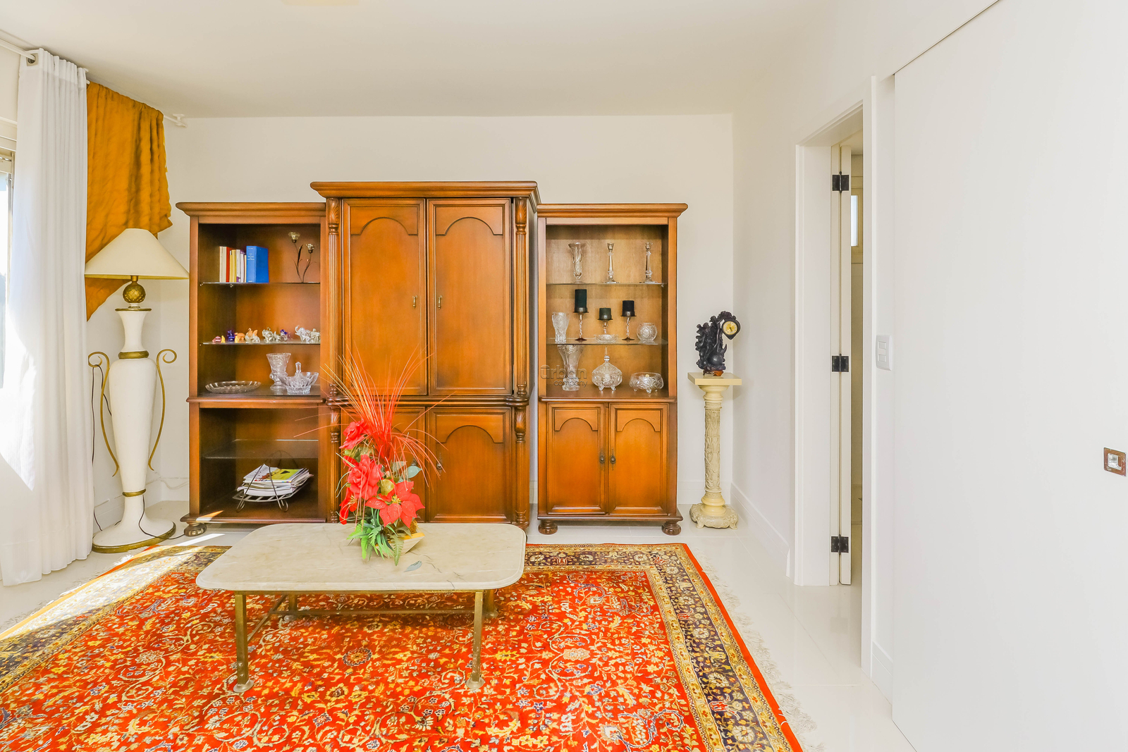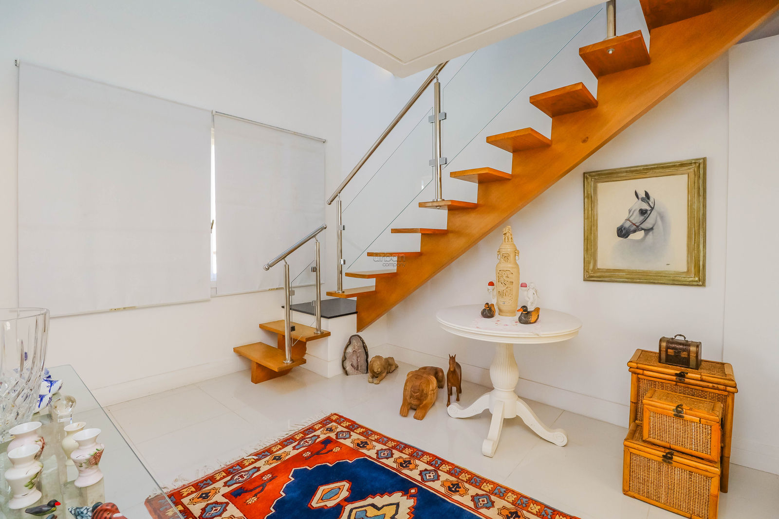 No piso inferior encontramos o lavabo, living para 2 ambientes, 3 dormitórios, sendo 1 suíte (2 dormitórios foram transformados em gabinete e sala de estar, mas com fácil reversão), hall com acesso a escada e forno para pizza, espaçosa copa-cozinha com ilha gourmet e área de serviço separada.