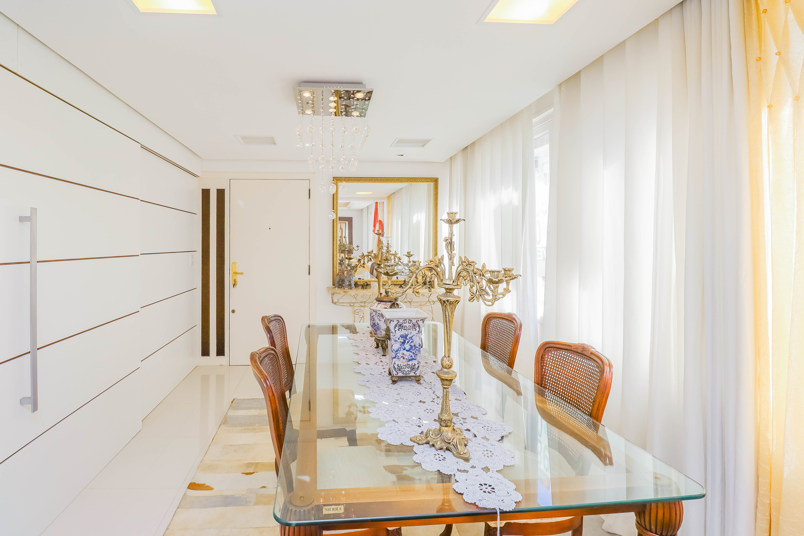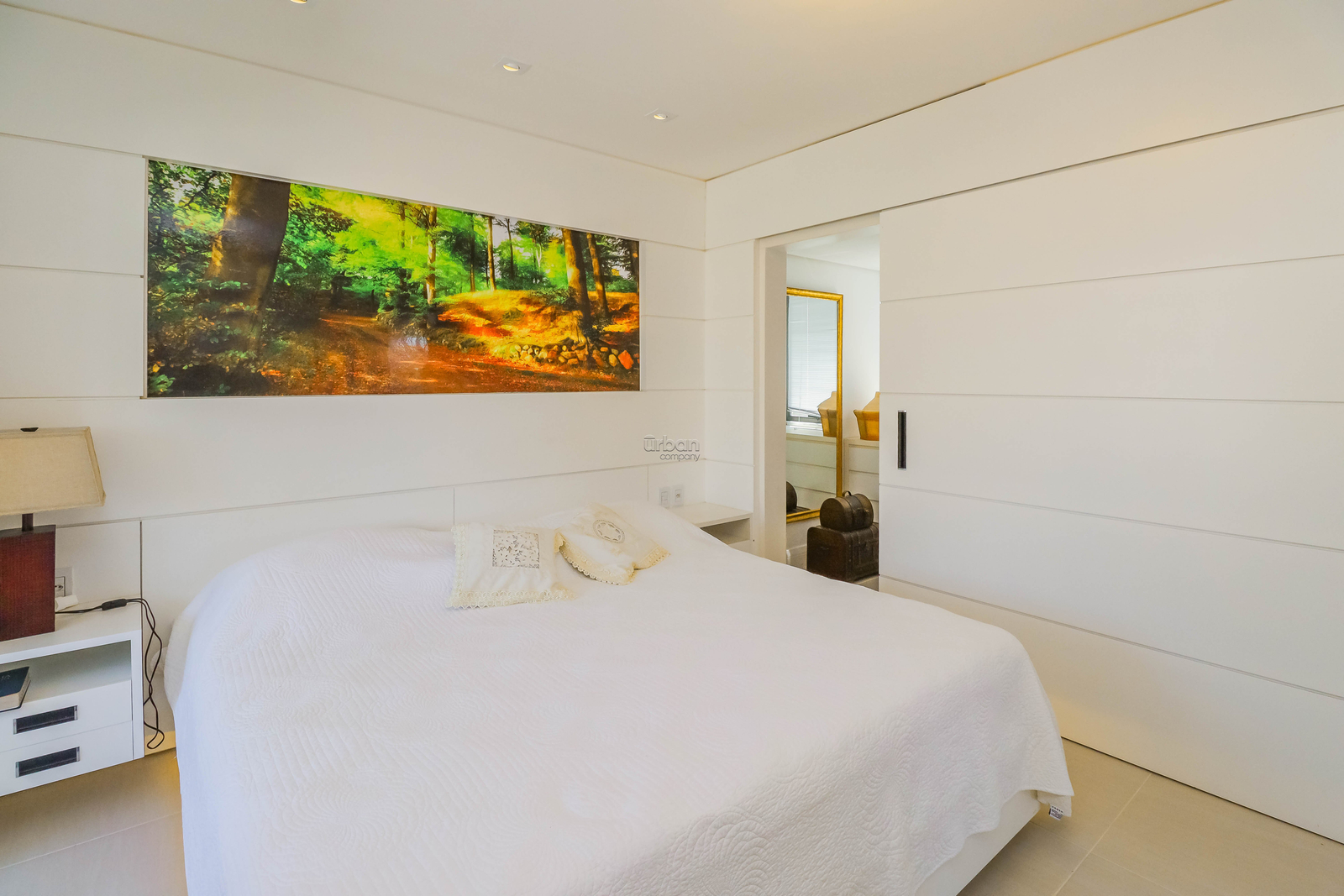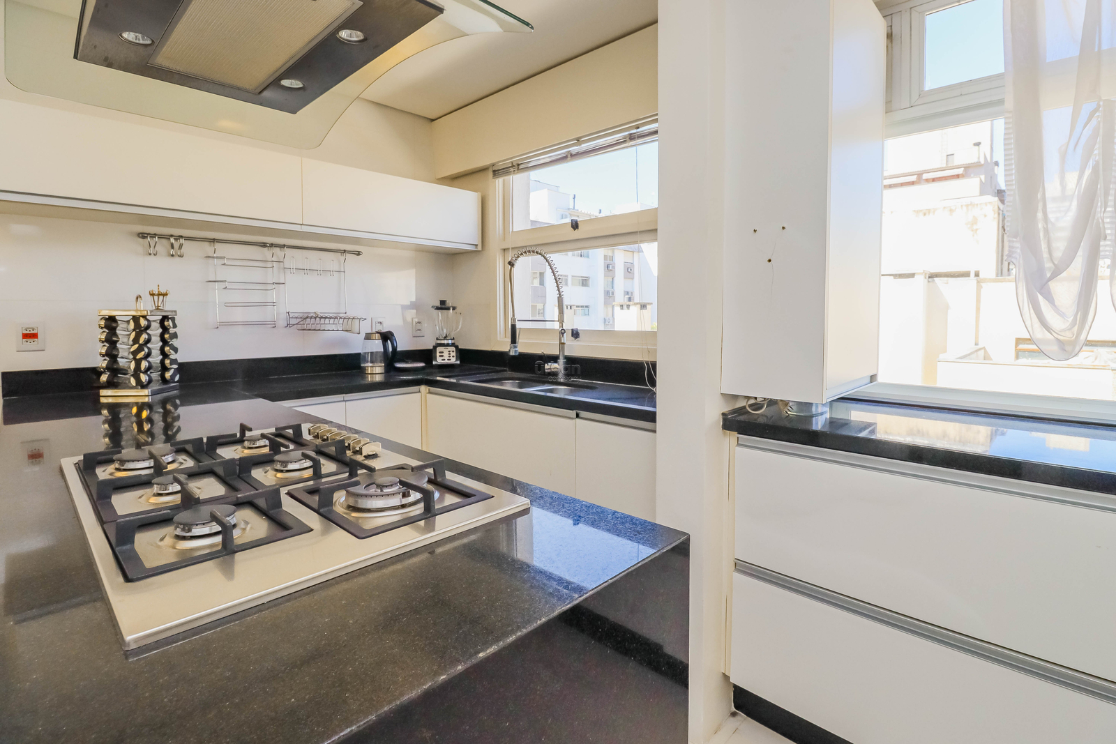 No piso inferior encontramos o lavabo, living para 2 ambientes, 3 dormitórios, sendo 1 suíte (2 dormitórios foram transformados em gabinete e sala de estar, mas com fácil reversão), hall com acesso a escada e forno para pizza, espaçosa copa-cozinha com ilha gourmet e área de serviço separada.