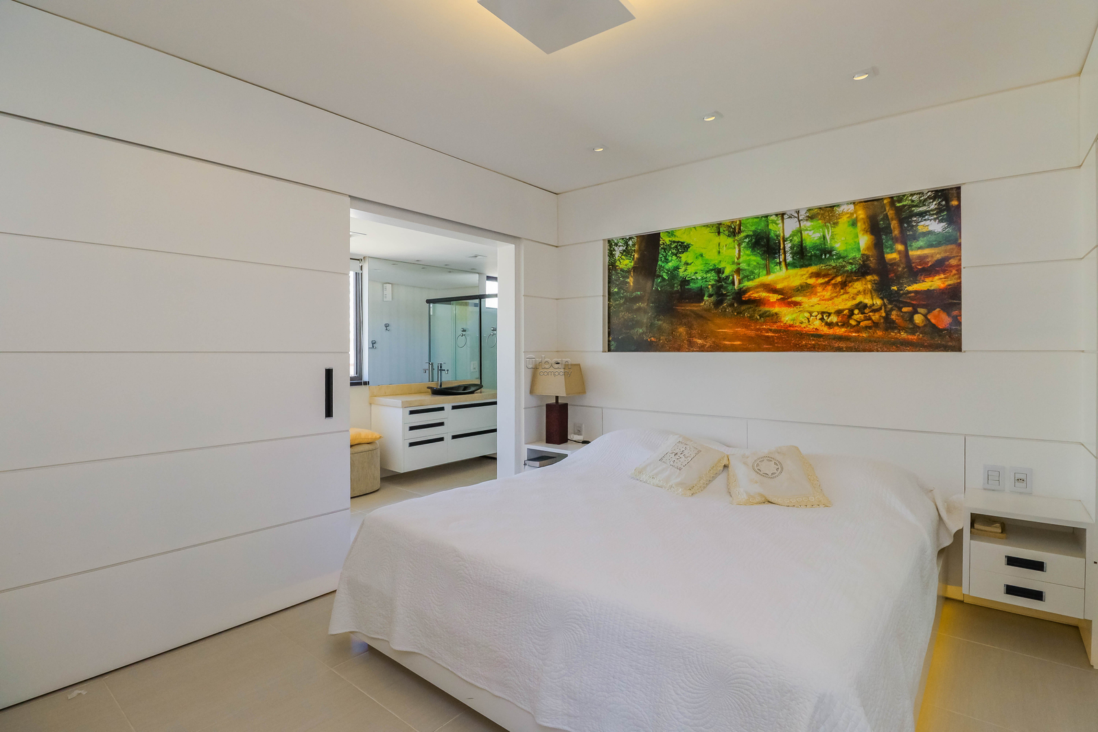 No piso superior está a suíte principal com closet e banheiro amplo com hidromassagem, sala de estar com lareira, terraço com churrasqueira e deck com piscina. 2 vagas de garagem.
