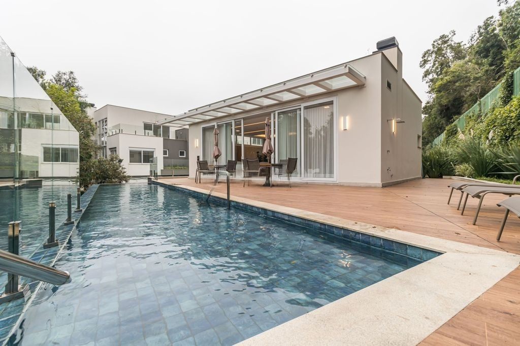 A casa conta com 3 suítes, sendo a suíte master um verdadeiro refúgio, com amplo terraço privativo. O living possui 3 ambientes, perfeito para receber amigos e familiares, e inclui uma aconchegante lareira, lavabo e um espaço gourmet ideal para momentos especiais. A área social é integrada ao pátio privativo, criando um ambiente harmonioso e funcional.