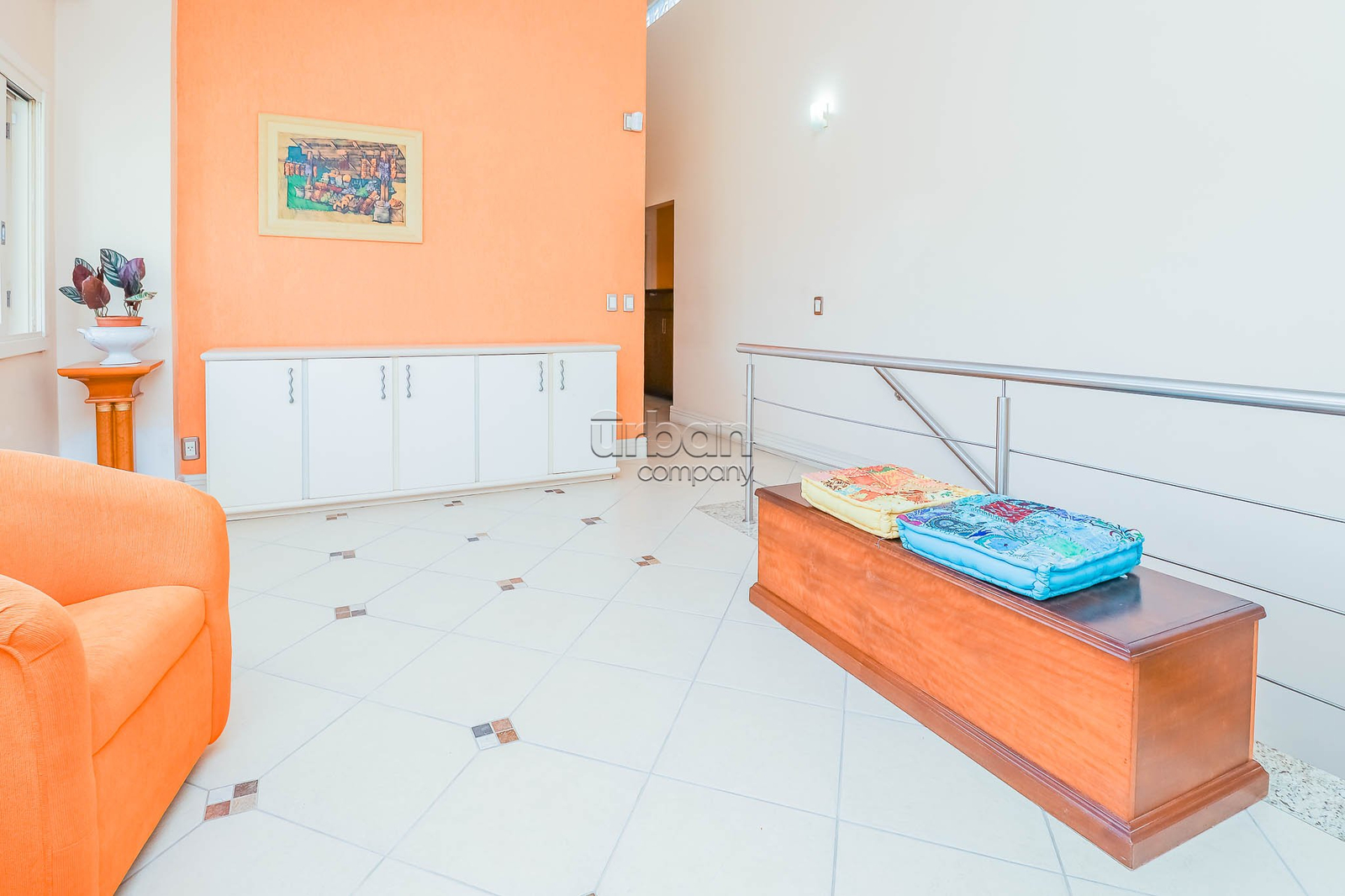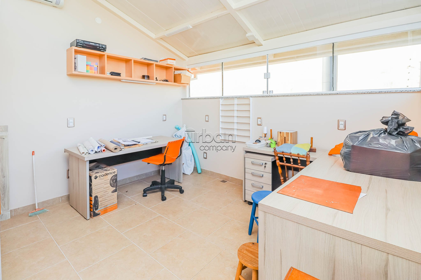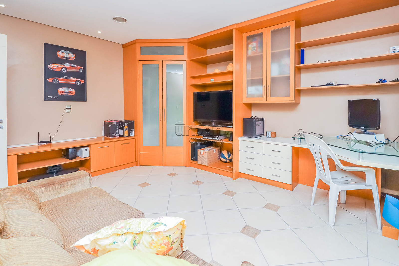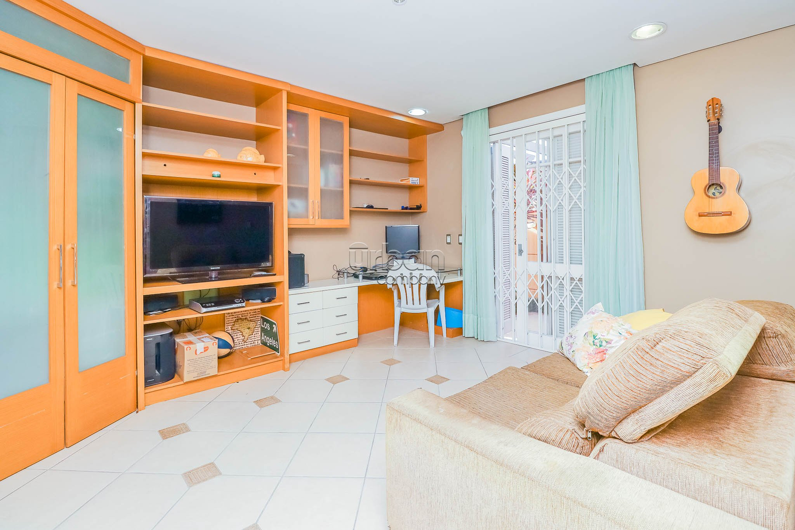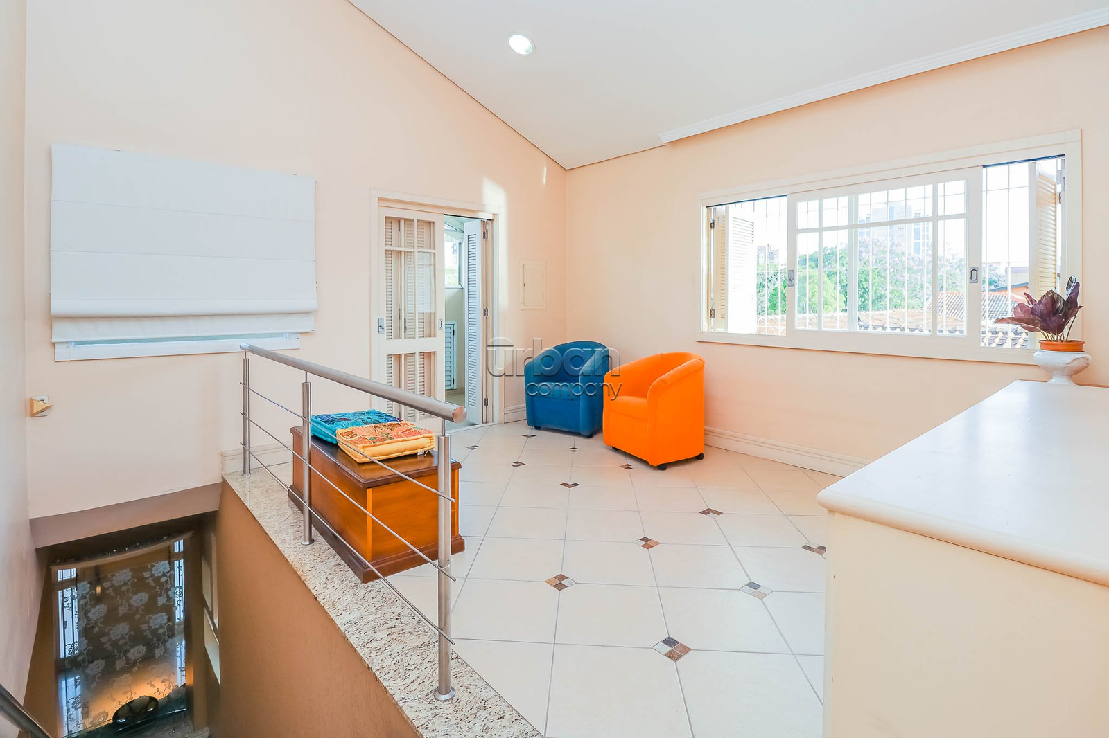 O andar superior abriga a suíte master com closet, banheiro com hidromassagem e sacada externa. Duas suítes estilo americano oferecem conforto adicional, acompanhadas por uma sala íntima e mais um escritório, ideal para quem precisa de um espaço reservado para trabalho ou estudo.