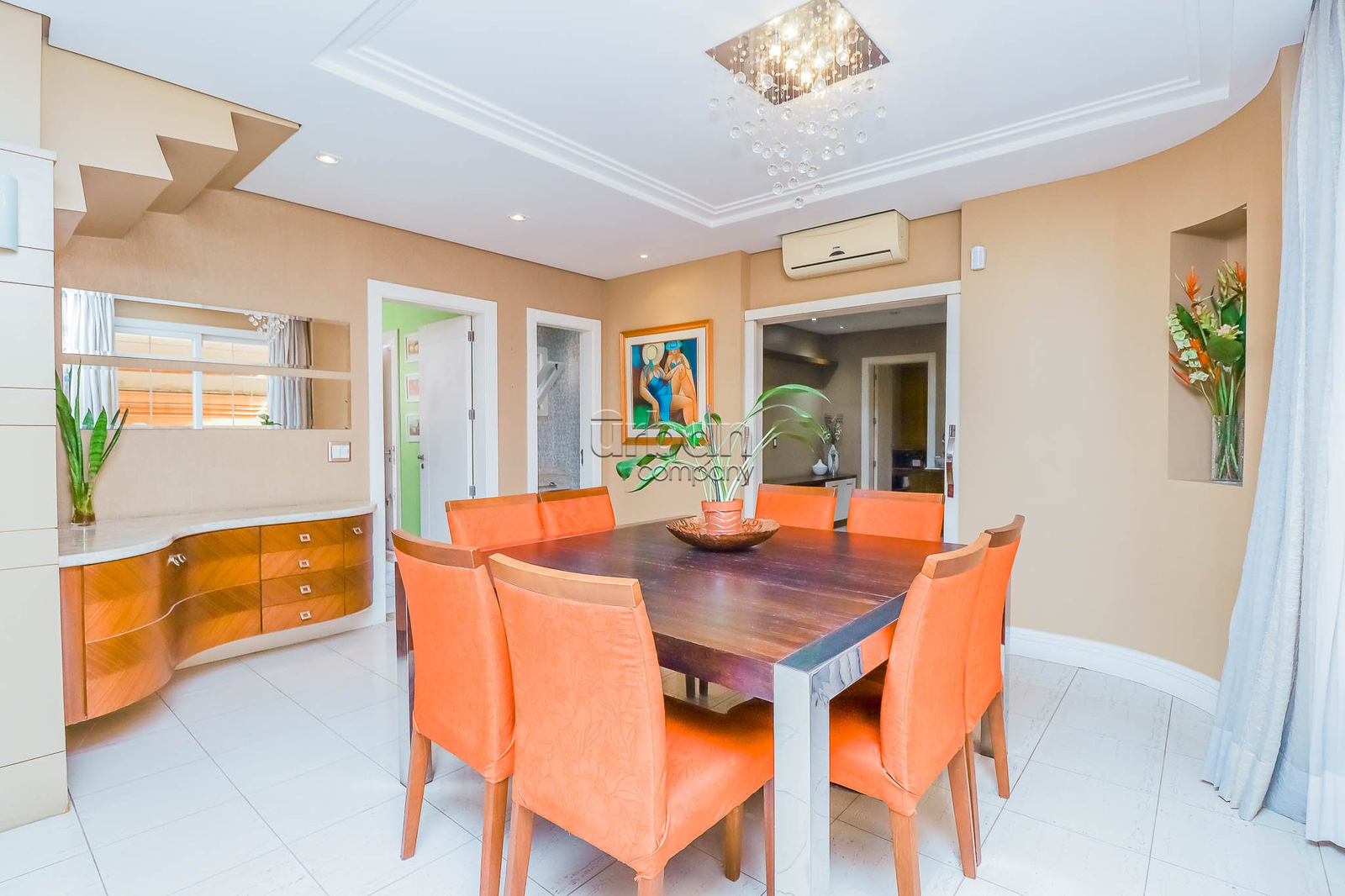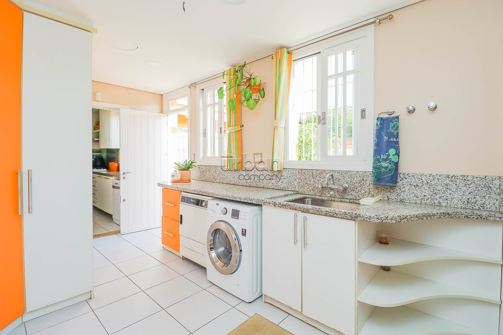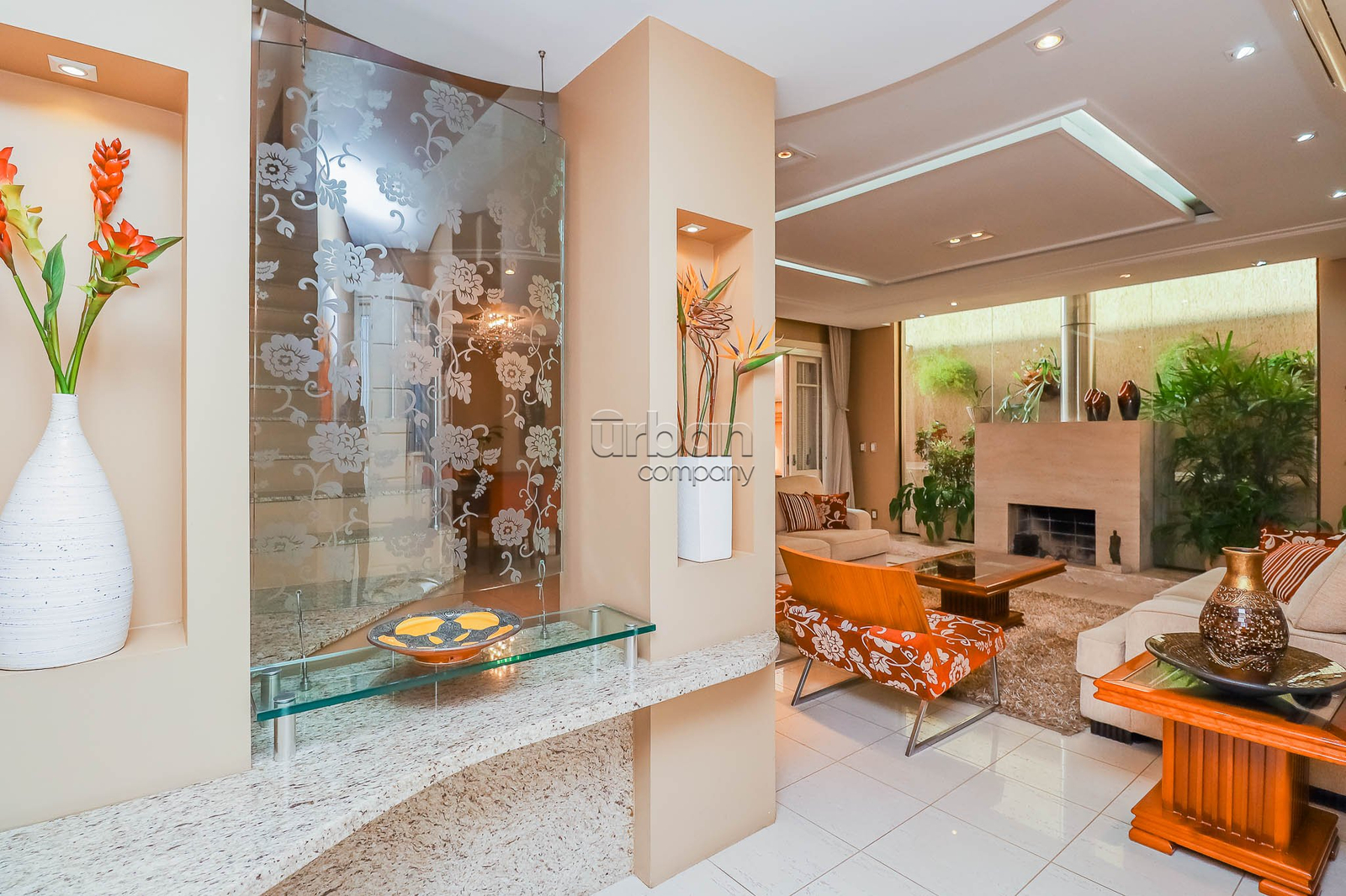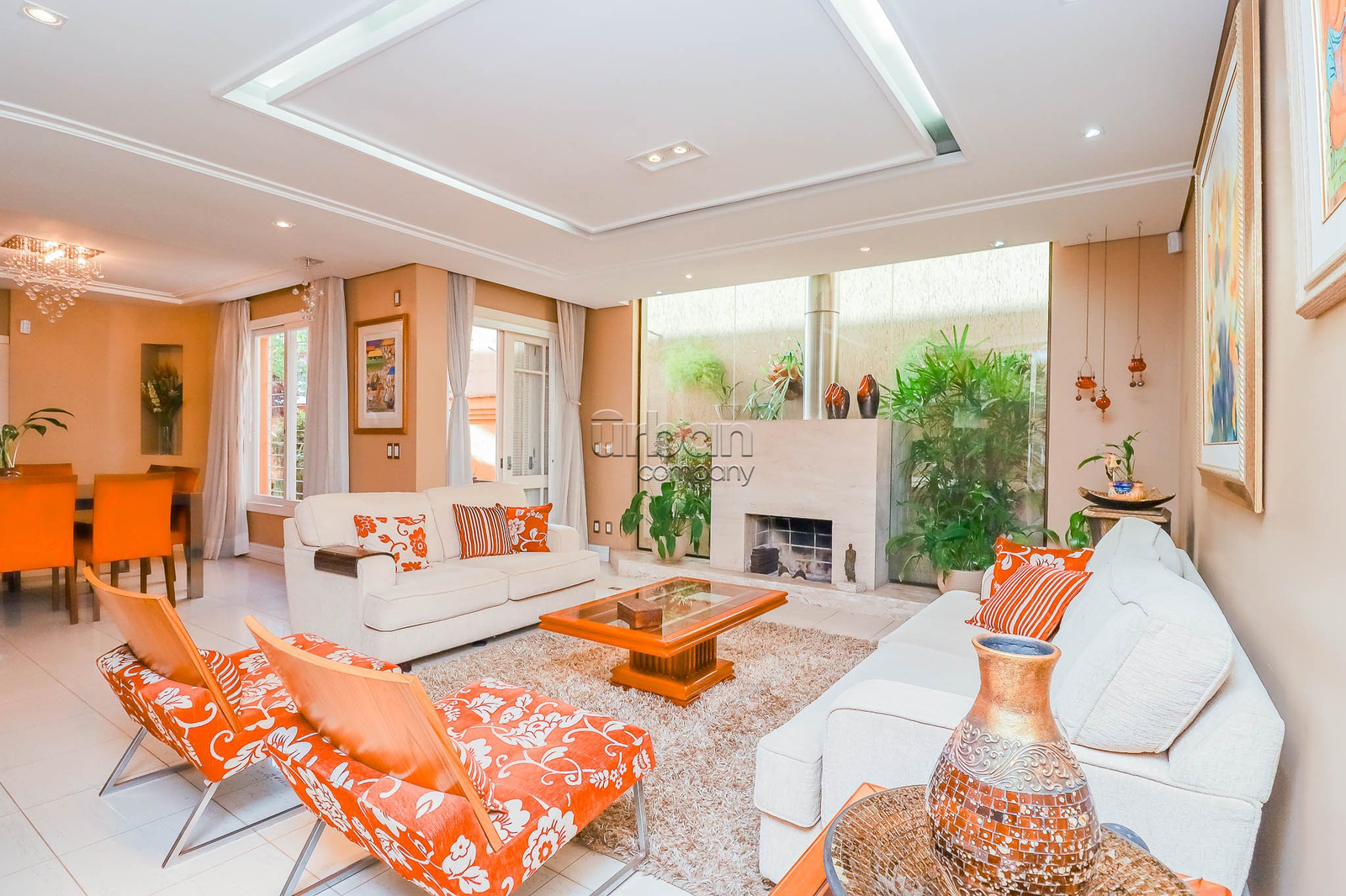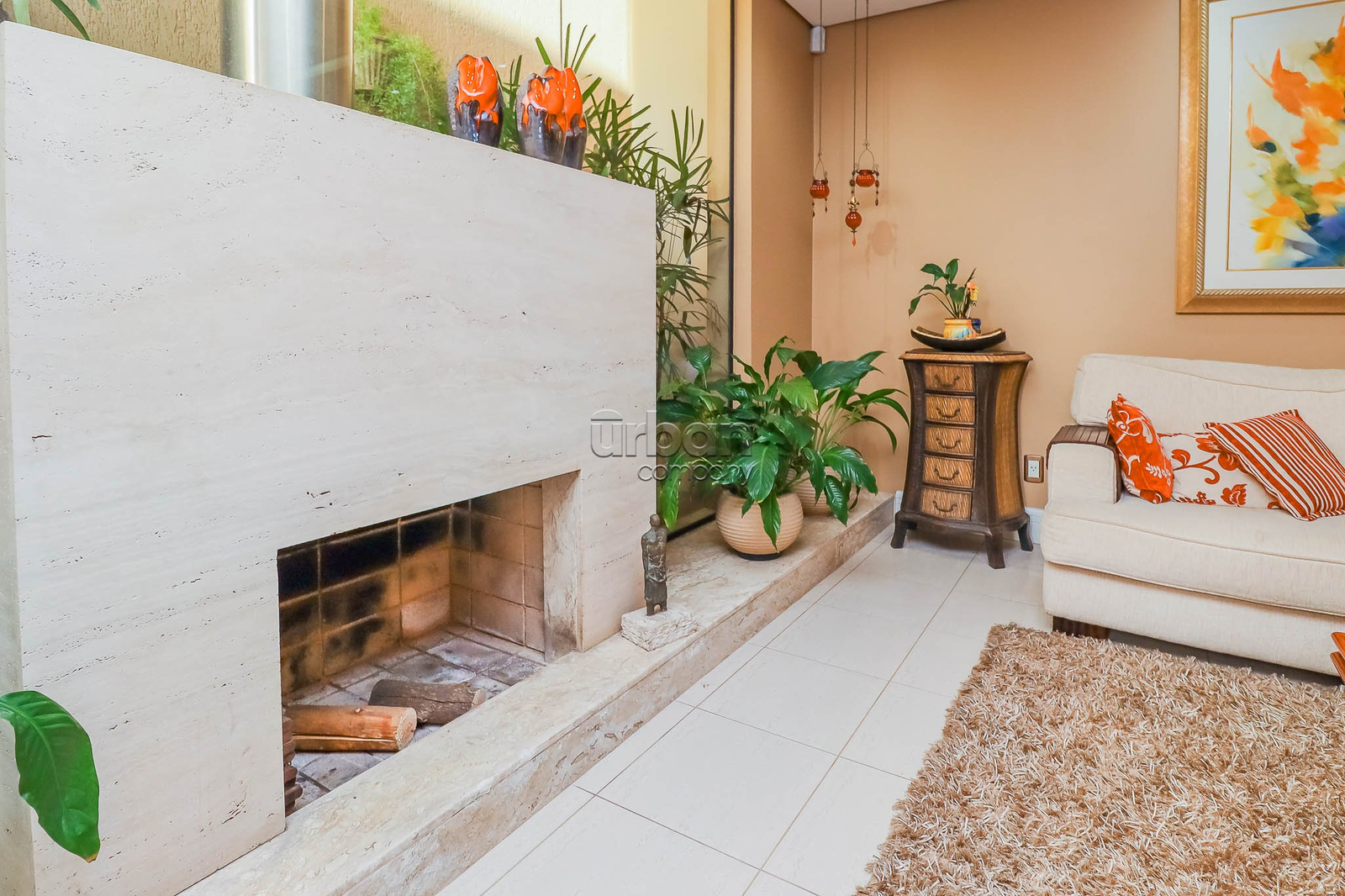 No primeiro pavimento, o living espaçoso para dois ambientes é realçado por uma lareira elegante e um jardim de inverno que traz leveza e tranquilidade. A sala de jantar se conecta à área de estar íntima, ideal para momentos de descanso e entretenimento. Há também um dormitório térreo que pode ser convertido em uma quarta suíte, além de um escritório funcional, cozinha equipada com dependência completa e uma lavanderia ampla.