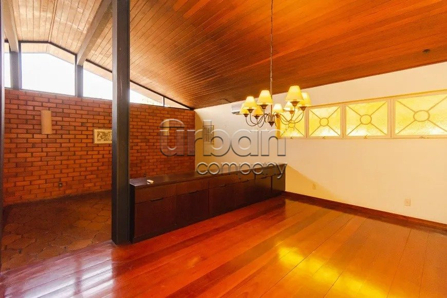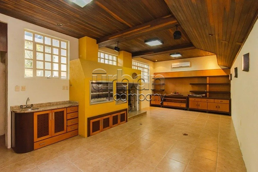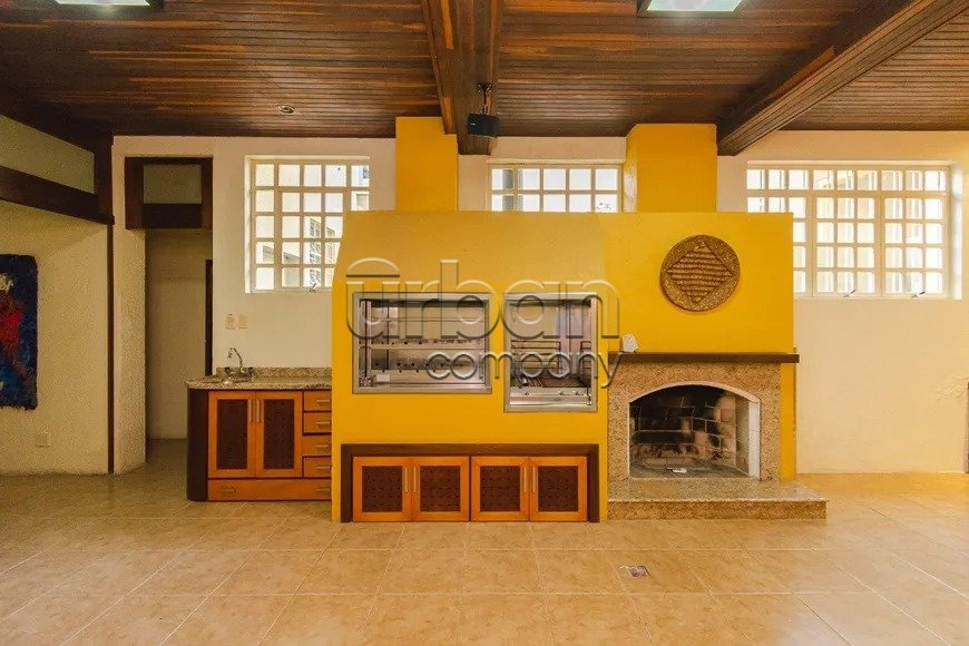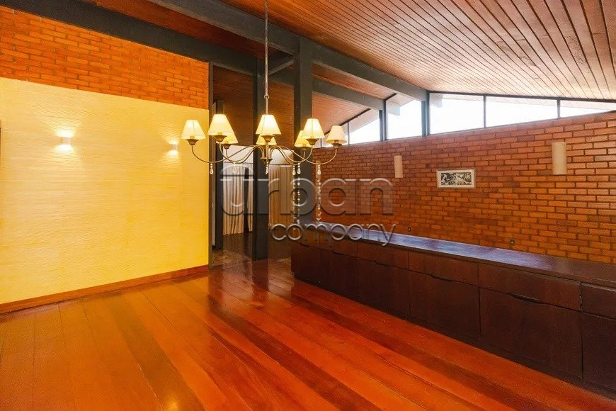 Casa com 400 m² privativos, living para dois ambientes com sala de estar e jantar definida, com churrasqueira.