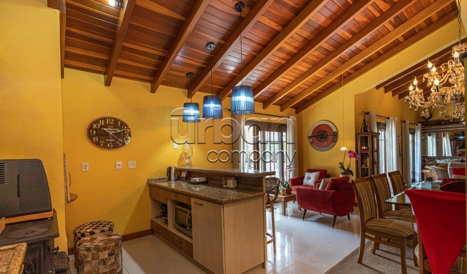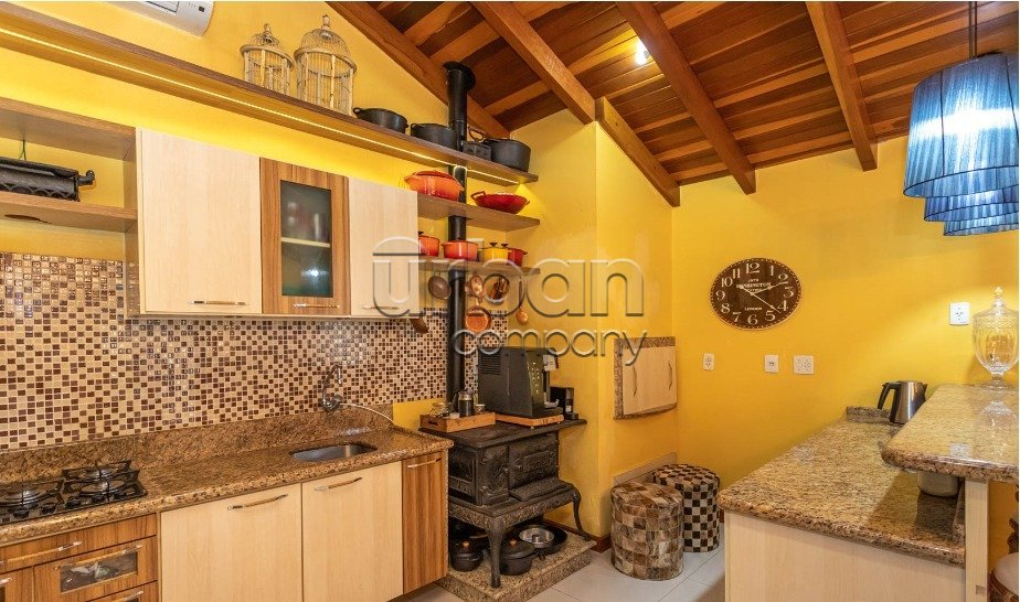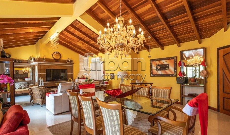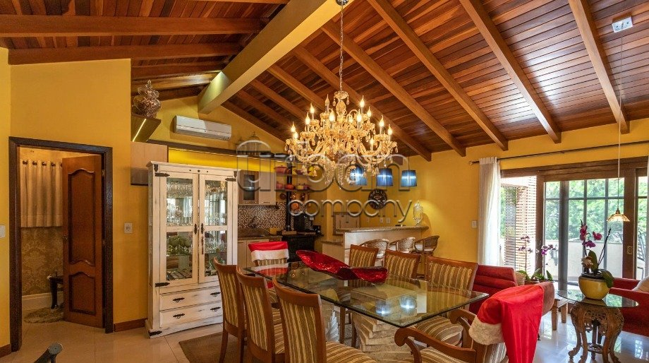 A escada de acesso ao andar superior é revestida em mármore, onde encontramos uma segunda cozinha completa, home theater com lareira e um escritório montado com móveis planejados, além de um lavabo decorado. O teto do andar superior é todo em Ipê, conferindo um toque rústico e sofisticado. O espaço externo oferece um terraço com SPA para oito pessoas, cascata, cromoterapia e hidromassagem, proporcionando máximo conforto para moradores e convidados.