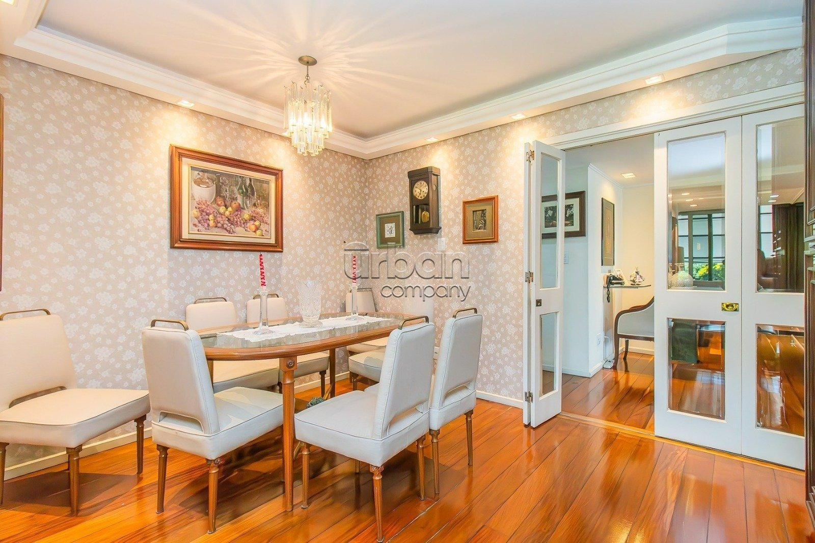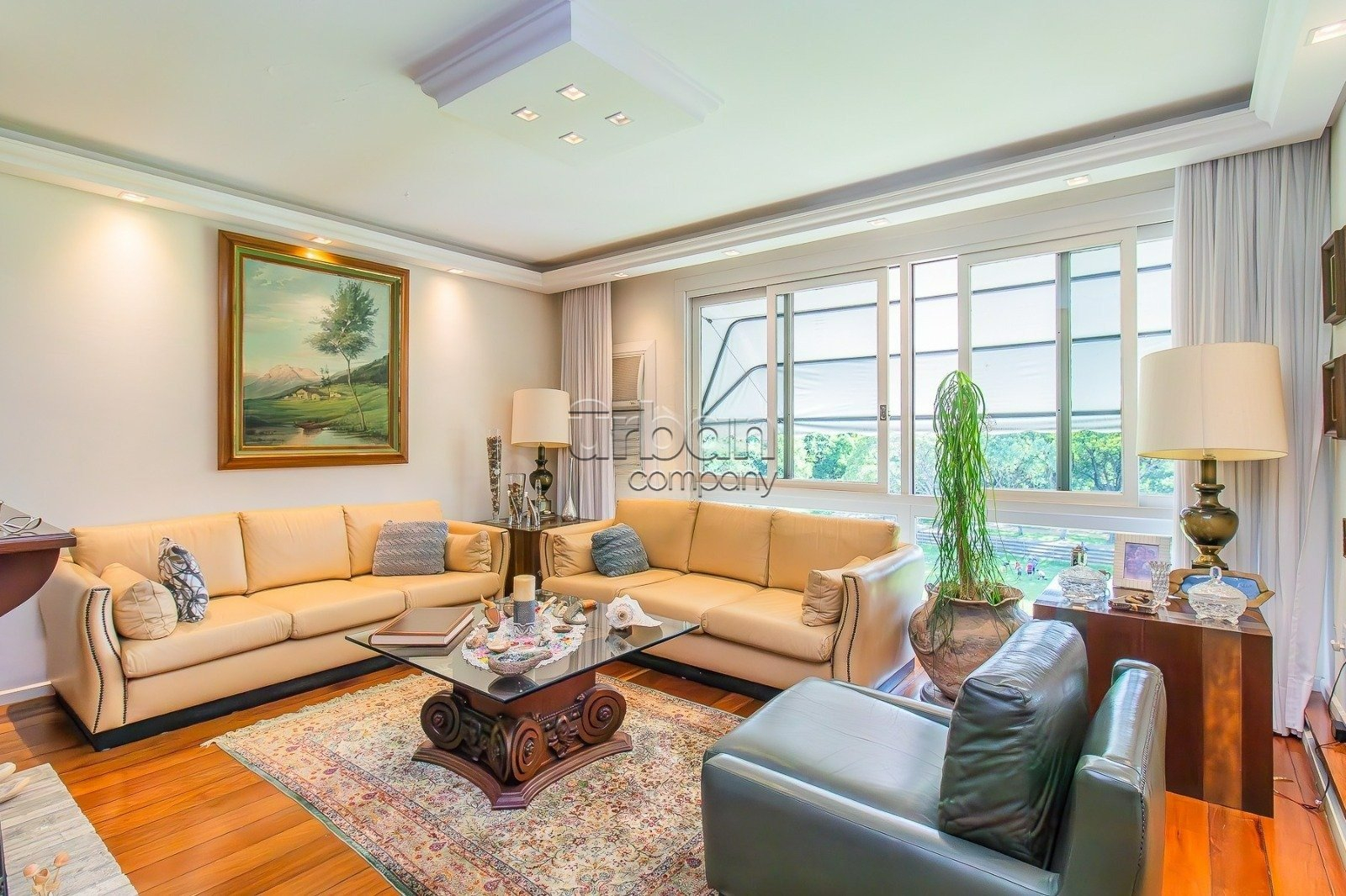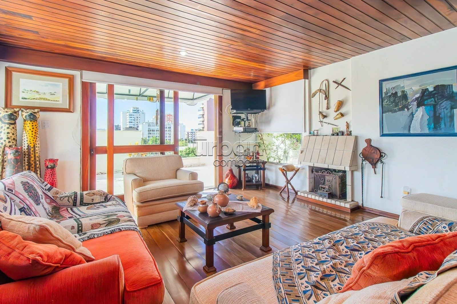 Cobertura com 300 m² de área privativa, composta por living para três ambientes, incluindo sala de estar e jantar bem definidas, lareira, sacada com churrasqueira e uma bela vista para o Parcão.