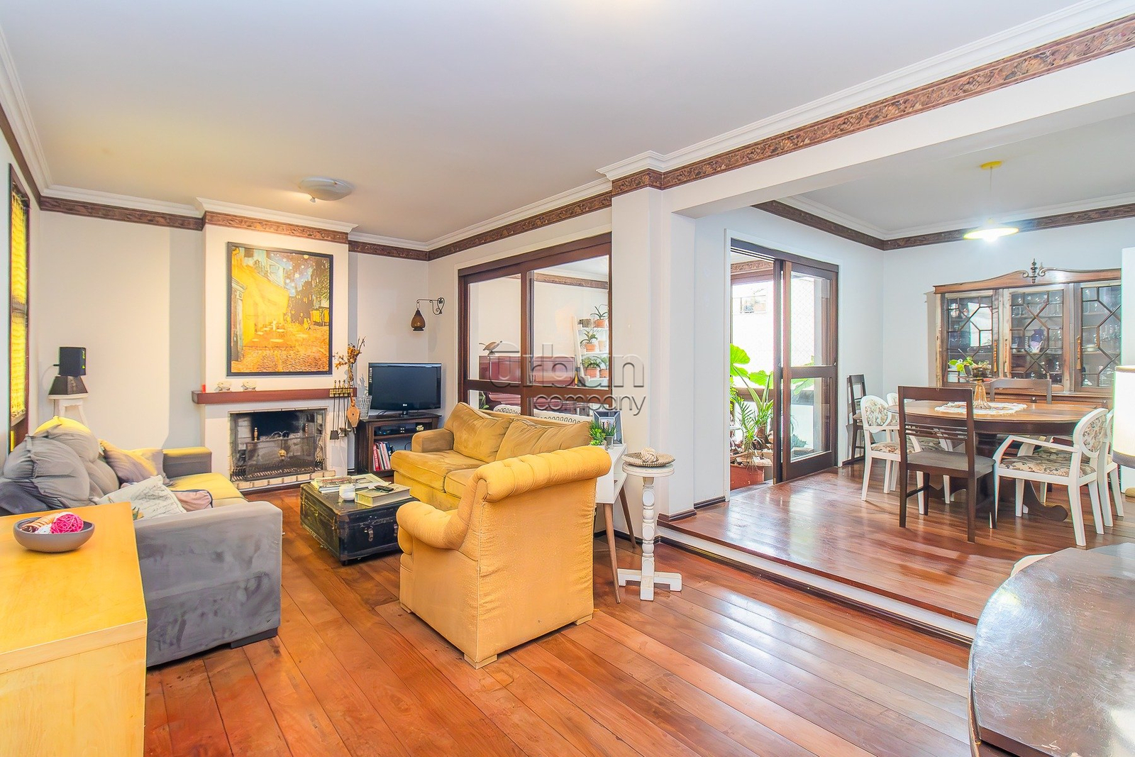 O imóvel principal oferece living em três ambientes com lareira, jardim de inverno, sala de jantar integrada, lavabo, escritório, três dormitórios (incluindo suíte com closet), banheiro social, cozinha espaçosa, área de serviço e dependência completa.