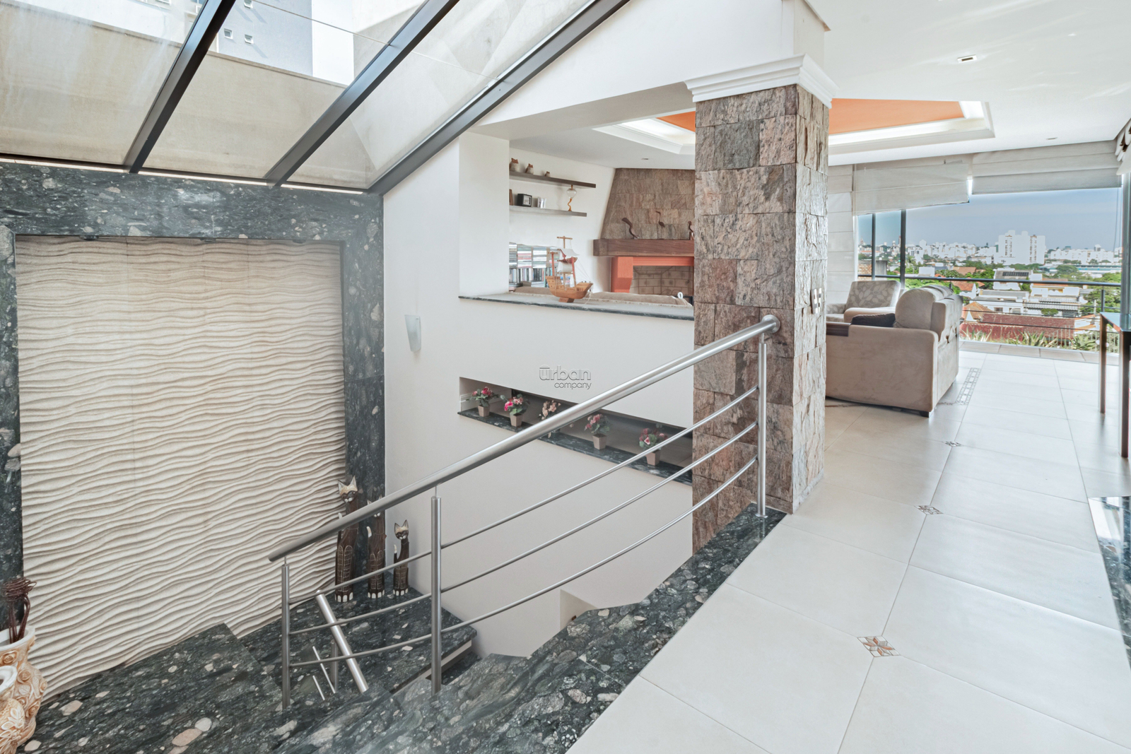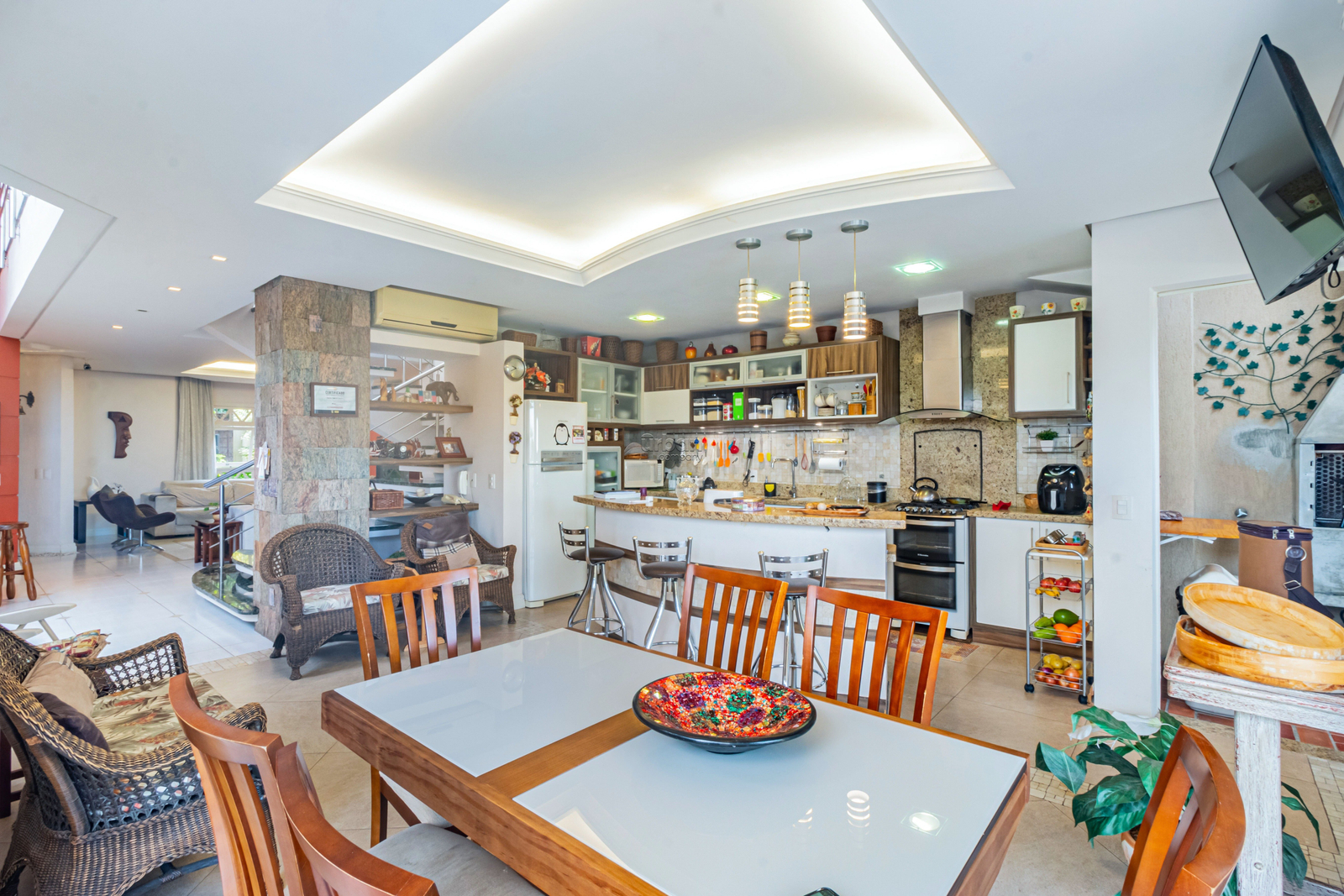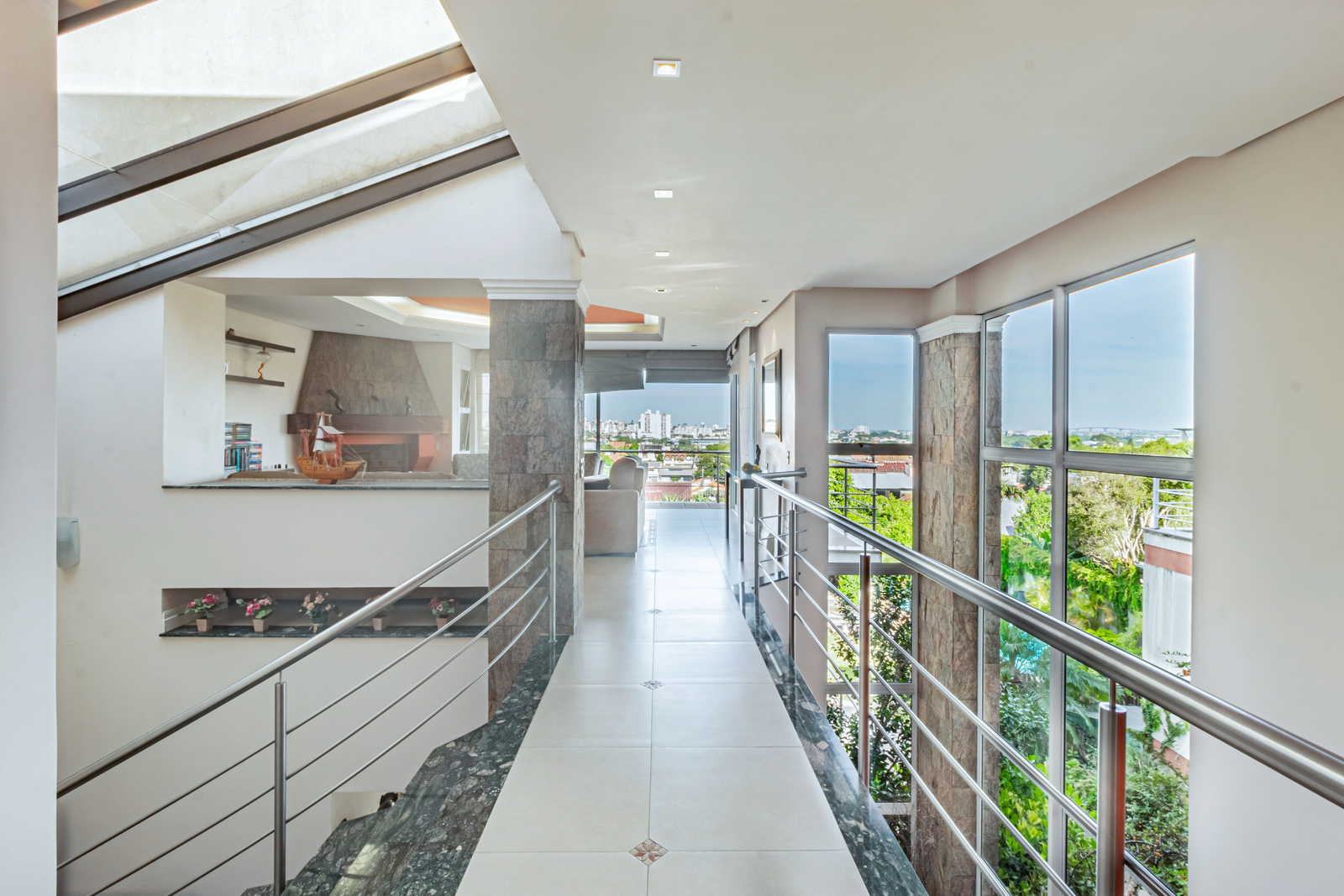 A casa de moradia conta com 315m² de área, living amplo, com pé direito alto, muita luminosidade integrado com cozinha e churrasqueira, lavabo, área de serviço, sacada com vista panorâmica para a cidade, pôr do sol e belíssimo pátio.