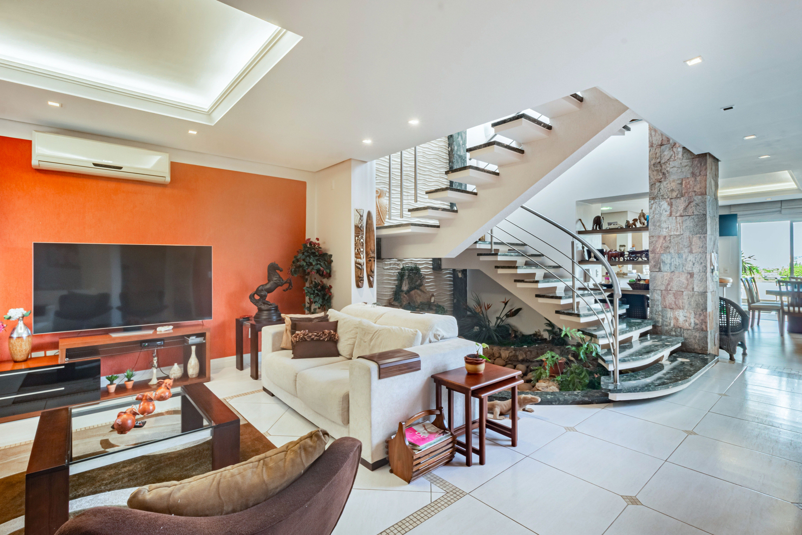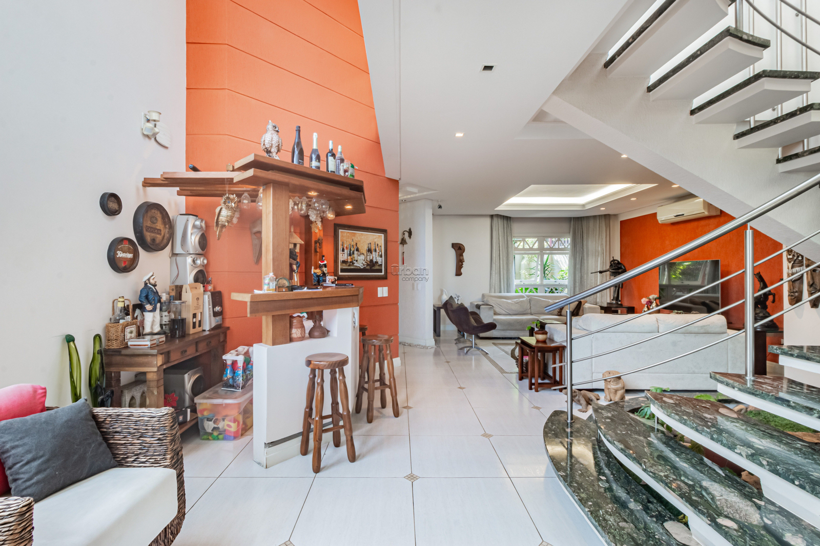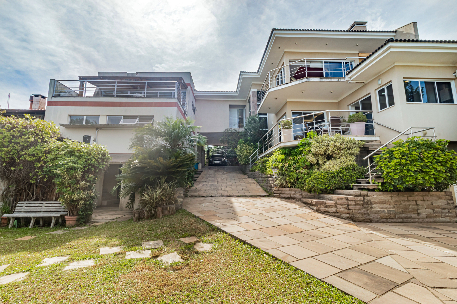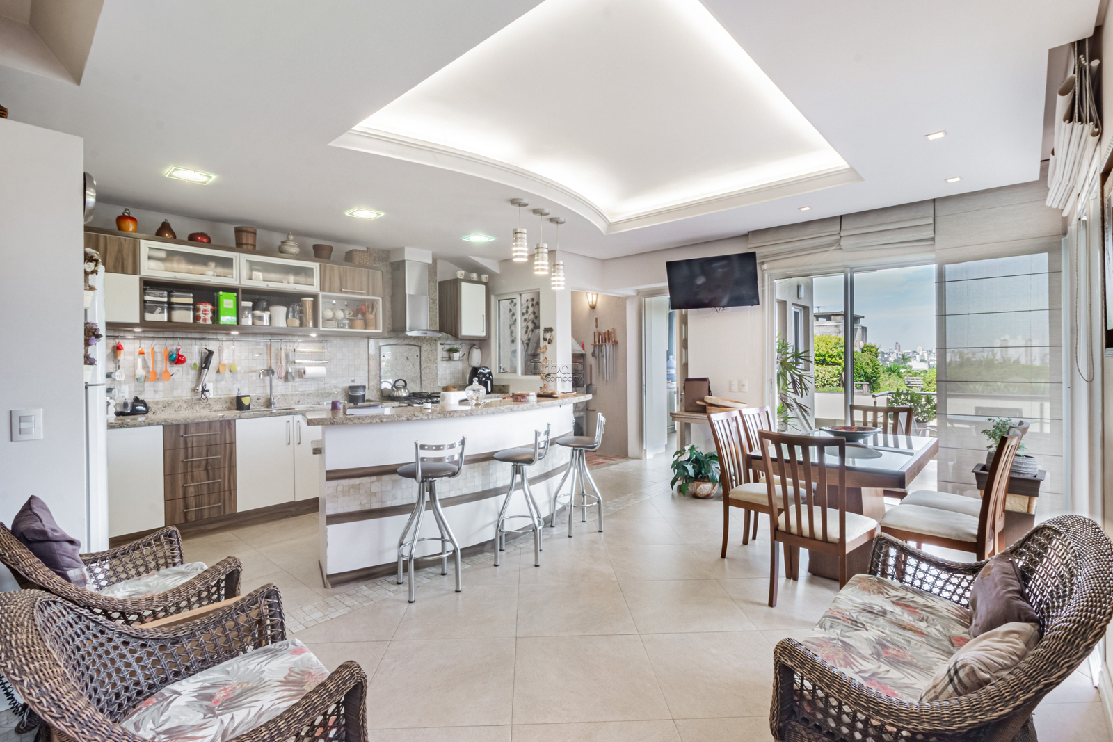 A casa de moradia conta com 315m² de área, living amplo, com pé direito alto, muita luminosidade integrado com cozinha e churrasqueira, lavabo, área de serviço, sacada com vista panorâmica para a cidade, pôr do sol e belíssimo pátio.