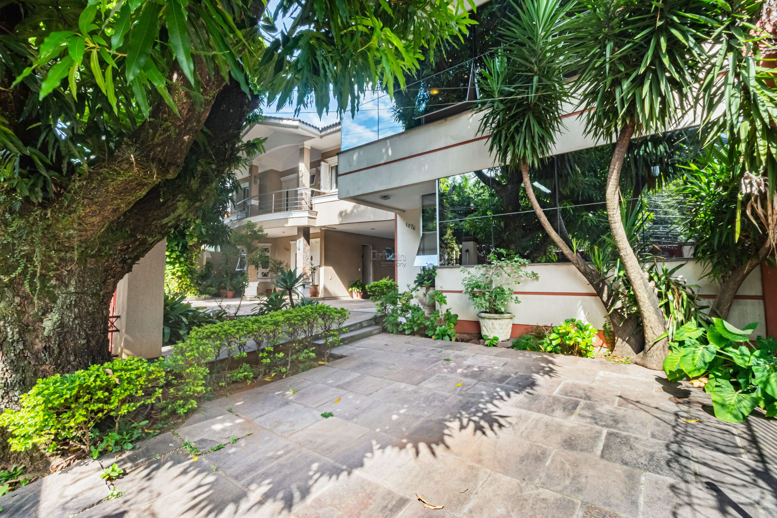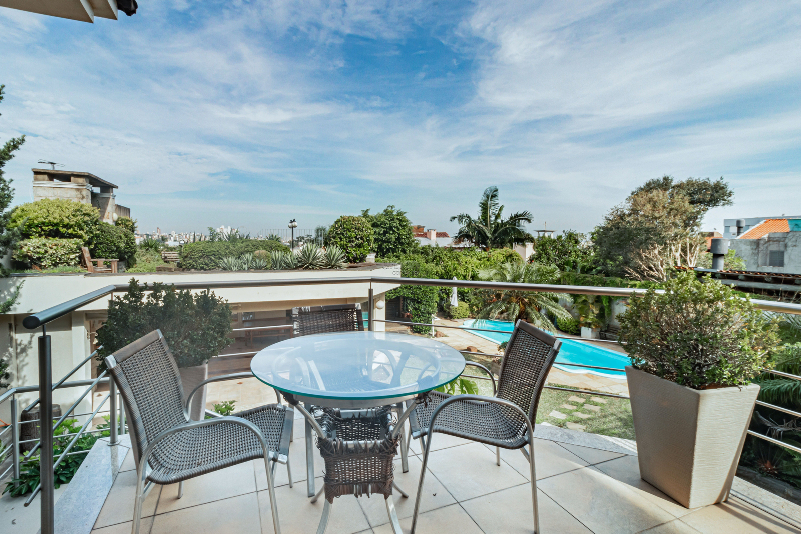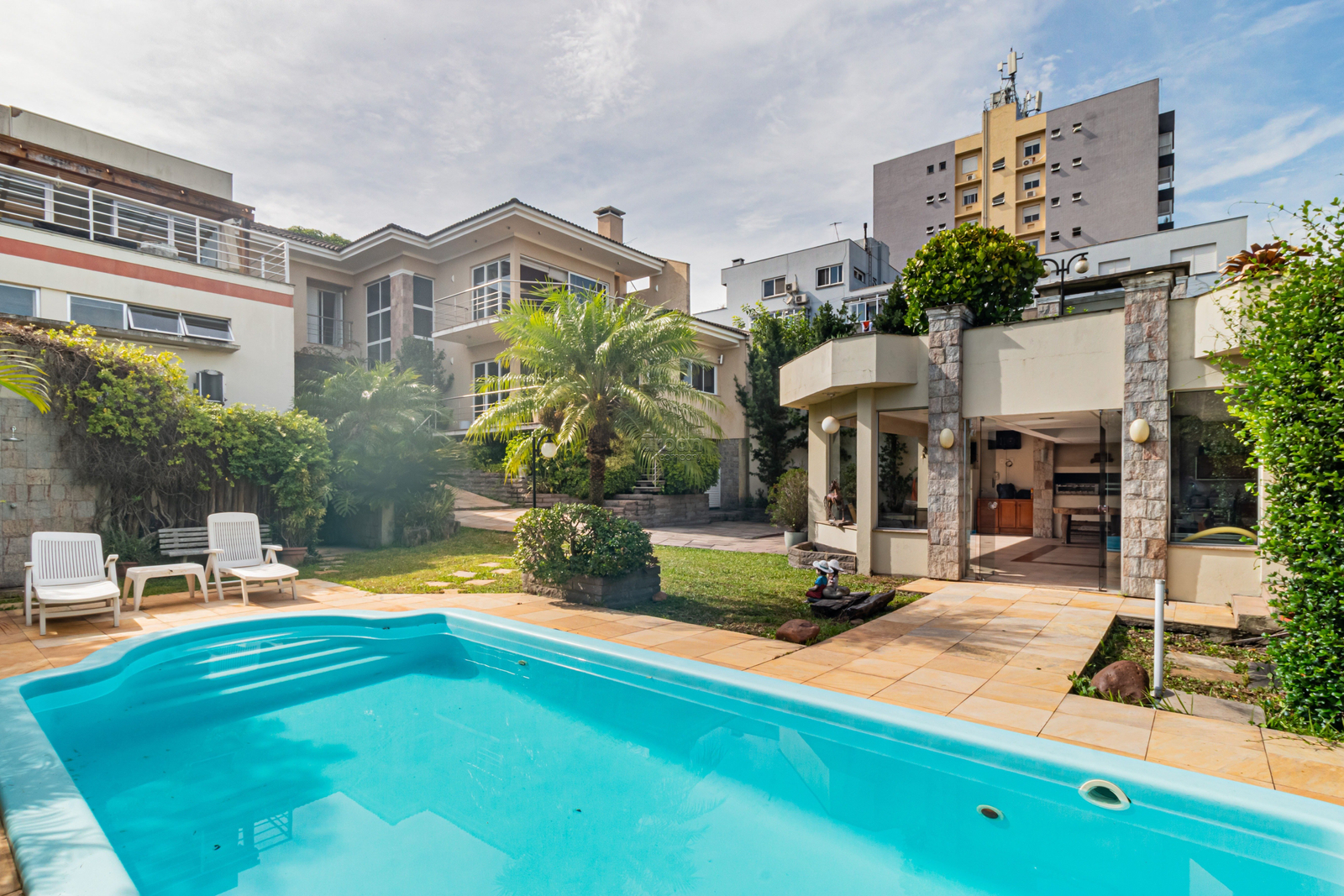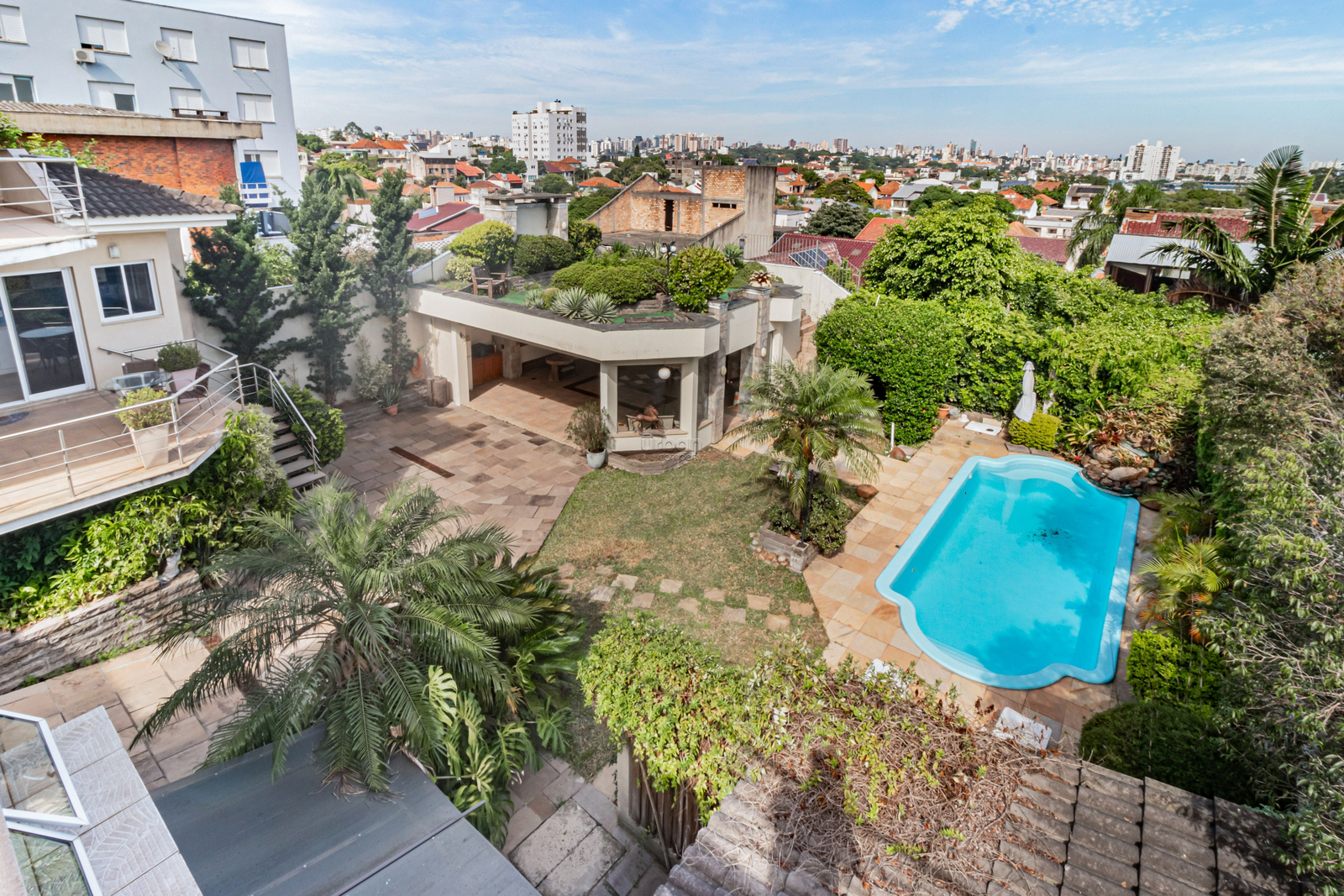 Terraço com churrasqueira e vista panorâmica. O pátio ricamente arborizado, tem piscina e um salão de festas com churrasqueira e telhado verde com mais um espaço de jardim.