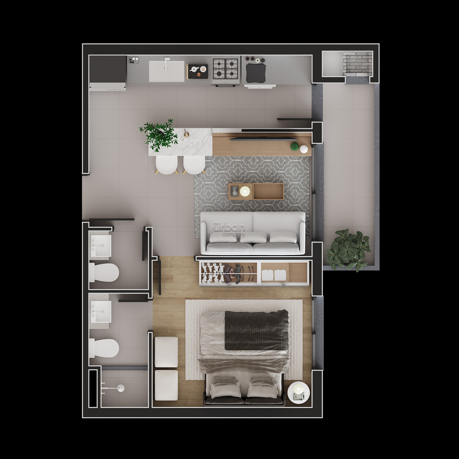 Apartamento com 41 m² privativos, 1 dormitório, 1 suíte, living para dois ambientes com sala de estar e jantar definida e churrasqueira.