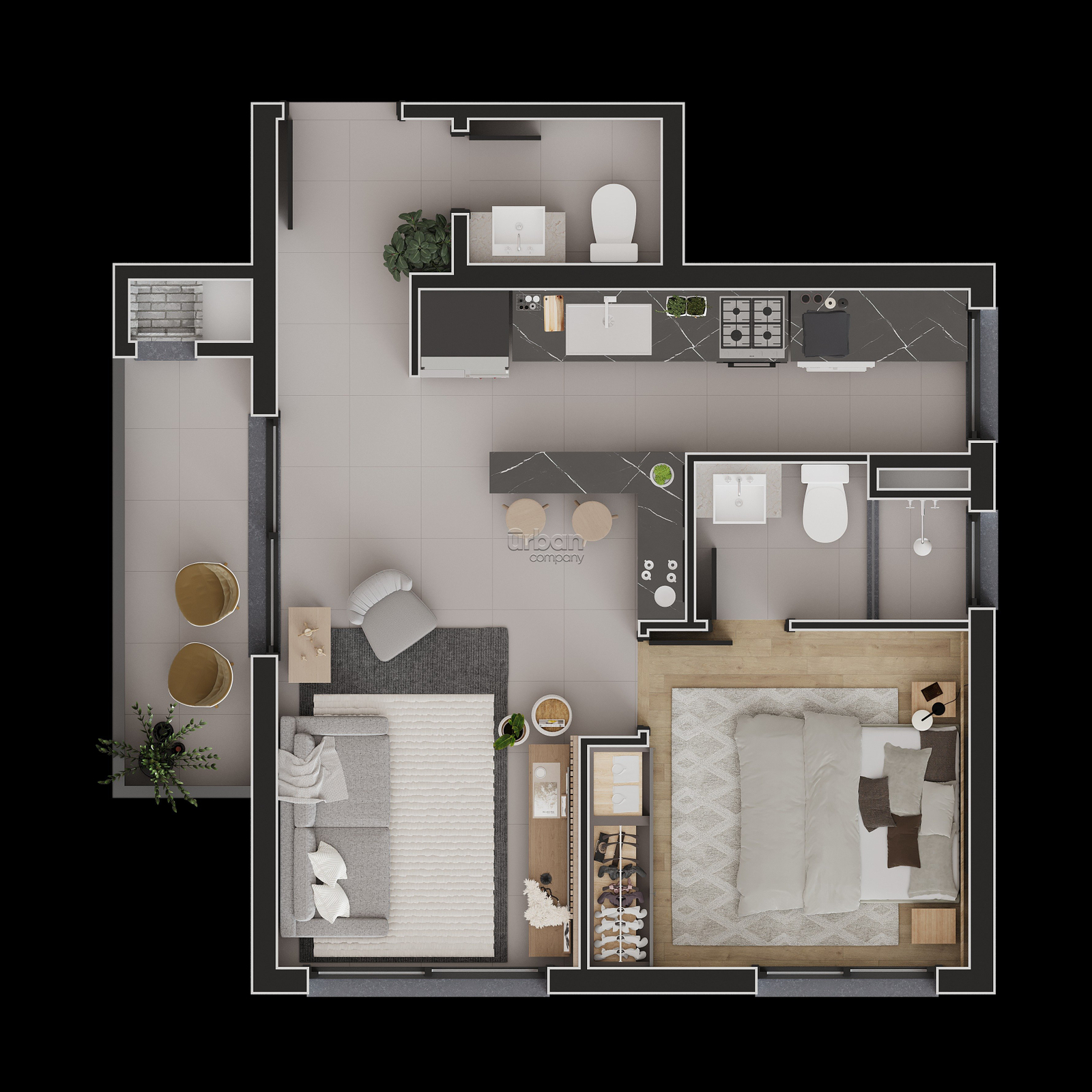 Apartamento com 48 m² privativos, 1 dormitório, 1 suíte, living para dois ambientes com sala de estar e jantar definida e churrasqueira.