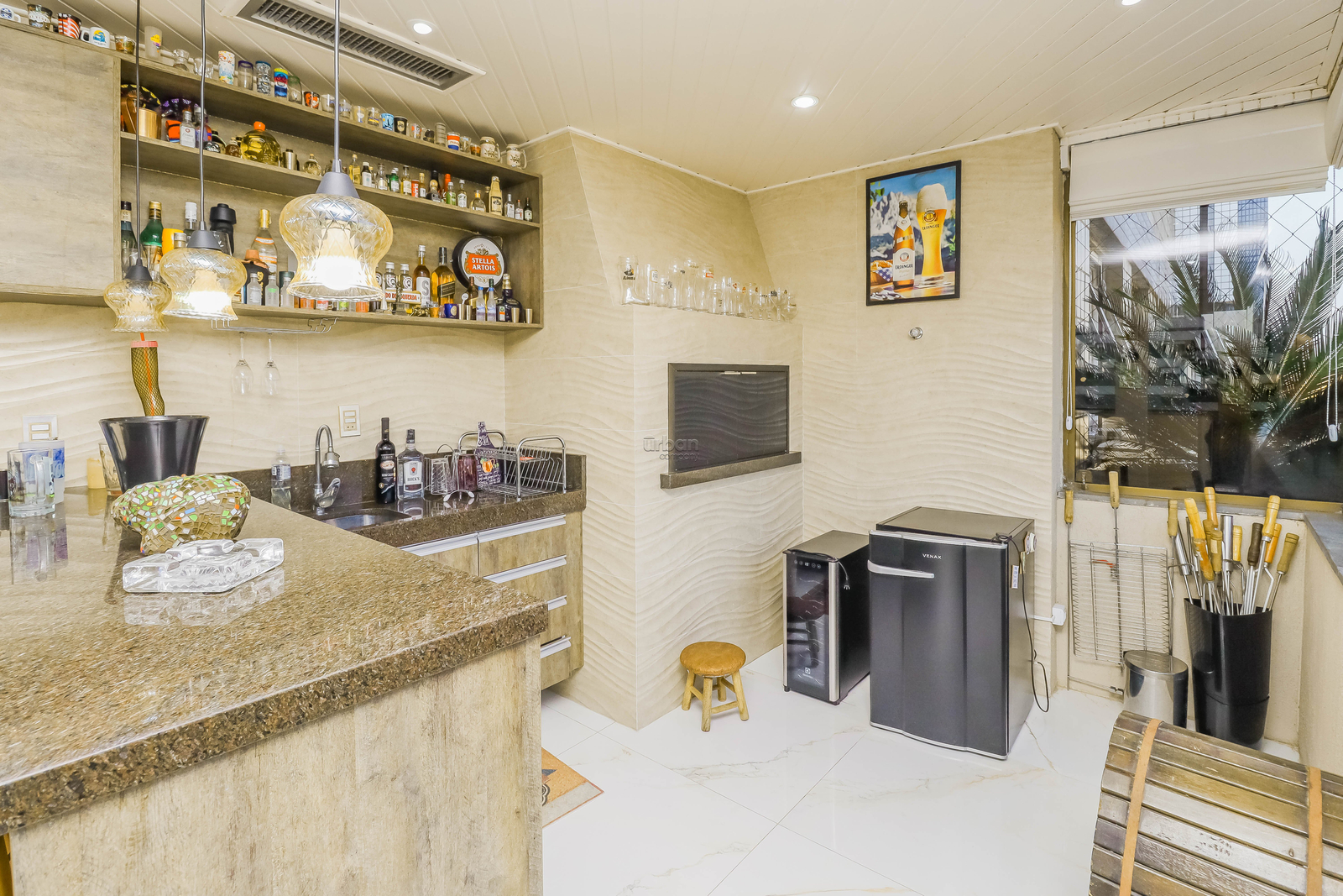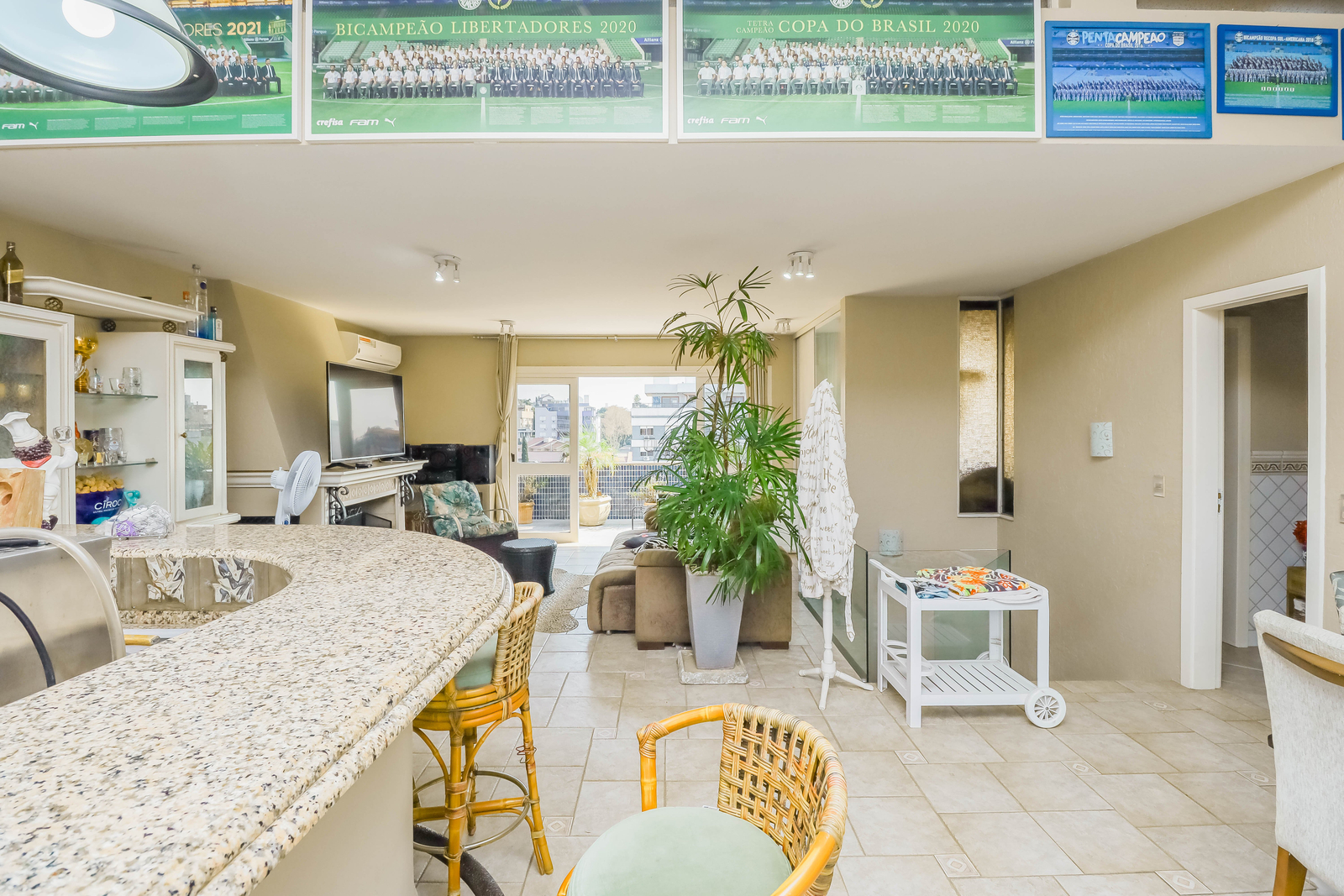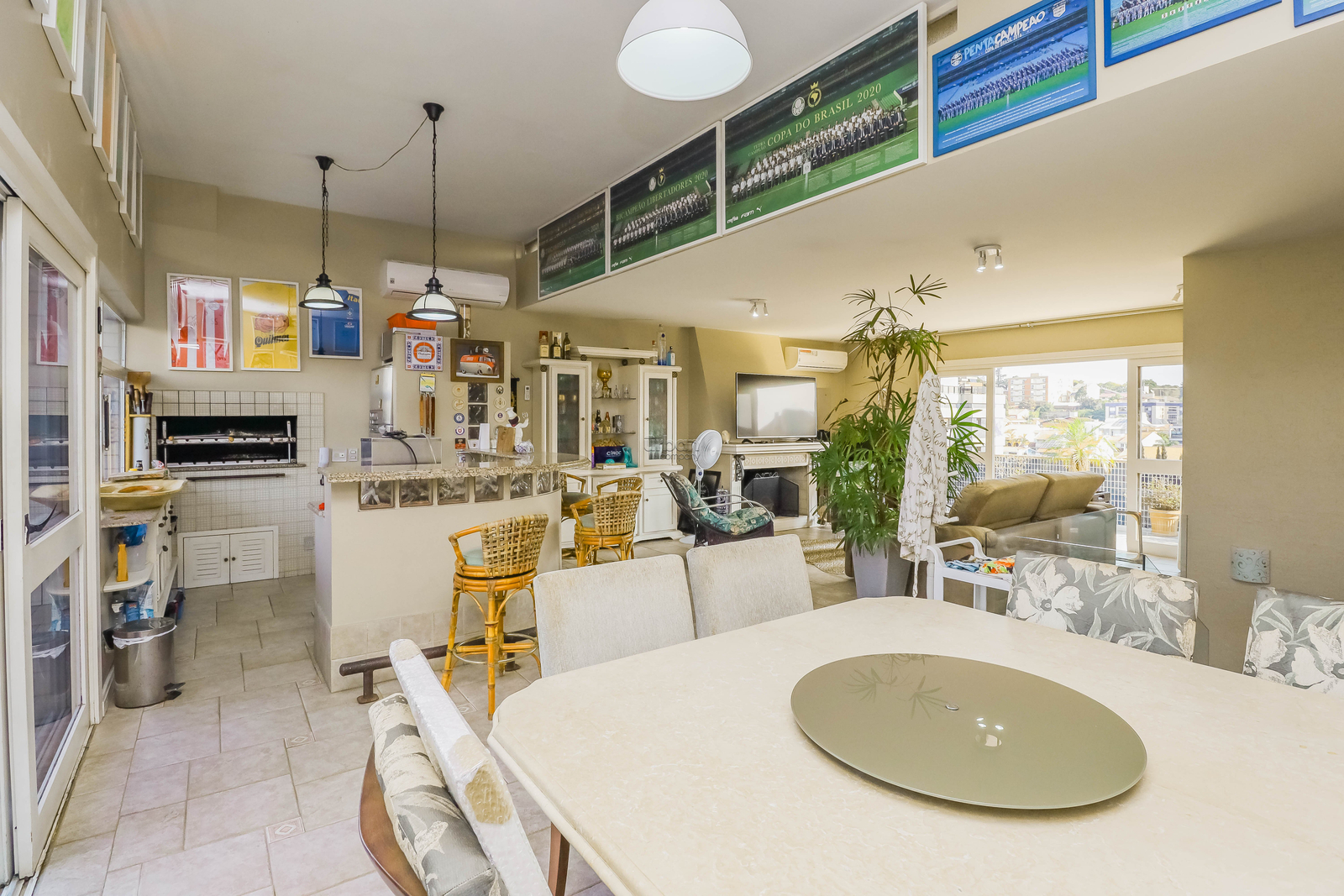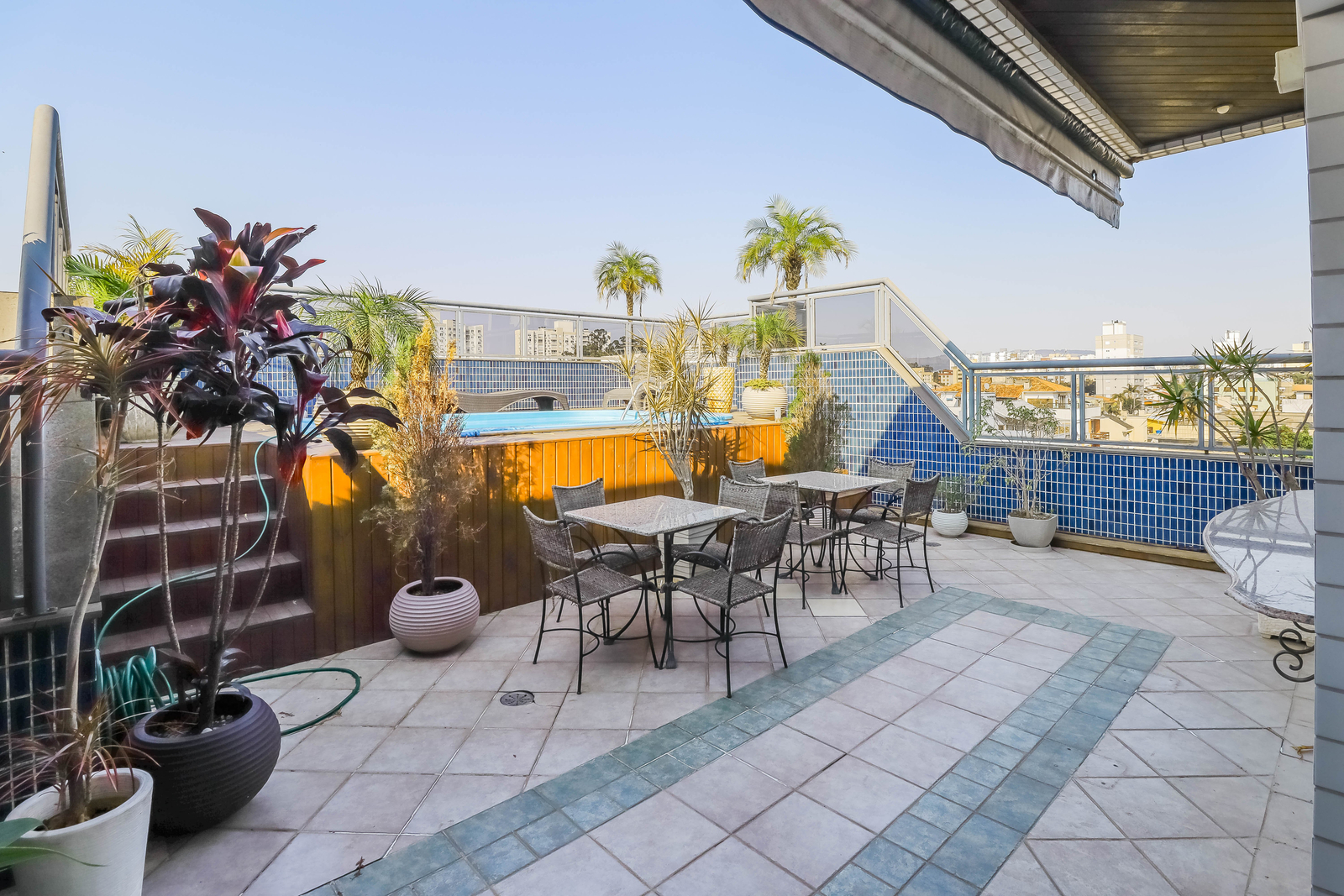 A cobertura possui 414 m² privativos, semimobiliada, 4 dormitórios sendo 1 suíte master com sacada, ampla sala de estar com lareira e sacada, sala de jantar com espaço gourmet com churrasqueira, cozinha montada e lavanderia.