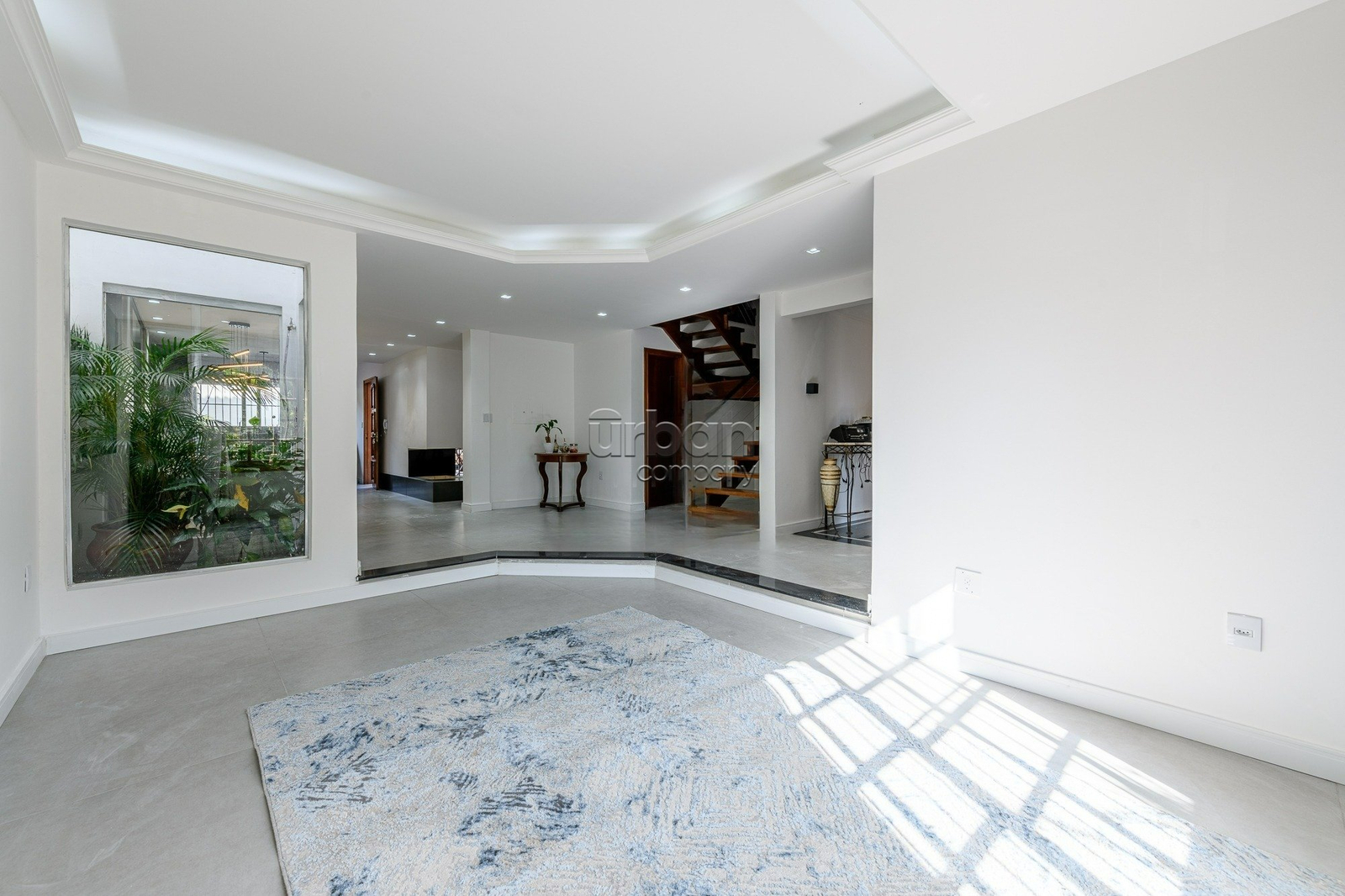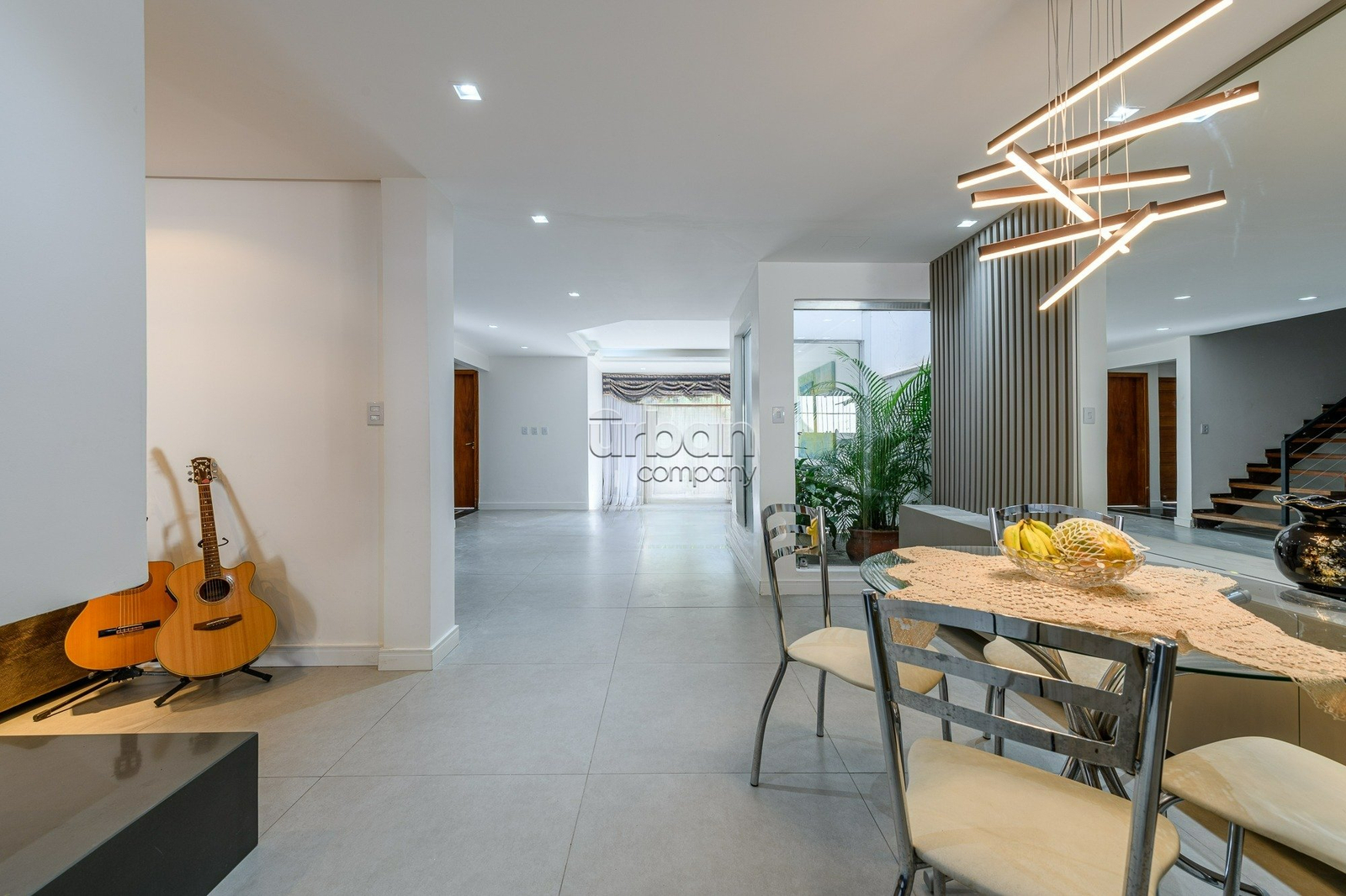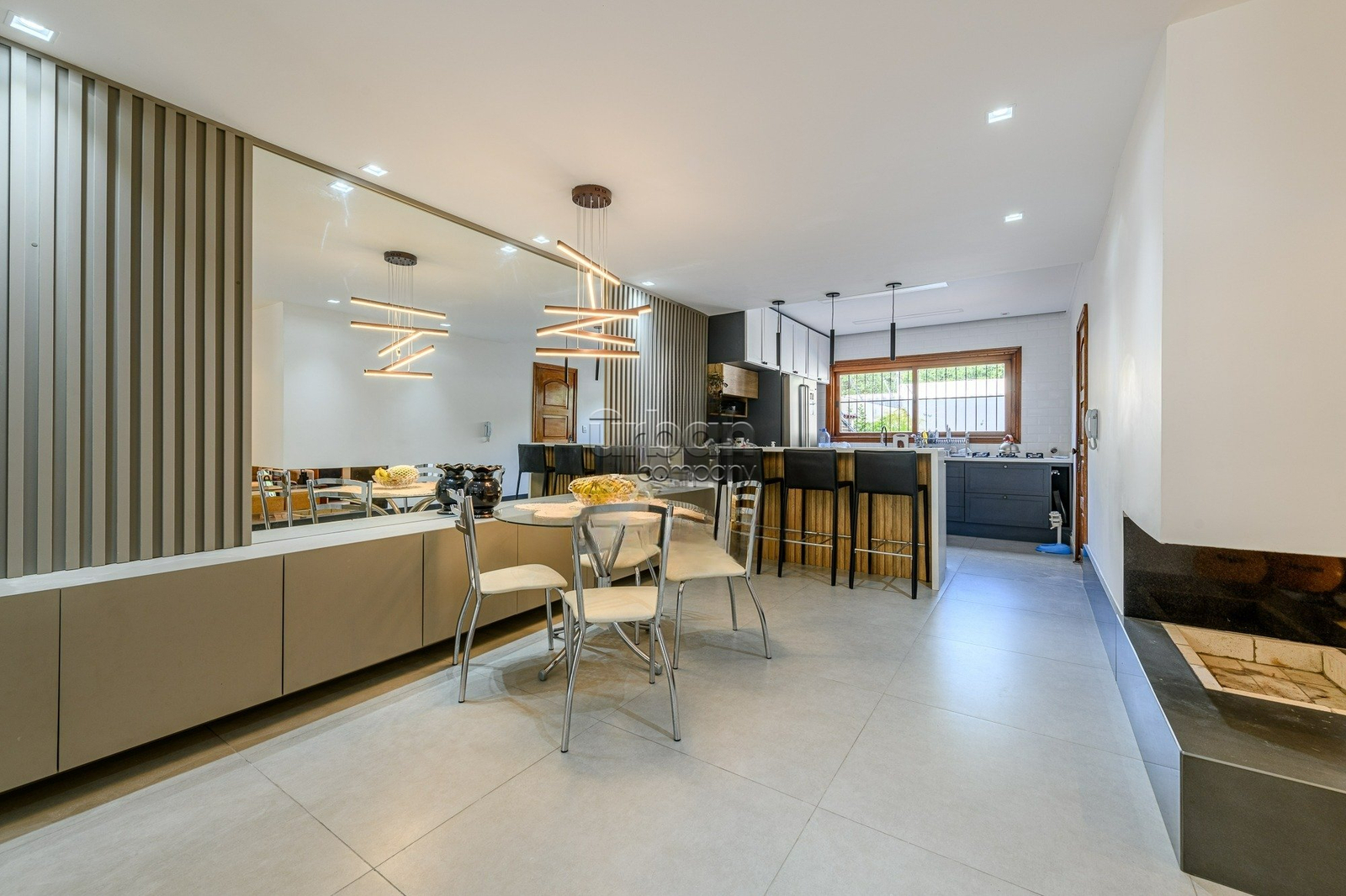 Casa semimobiliada com 310 m², hall de entrada, ampla área social com living para 3 ambientes, gabinete, sala de estar íntimo com lareira, jardim de inverno, sala jantar integrada a cozinha planejada, lavanderia, dependência de empregada, banheiro auxiliar.