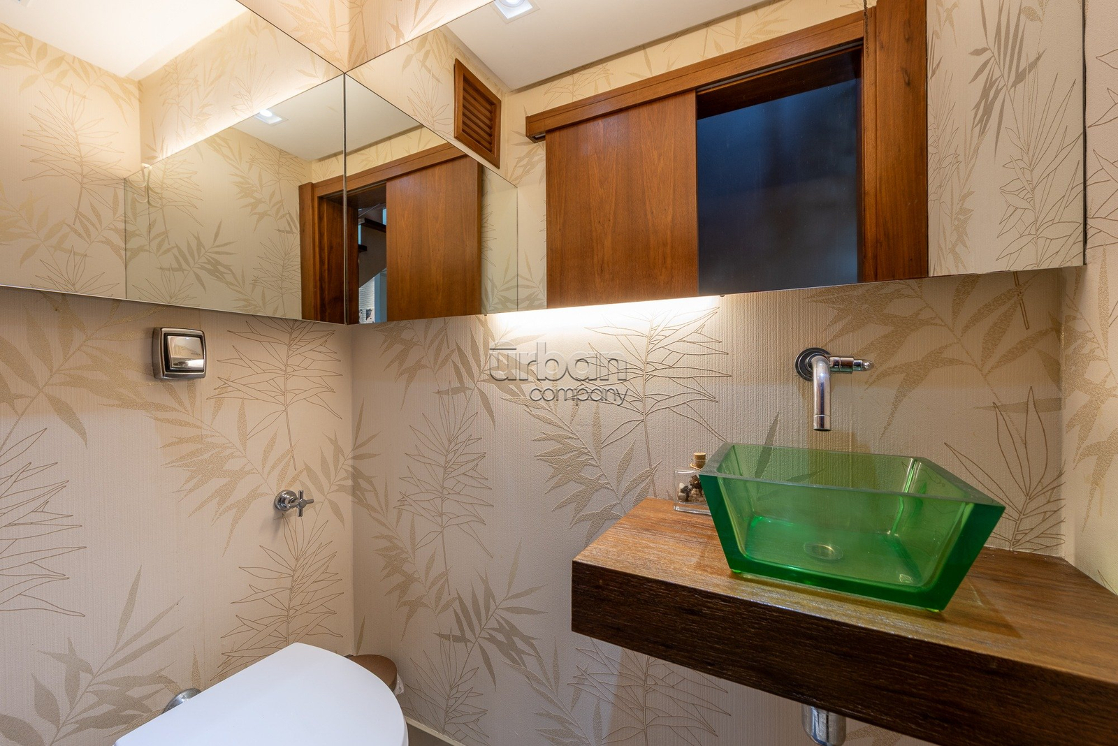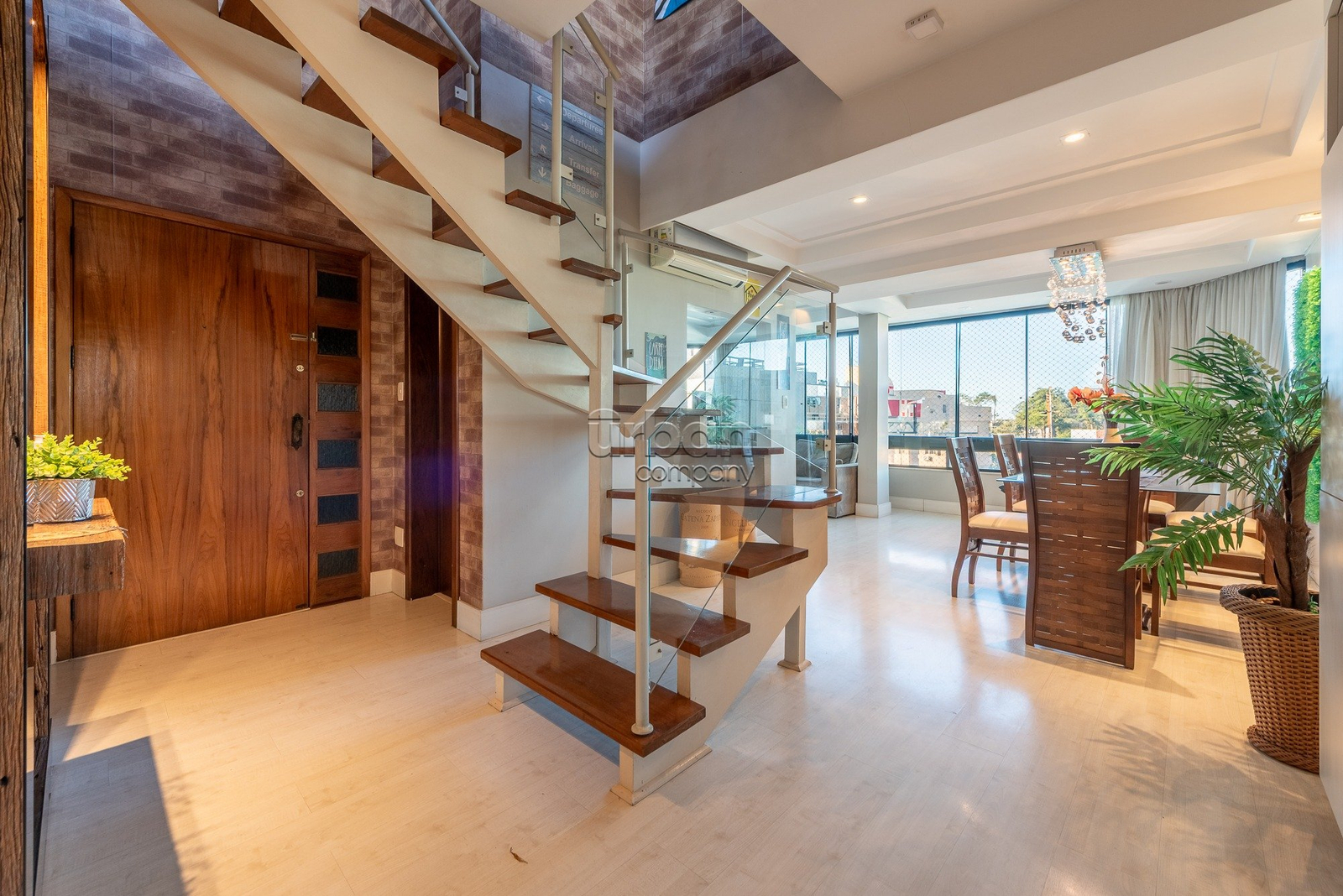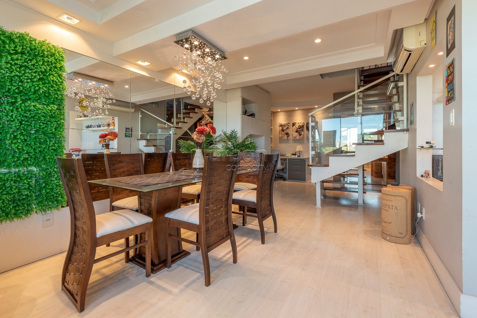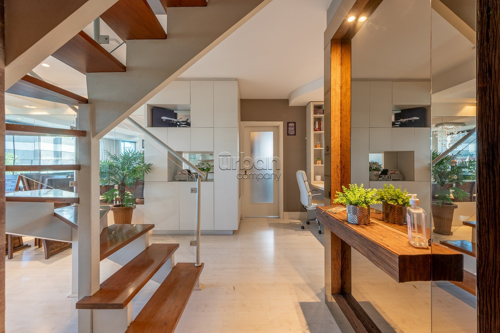 No primeiro pavimento, o imóvel conta com um lavabo, uma sala de jantar, um home office, uma sala de estar e TV, uma cozinha equipada, uma lavanderia, dependência de empregada com entrada de serviço, uma despensa, um banheiro extra, dois dormitórios e uma suíte master com closet. Todos os ambientes possuem acabamentos refinados, teto em gesso e móveis planejados, garantindo um espaço elegante e funcional.