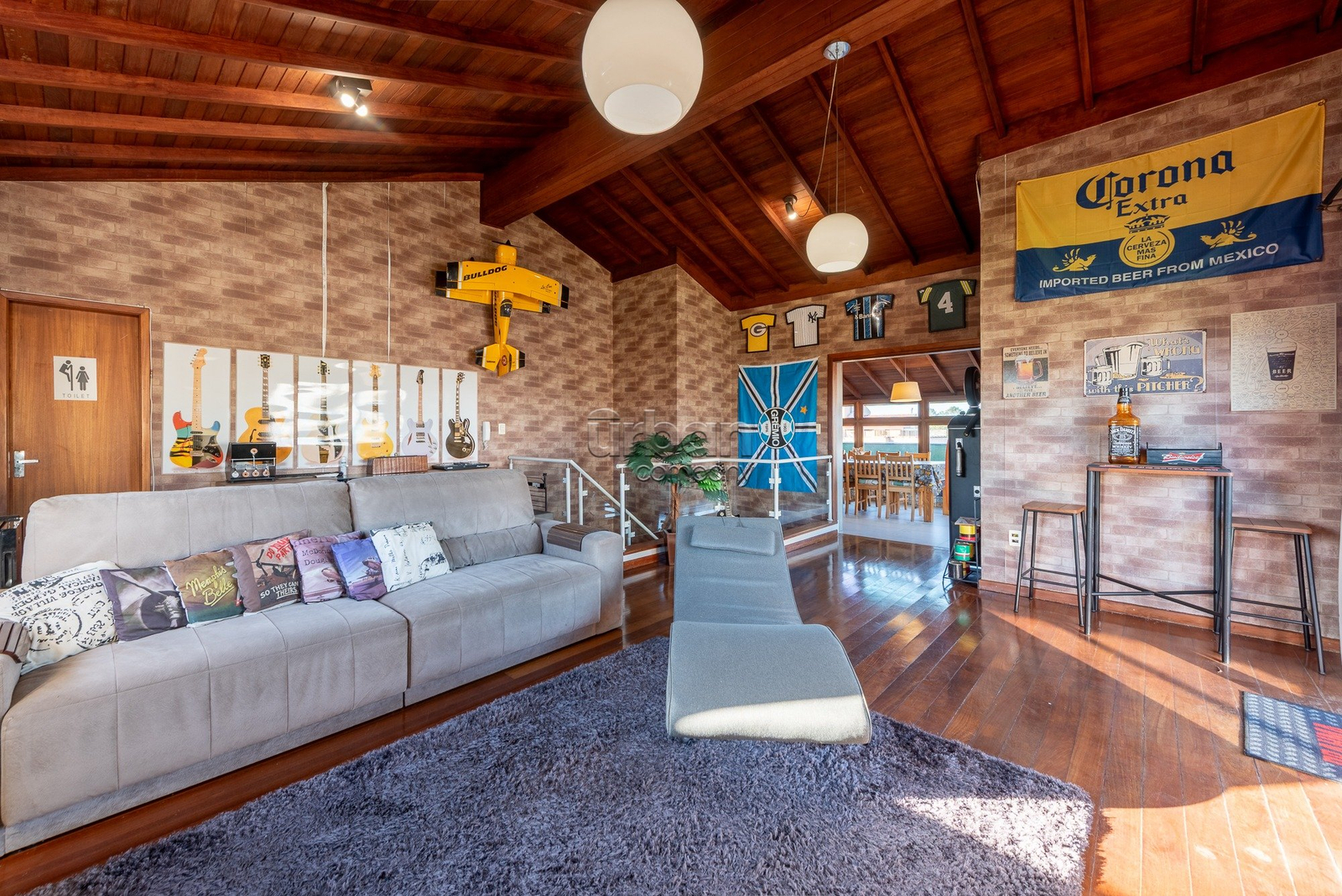 No segundo pavimento, há uma ampla sala de estar com pé-direito triplo, um banheiro, uma sala de jantar integrada à área gourmet com churrasqueira e móveis planejados. A área externa oferece uma vista panorâmica de 180º, ideal para momentos de lazer e contemplação.