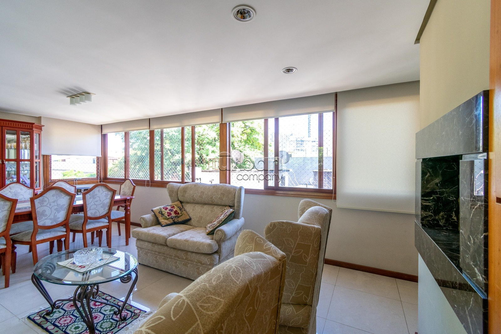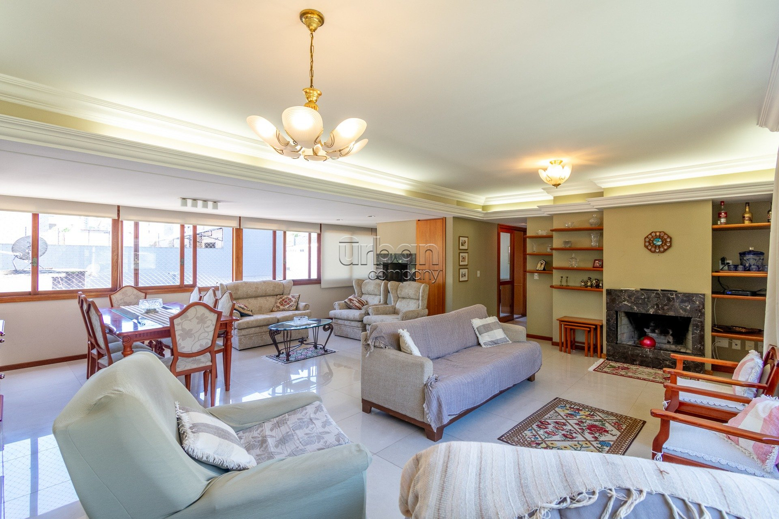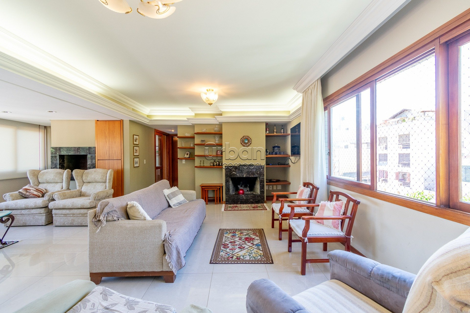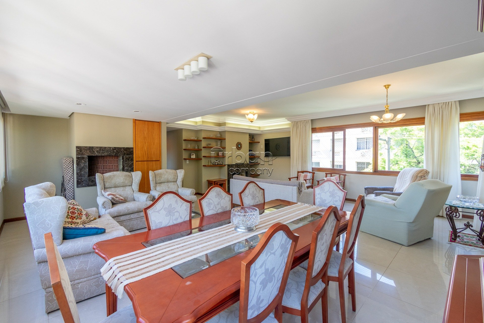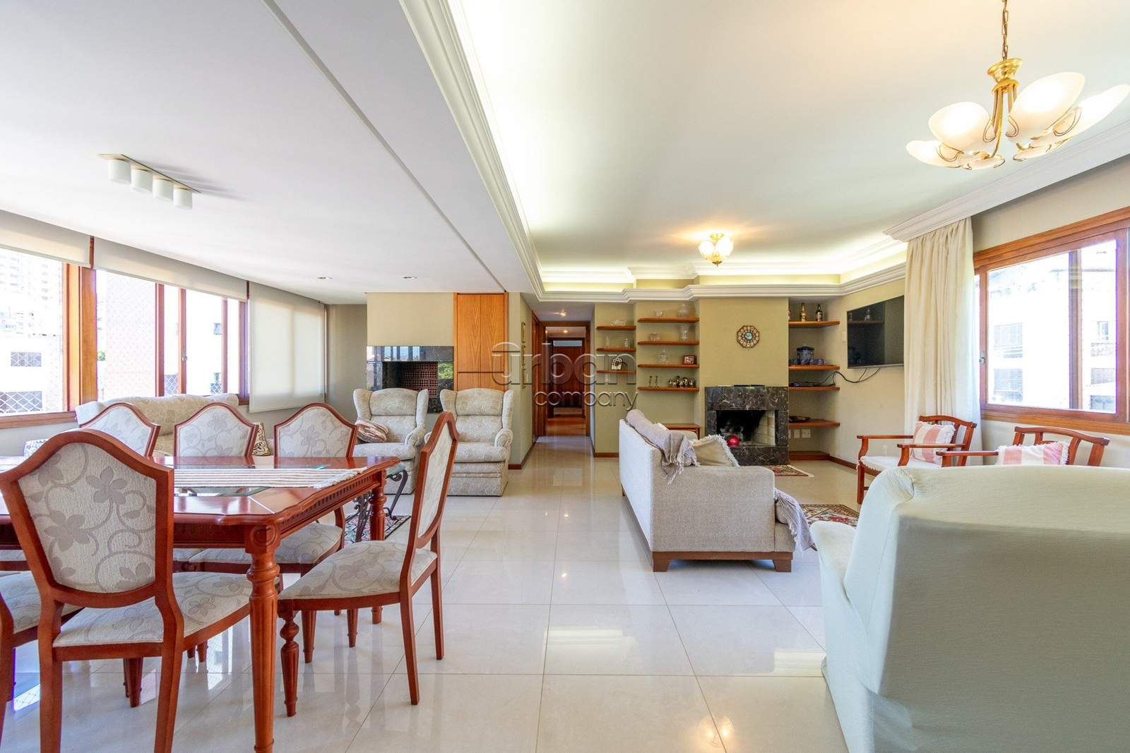 Apartamento com175 m², amplo living ensolarado para 3 ambientes, com grandes janelas que garantem luminosidade, lareira na sala de estar e espaço churrasco. Completam a área social um lavabo e um gabinete, além de uma copa-cozinha mobiliada, área de serviço, banheiro auxiliar e dependência.