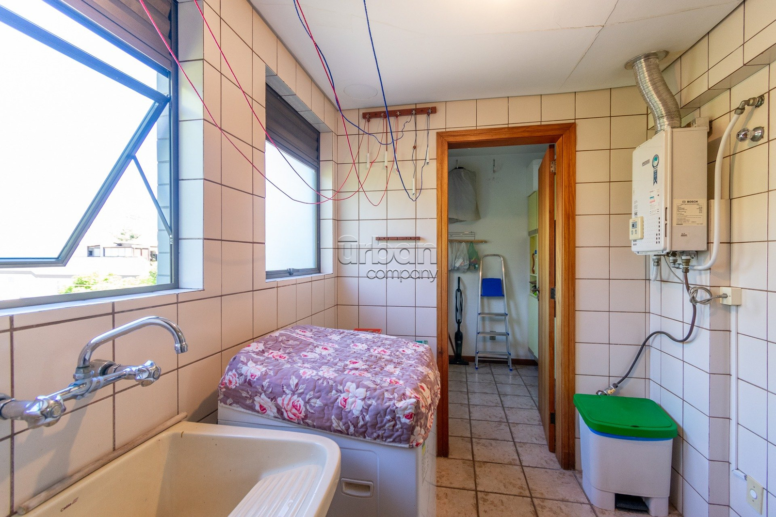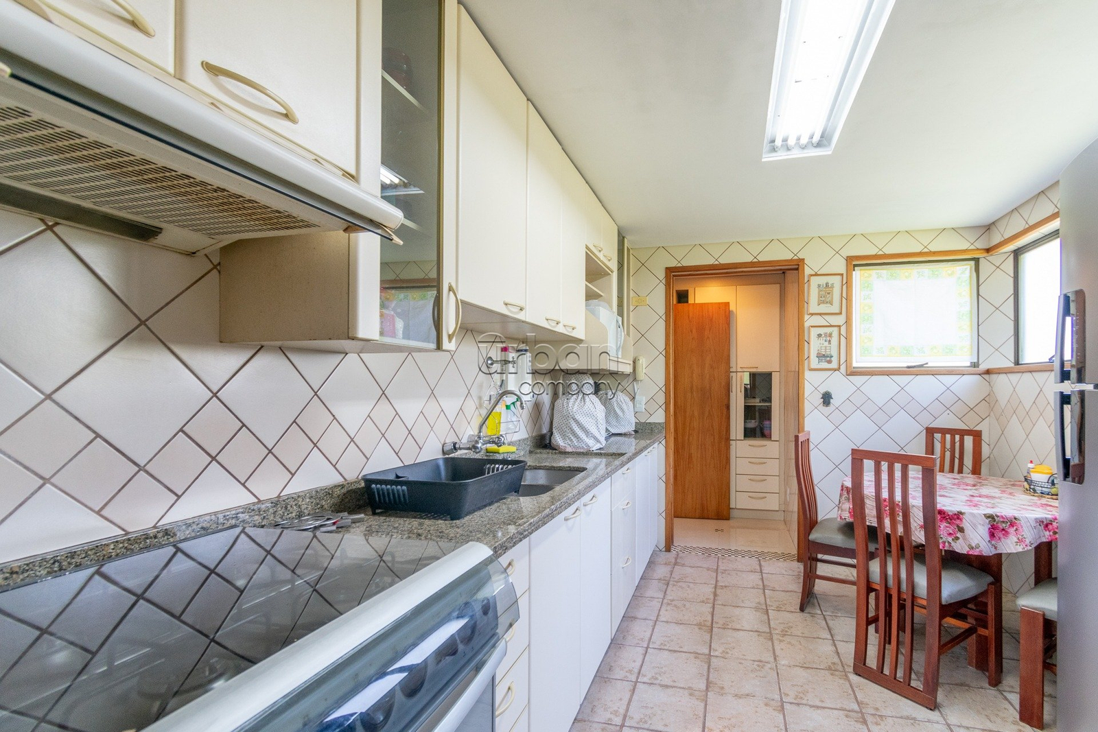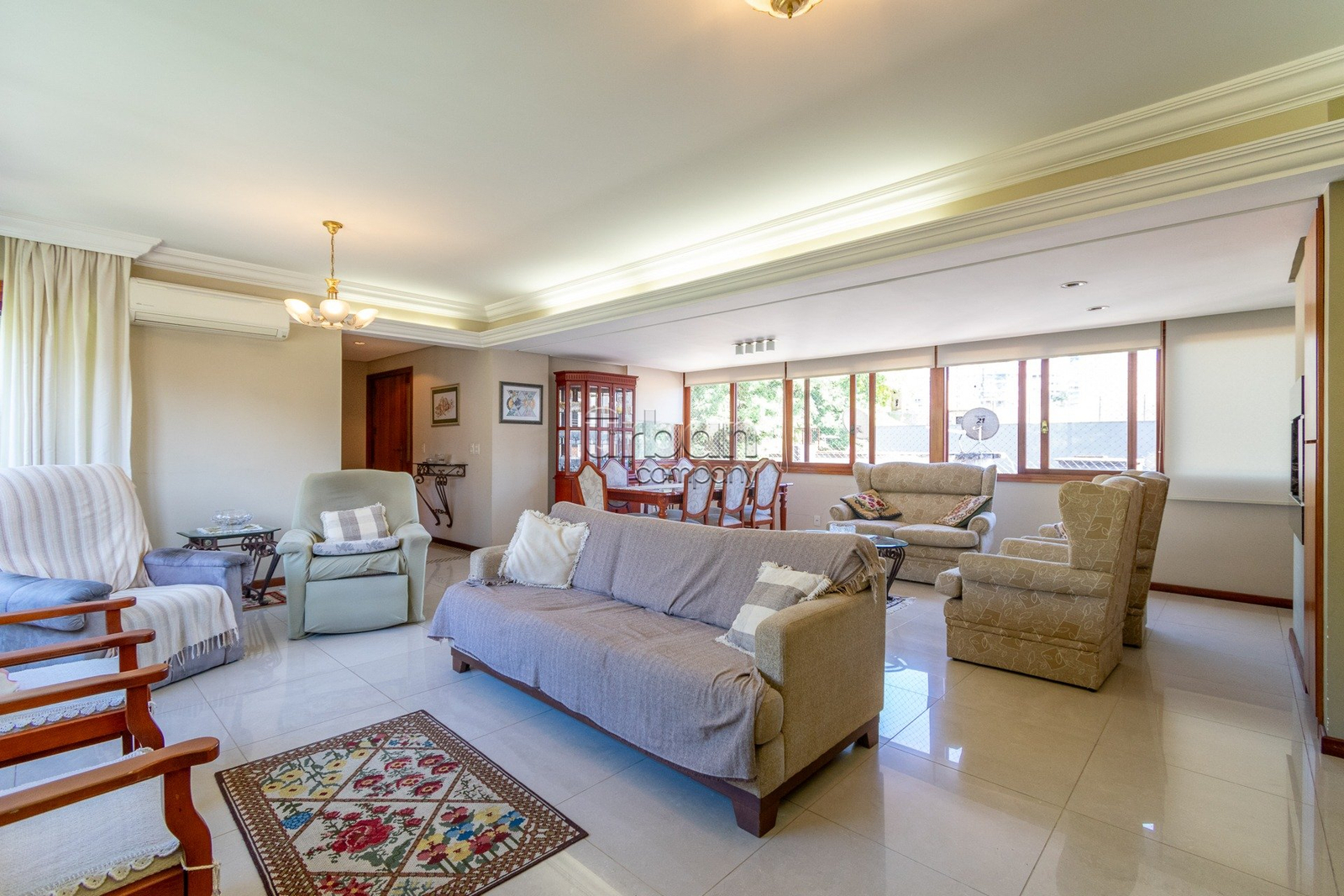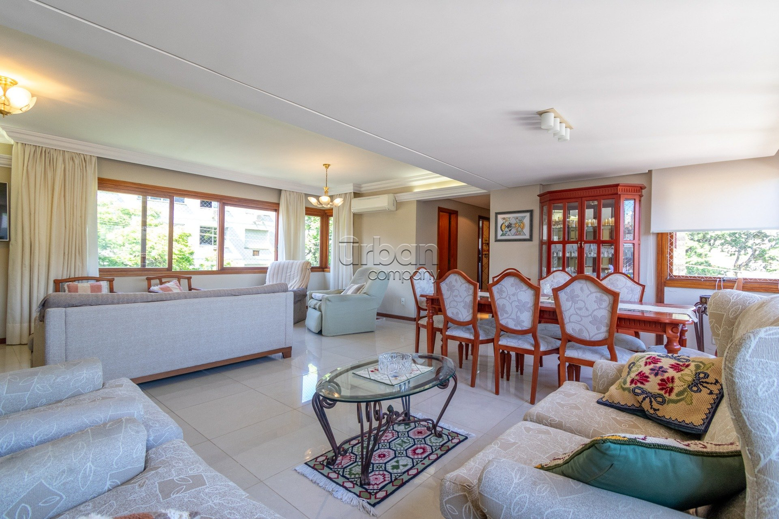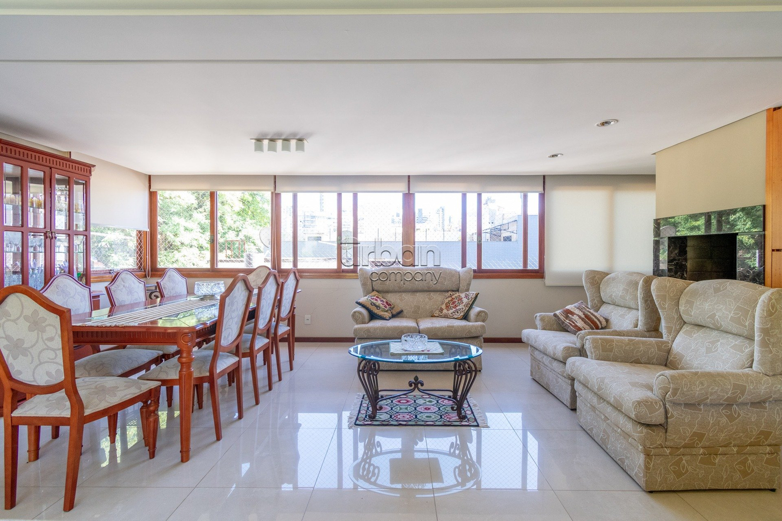 Apartamento com175 m², amplo living ensolarado para 3 ambientes, com grandes janelas que garantem luminosidade, lareira na sala de estar e espaço churrasco. Completam a área social um lavabo e um gabinete, além de uma copa-cozinha mobiliada, área de serviço, banheiro auxiliar e dependência.