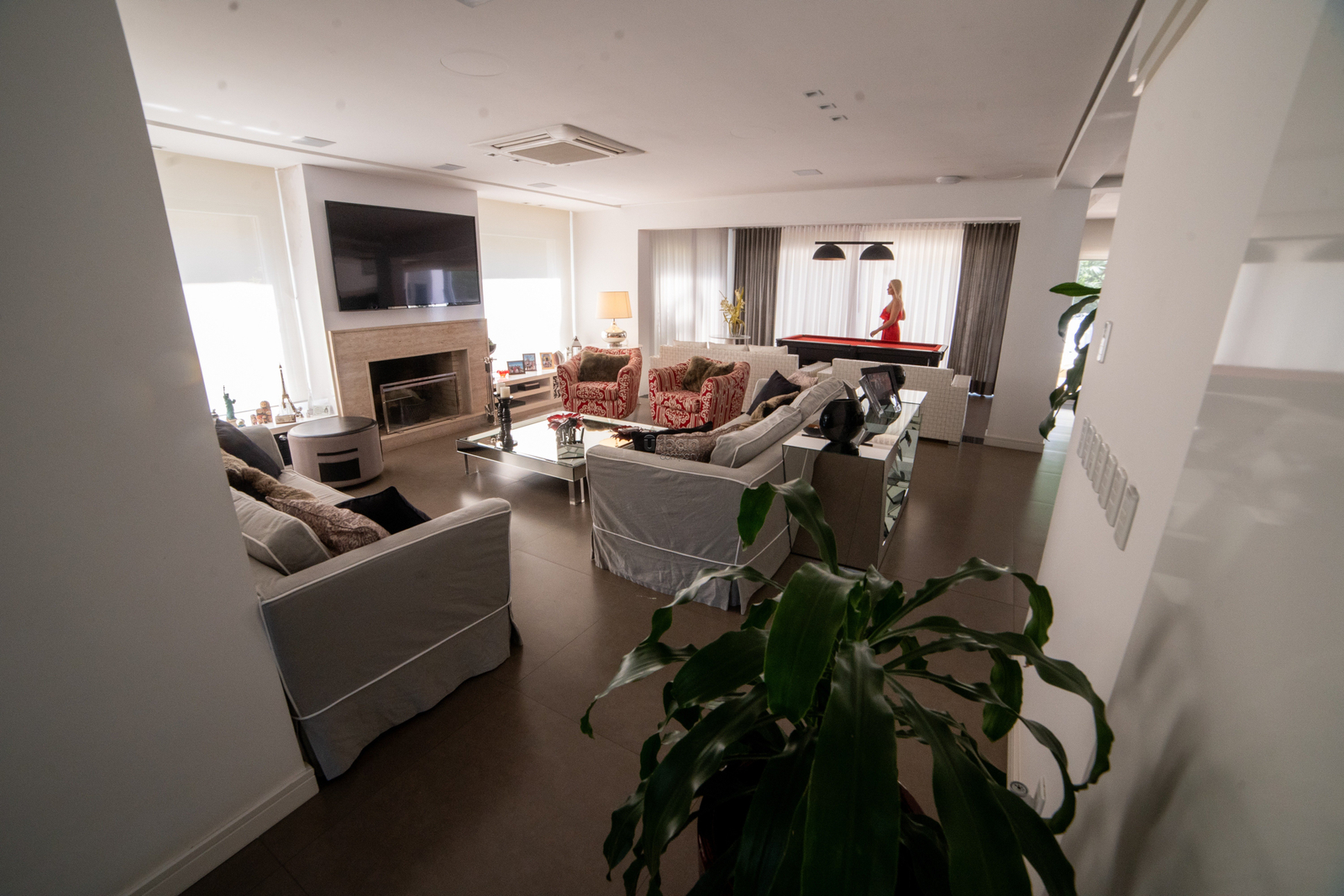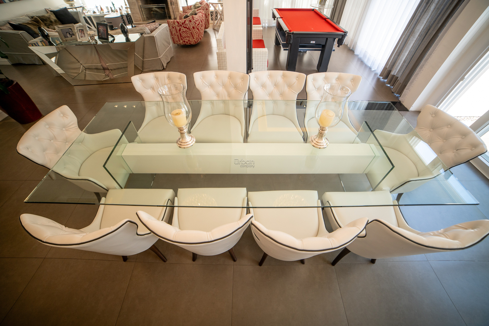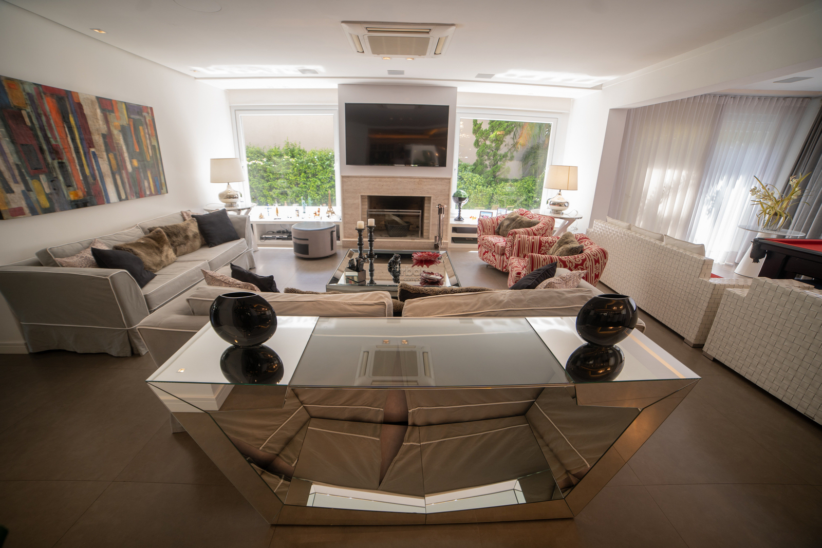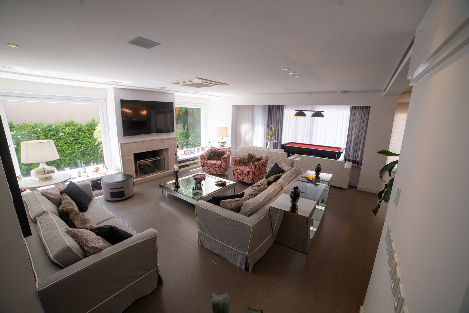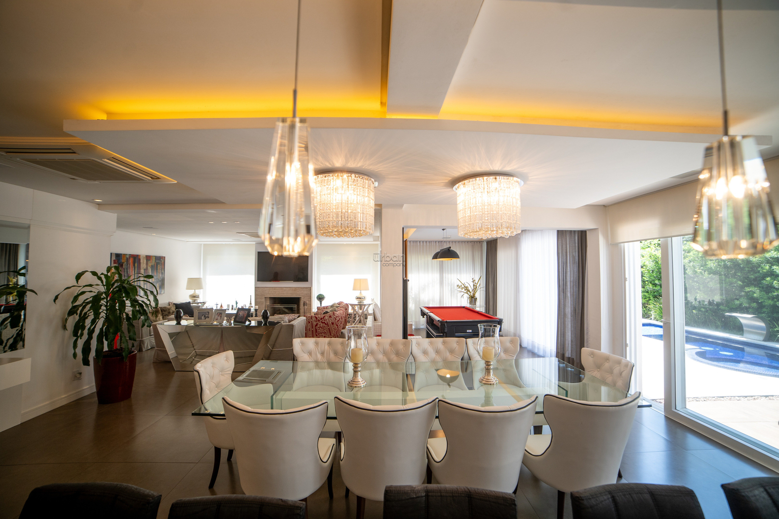 A sala com conceito aberto busca integrar a lareira, sala de jantar, mesa de sinuca e um lindo espaço gourmet com Parilla e uma bancada em granito para 12 pessoas. A casa ficará totalmente mobiliada, cozinha, lavanderia, dependência de empregada com banheiro. Sala de TV privada, lavabo, piscina externa com vestiário para convidados.