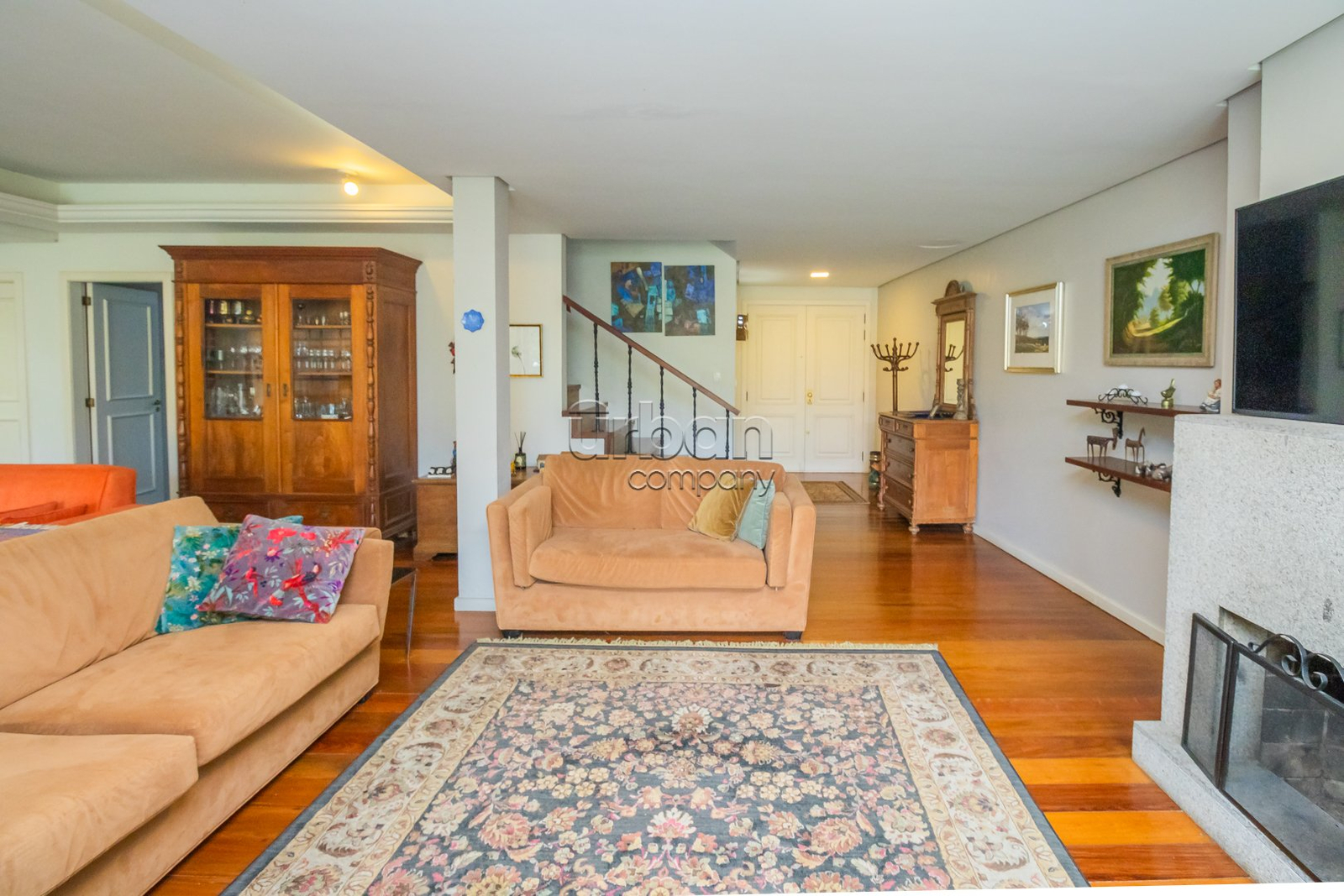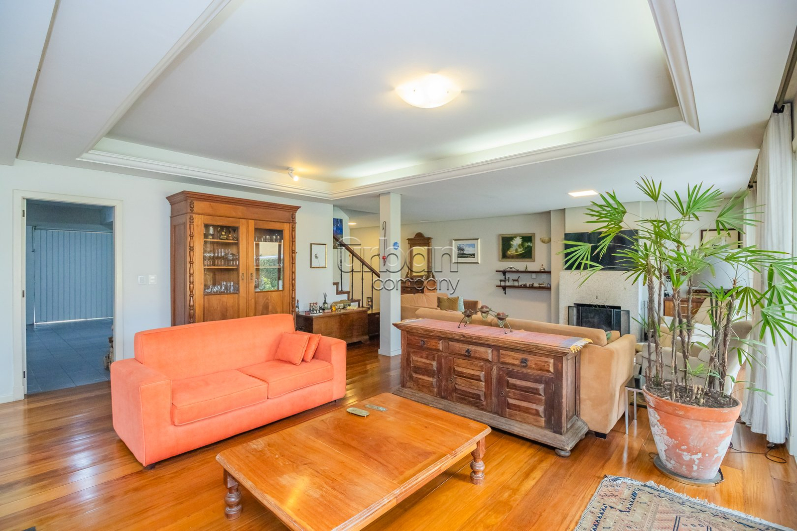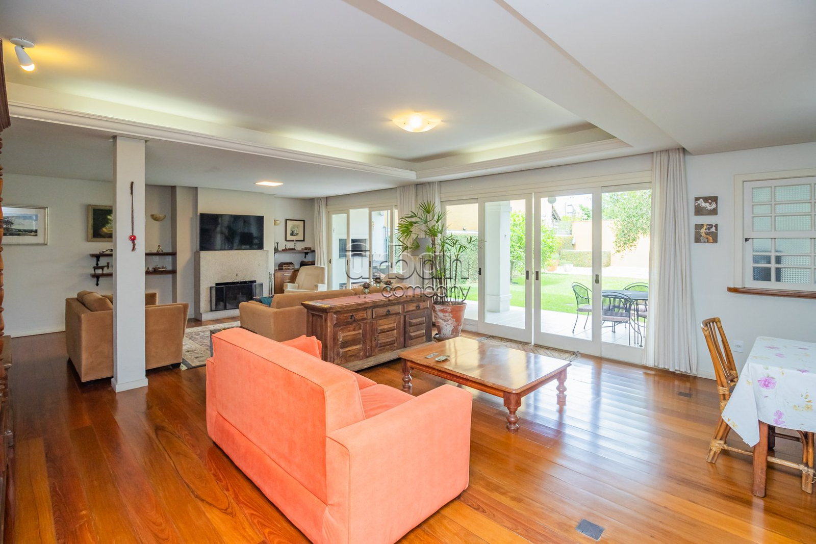 Sala de estar ampla e aconchegante com lareira, perfeita para momentos em família.