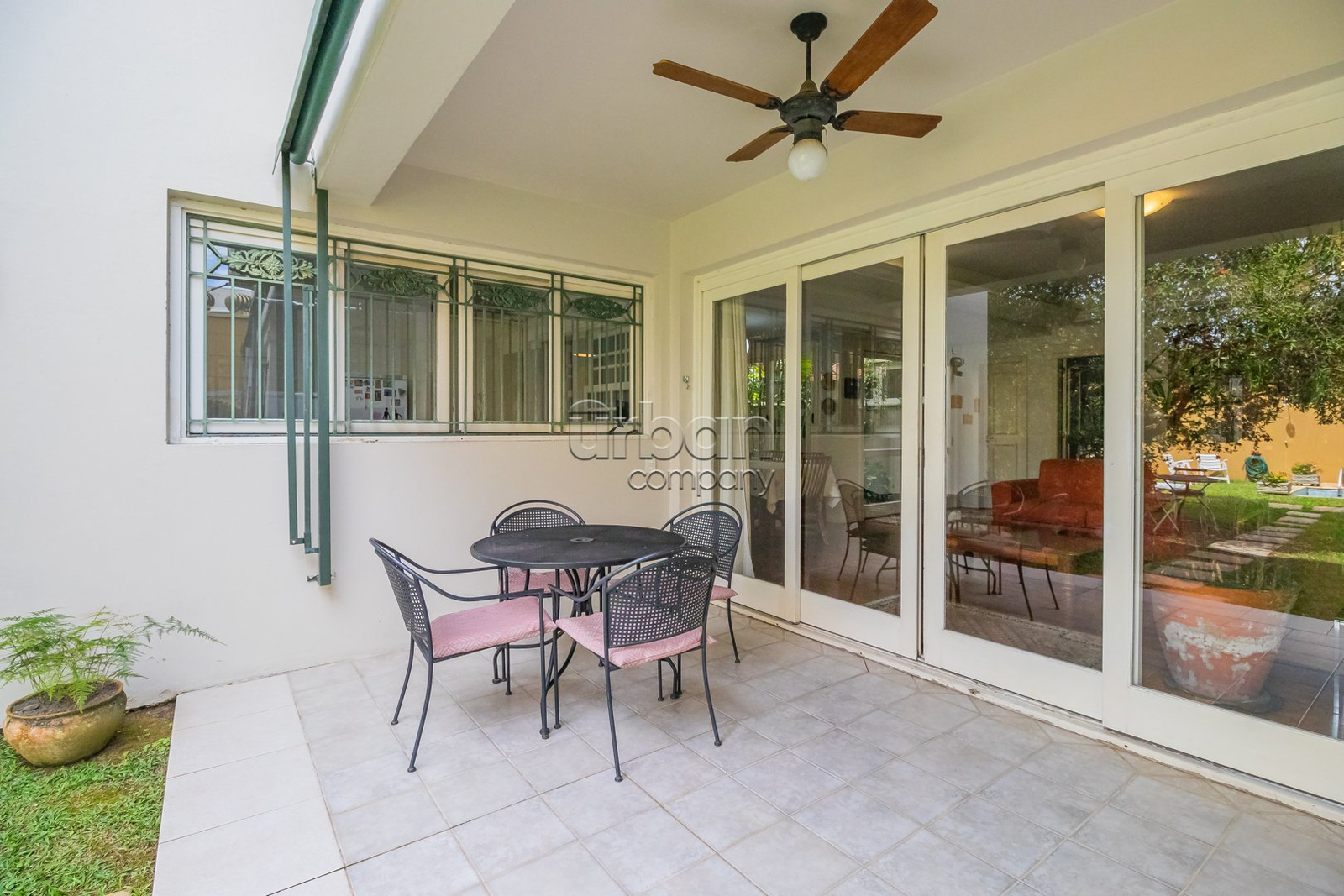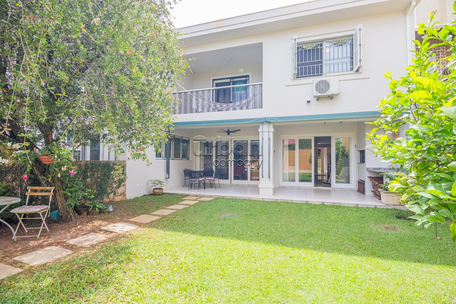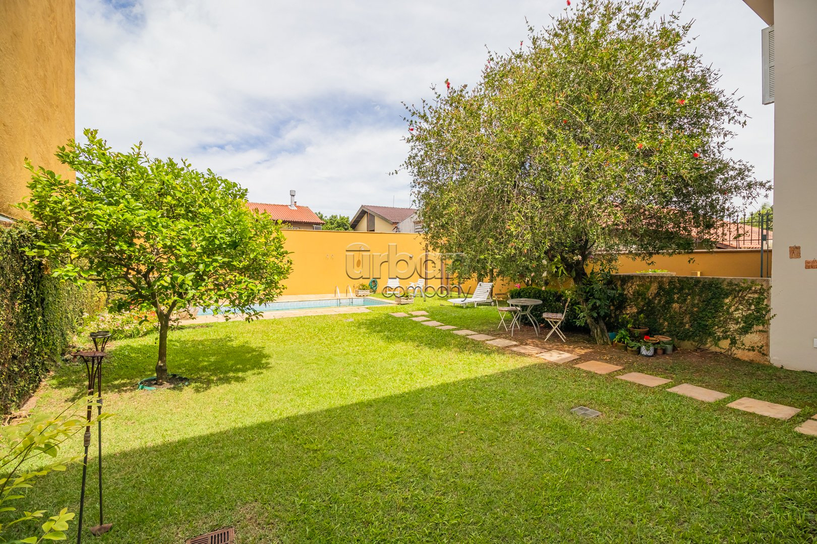 Amplo pátio com jardim florido e pomar com árvores frutíferas.