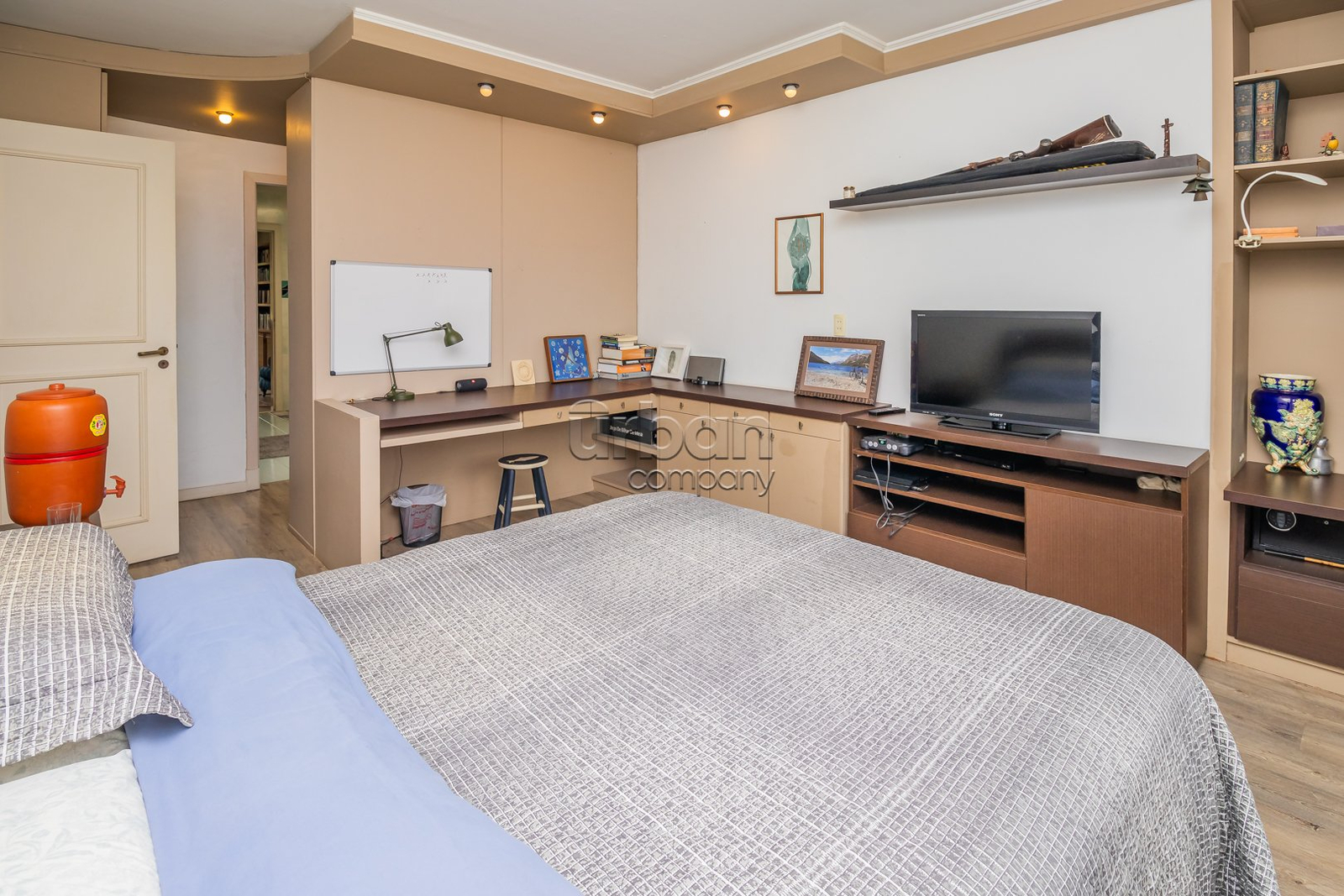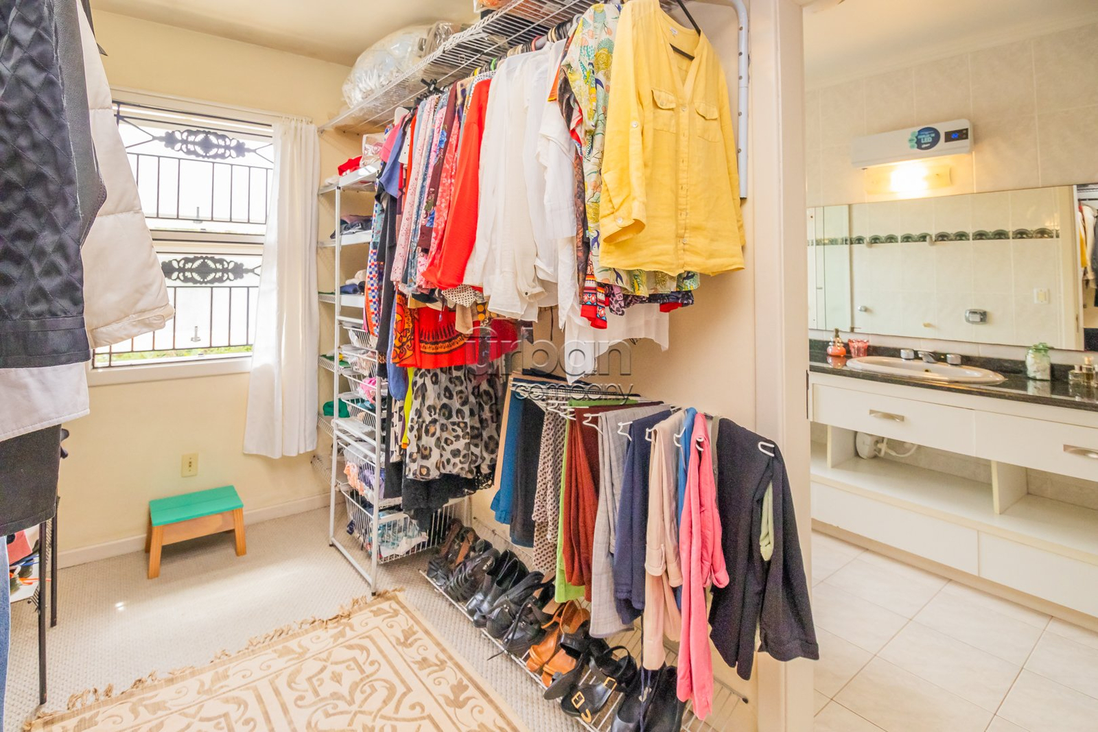 Suíte master com closet planejado e espaço para relaxamento.