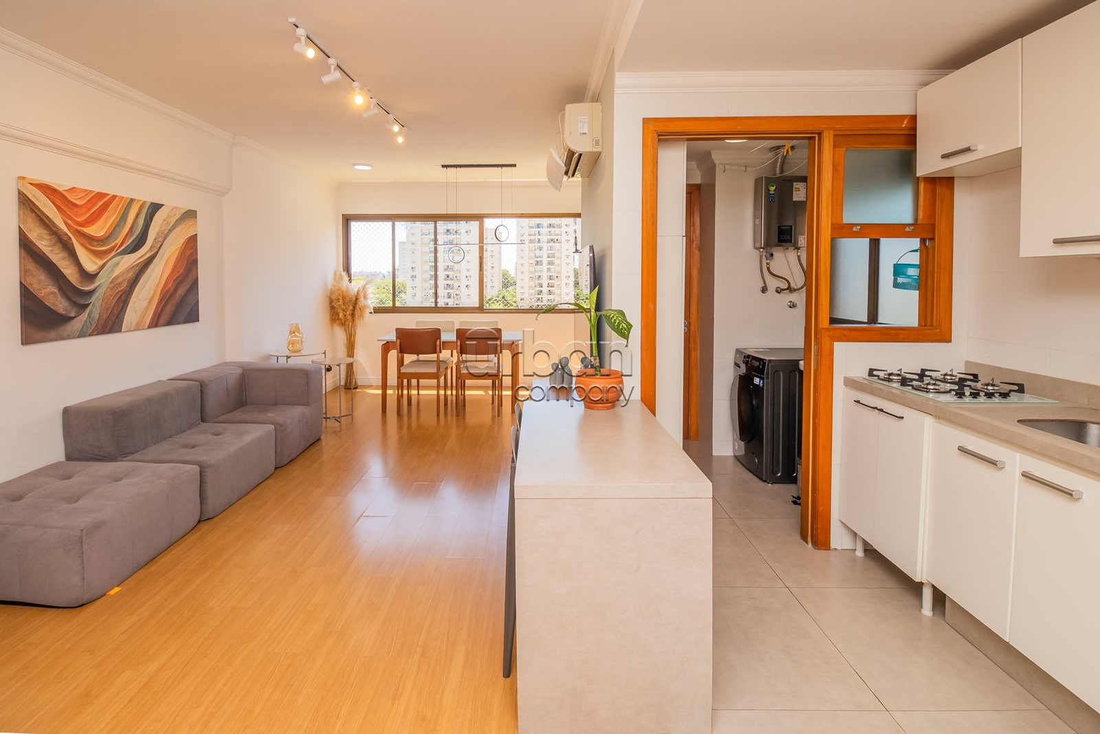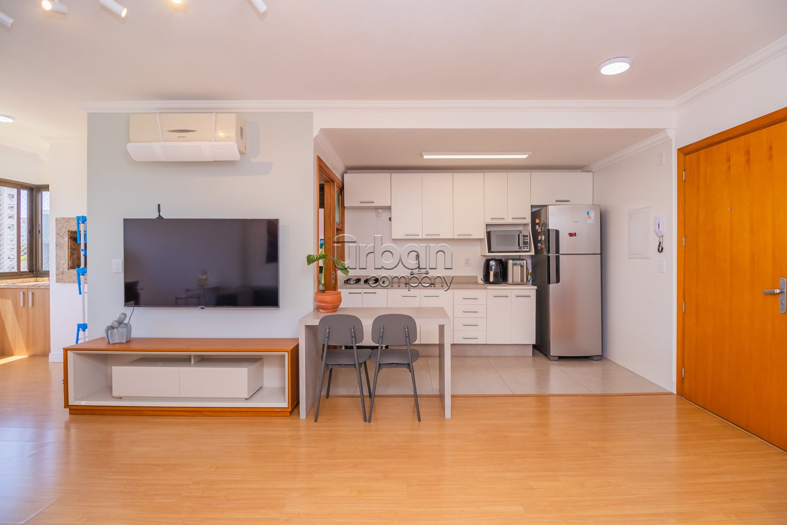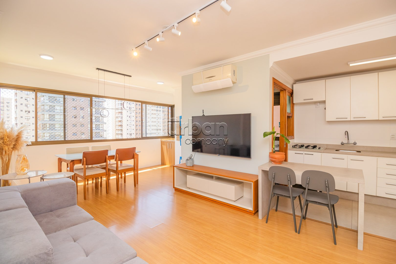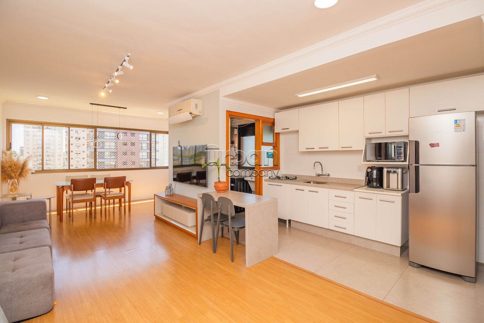 O imóvel conta com um amplo living para dois ambientes, espaço gourmet integrado à cozinha equipada com móveis planejados, e área de serviço separada. São 2 dormitórios, sendo uma suíte, e um banheiro social, todos com acabamentos de alto padrão e ventilação direta.
