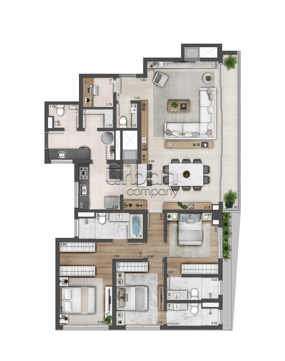 Os apartamentos do Garden Haus são espaçosos e sofisticados, com 03 suítes e plantas que variam de 156 m² a 187 m² de área privativa. O empreendimento inclui 04 unidades especiais Garden e 02 unidades especiais cobertura duplex, oferecendo diversas opções para atender às suas necessidades.
