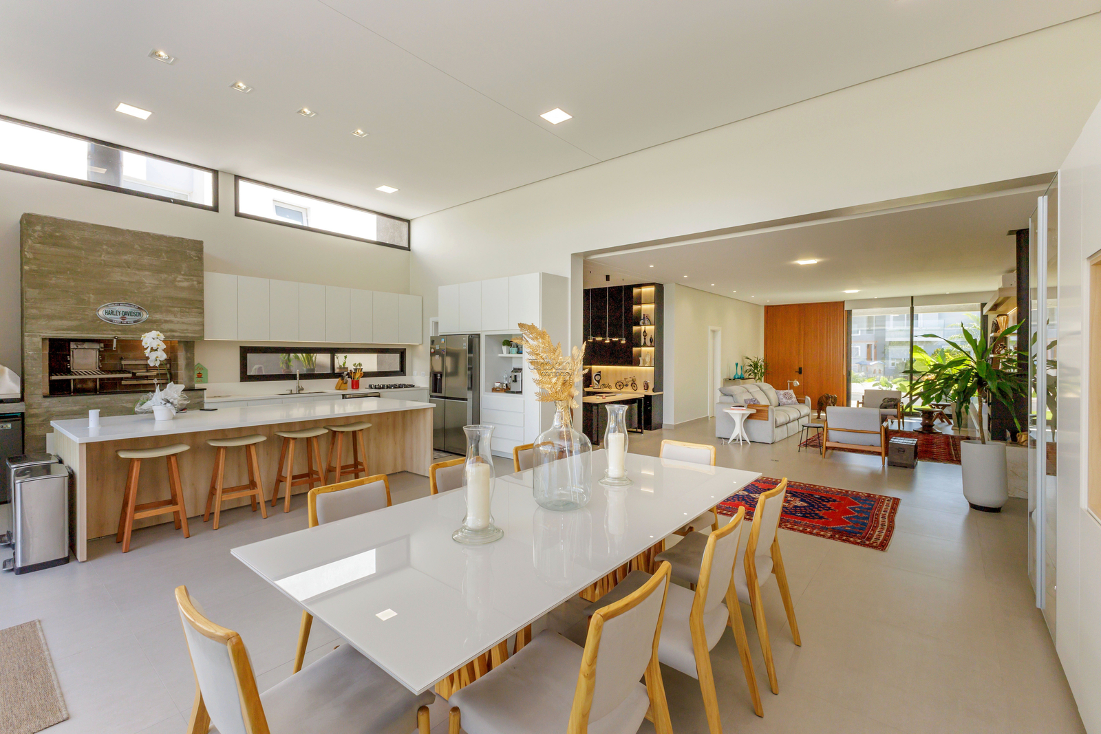 A área gourmet externa é equipada com uma churrasqueira de concreto aparente, com utensílios em inox, um forno de pizza em inox e uma lareira de alta eficiência, ideal para encontros em família ou com amigos. A casa dispõe ainda de garagem coberta e iluminação externa no jardim, realçando a beleza do paisagismo.