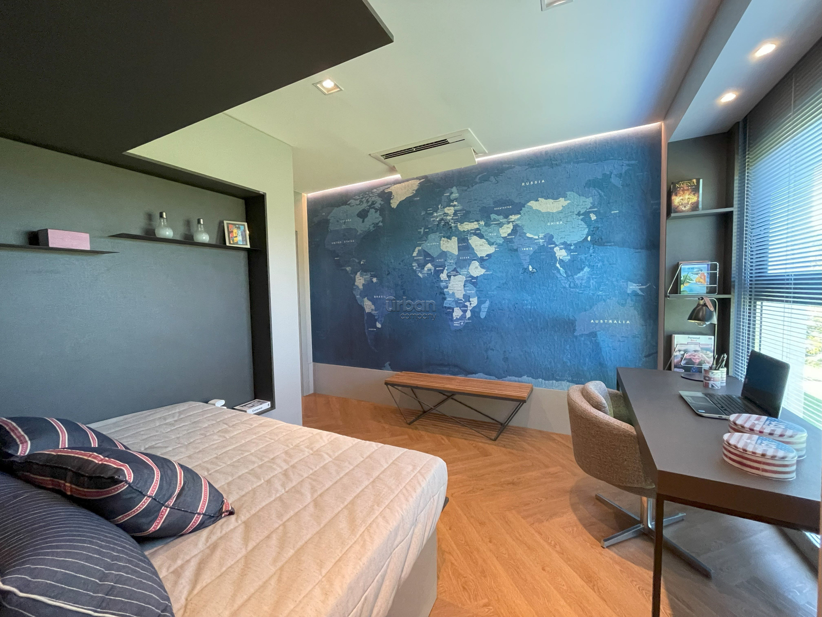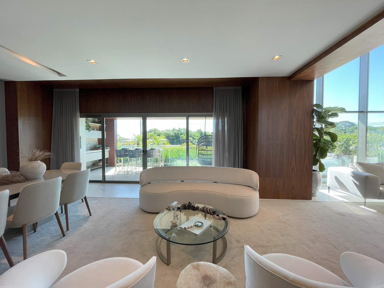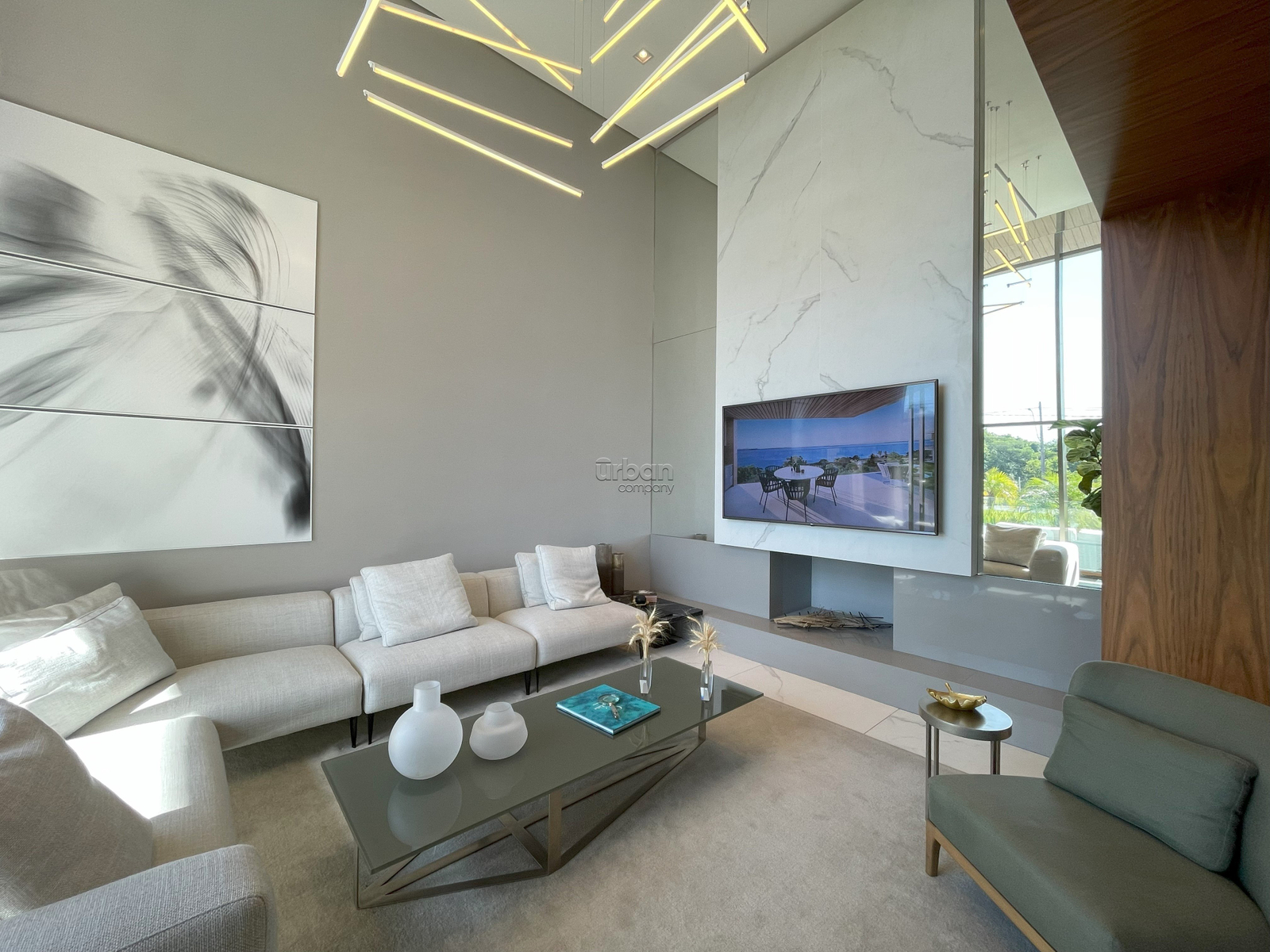 Destaca-se por um pé-direito duplo na sala de estar, proporcionando uma sensação de amplitude e elegância. A sala também é equipada com lareira e se estende a uma varanda com churrasqueira, perfeita para momentos de lazer.