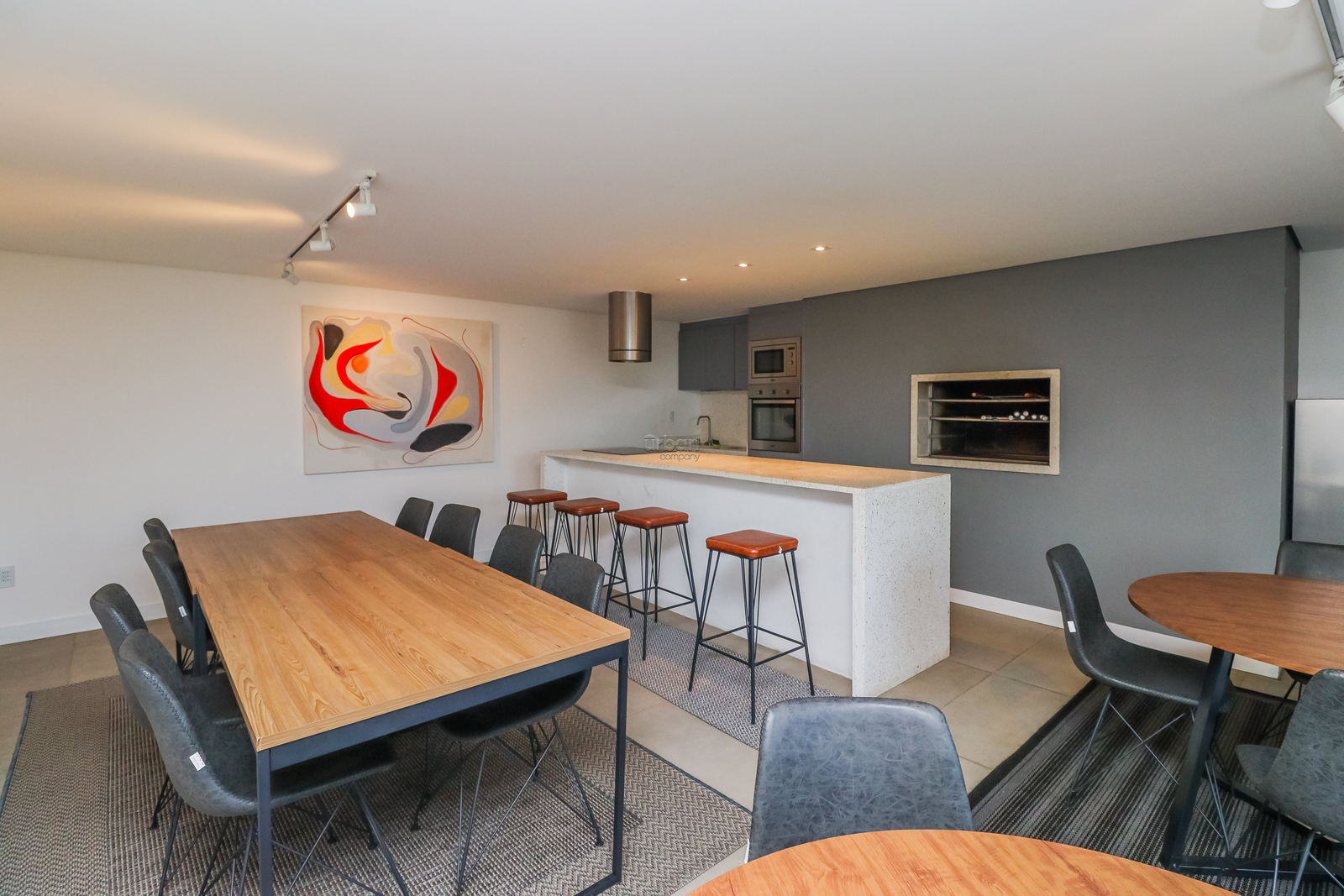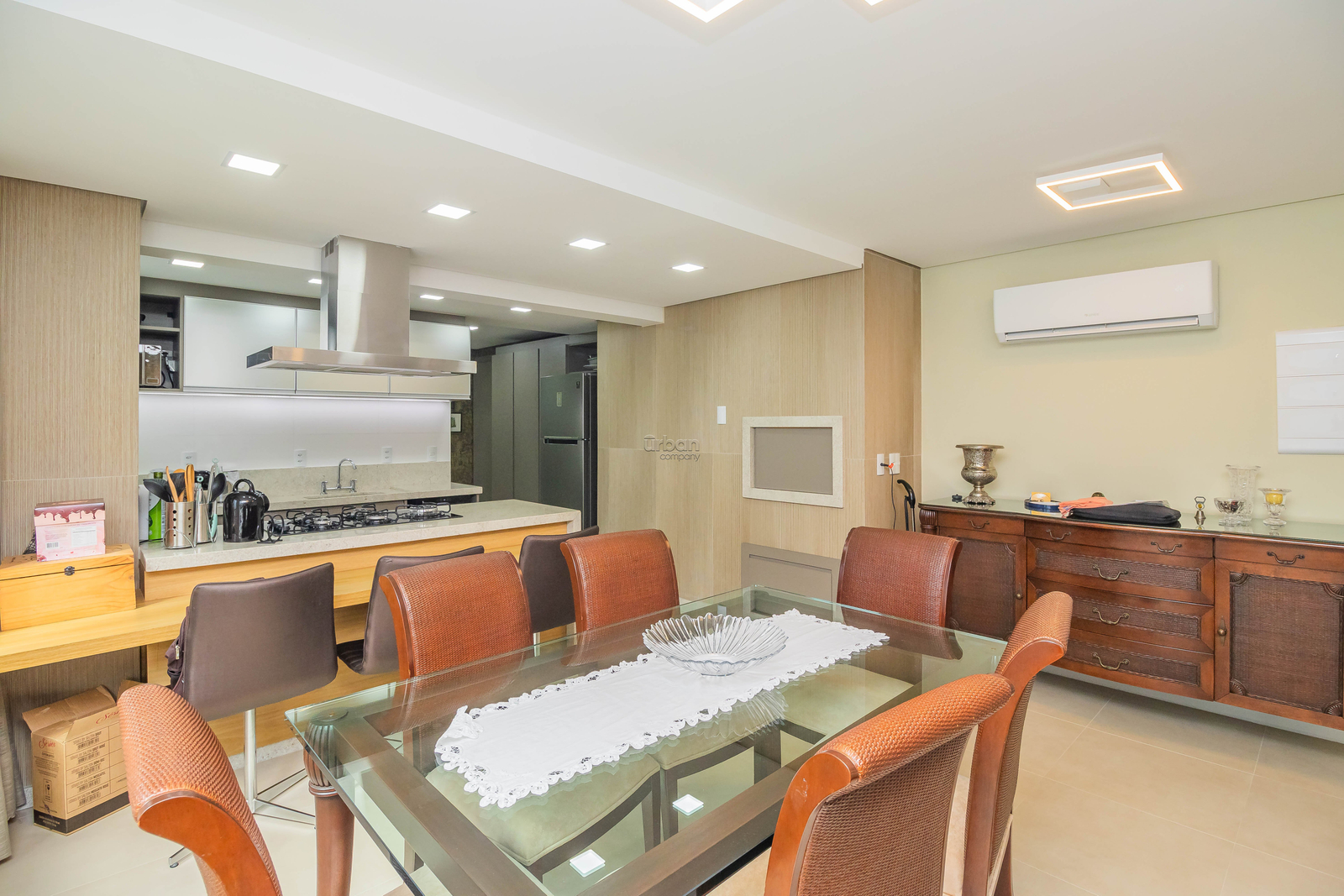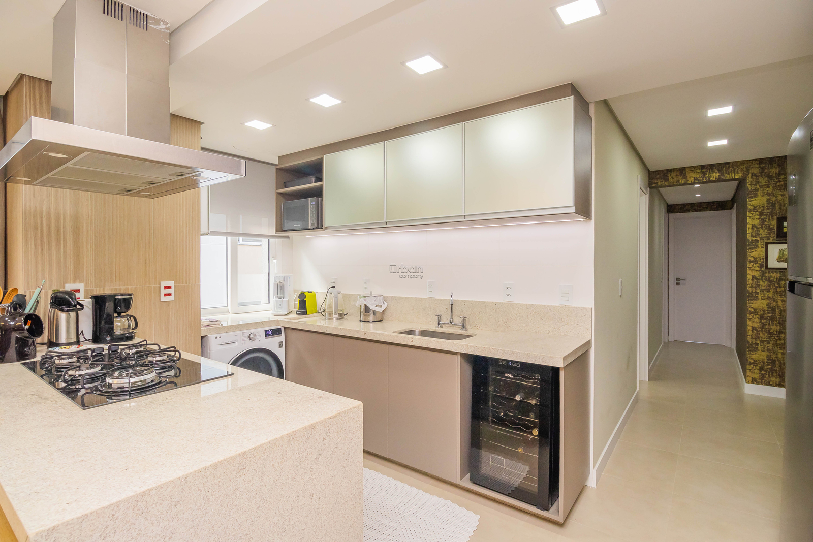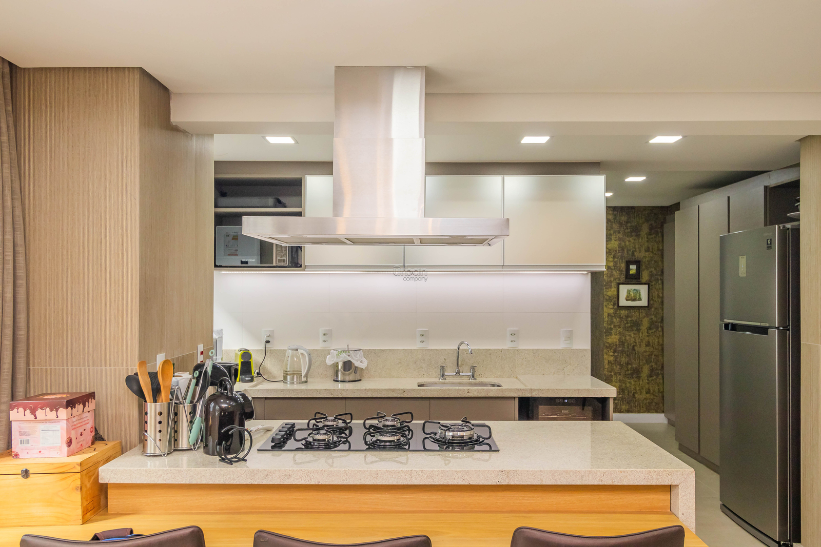 A sala de estar oferece dois ambientes aconchegantes, integrados a uma cozinha americana moderna com churrasqueira contígua, ideal para receber amigos e família.