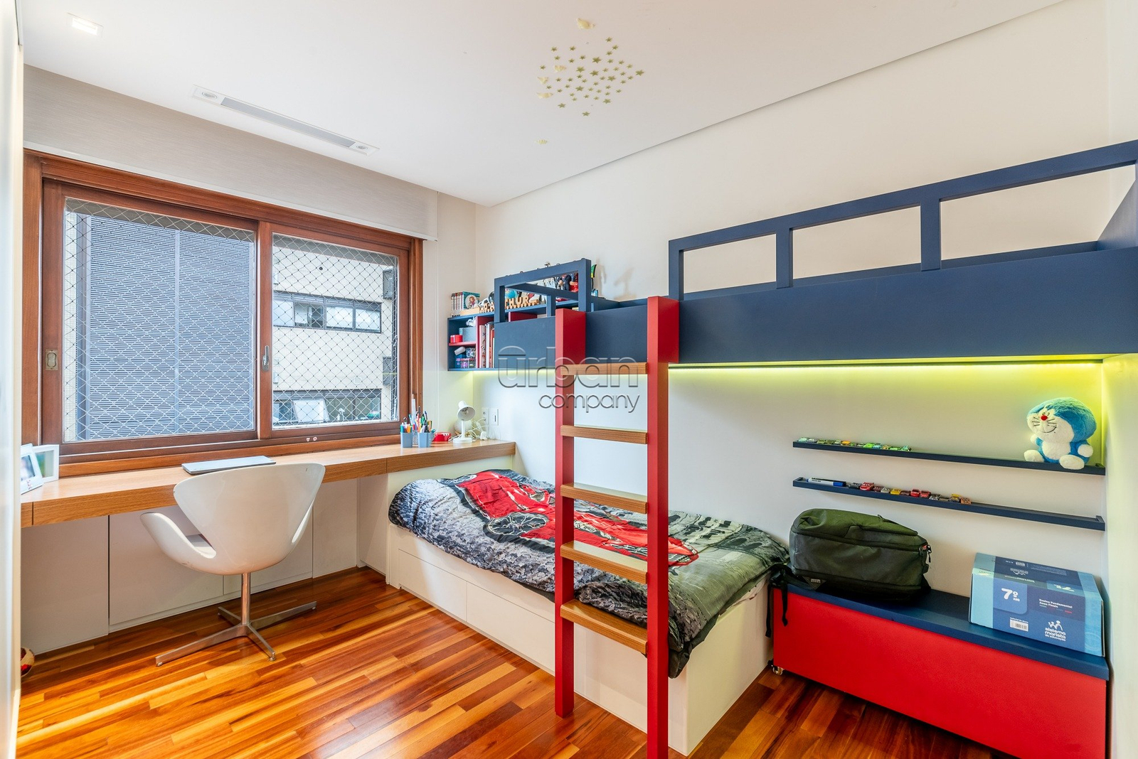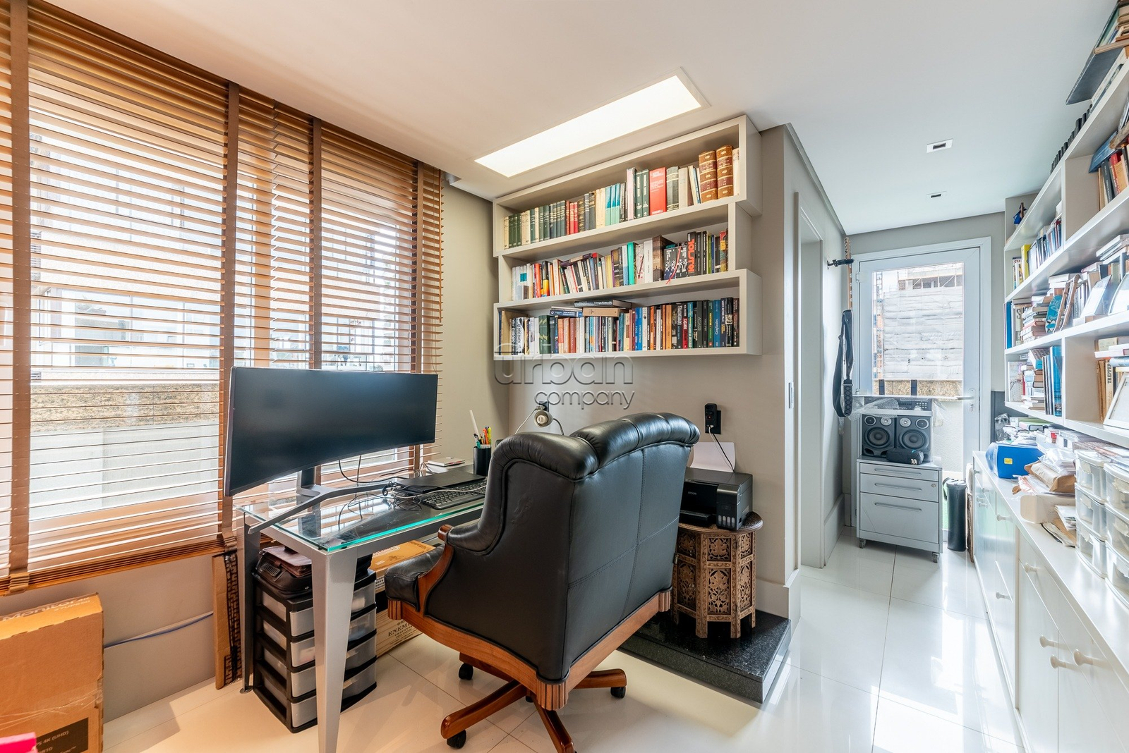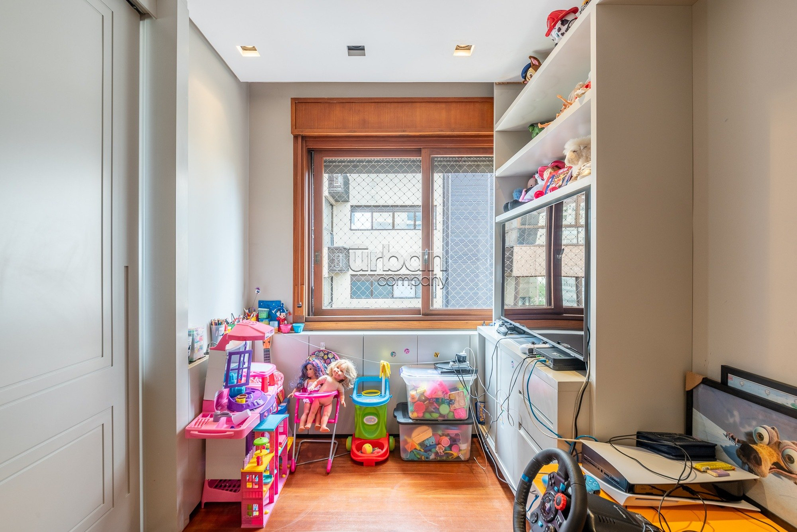 A quarta suíte oferece múltiplas possibilidades de uso, podendo servir como gabinete, sala de brinquedos ou um aconchegante quarto de hóspedes.