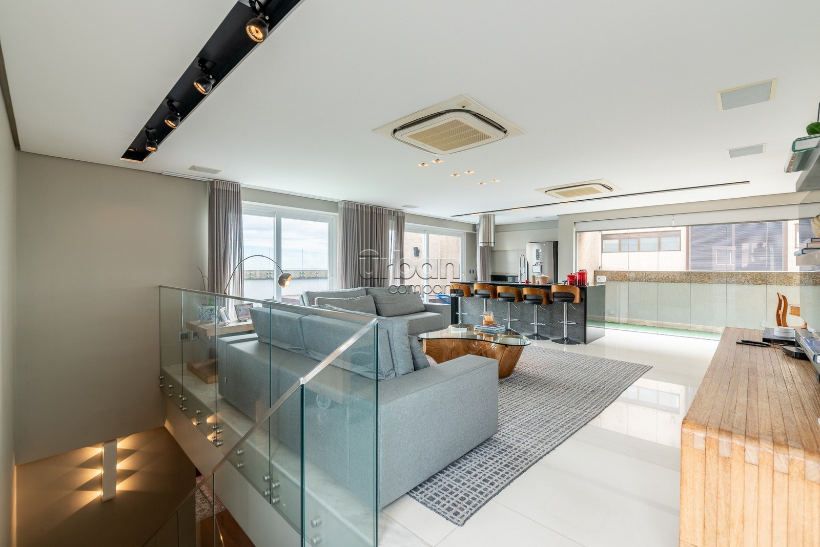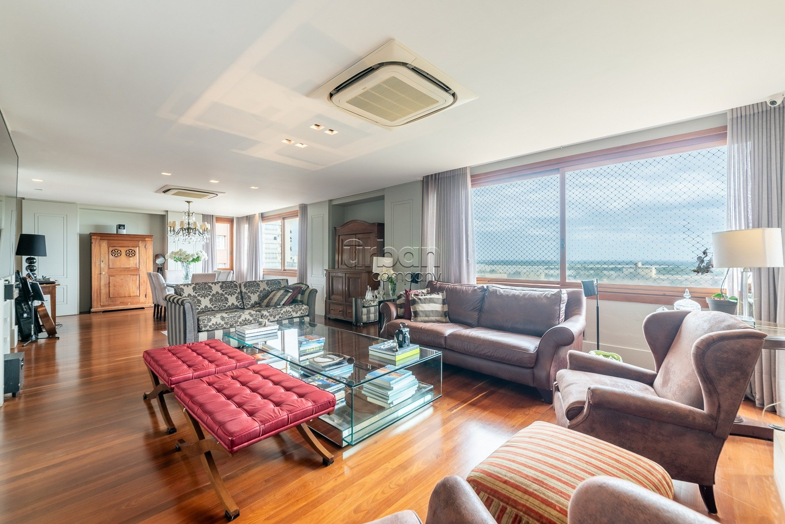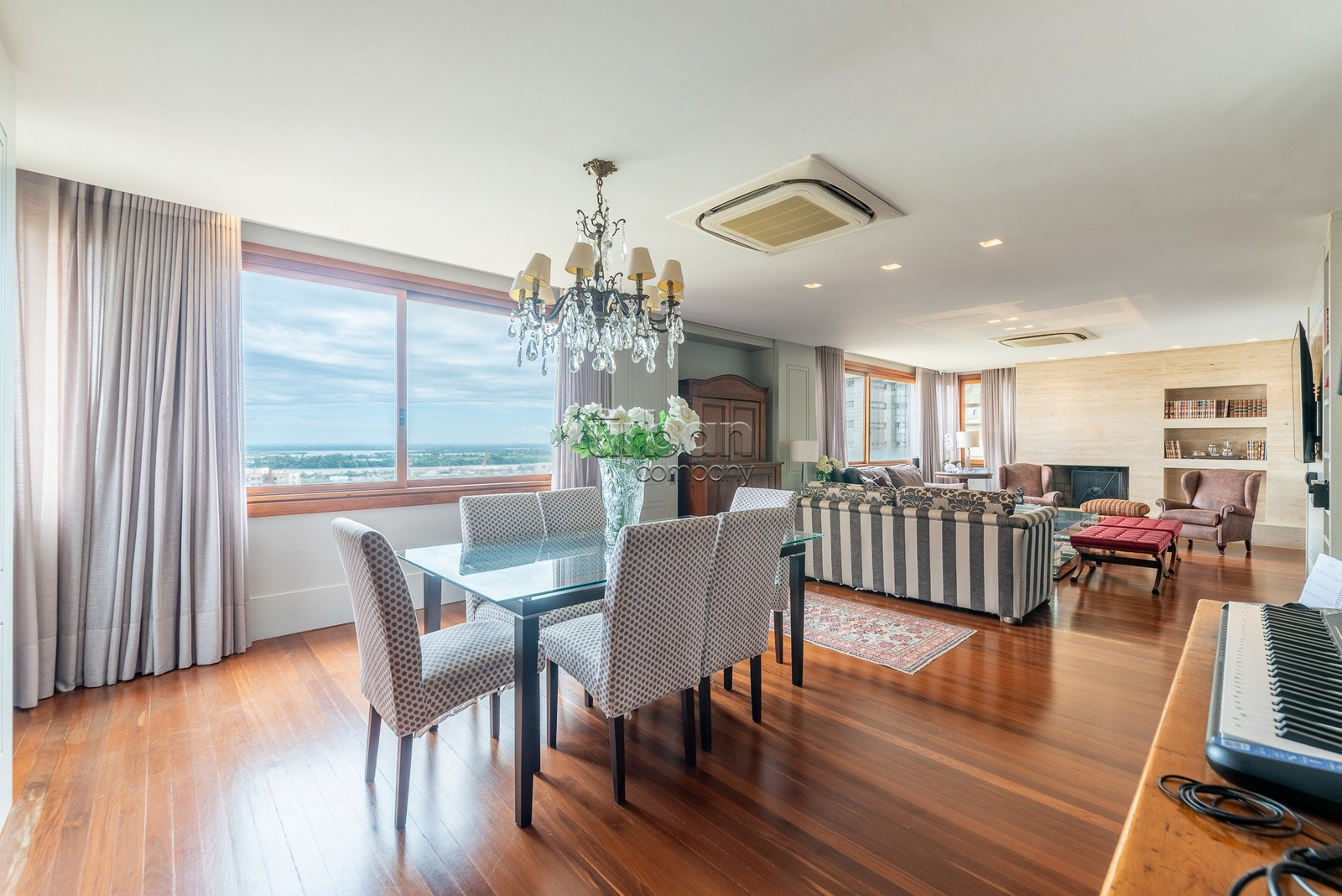 O primeiro pavimento conta com um amplo living revestido com piso em taboão, ideal para três ambientes integrados, além de grandes janelas que proporcionam uma vista espetacular do Guaíba.