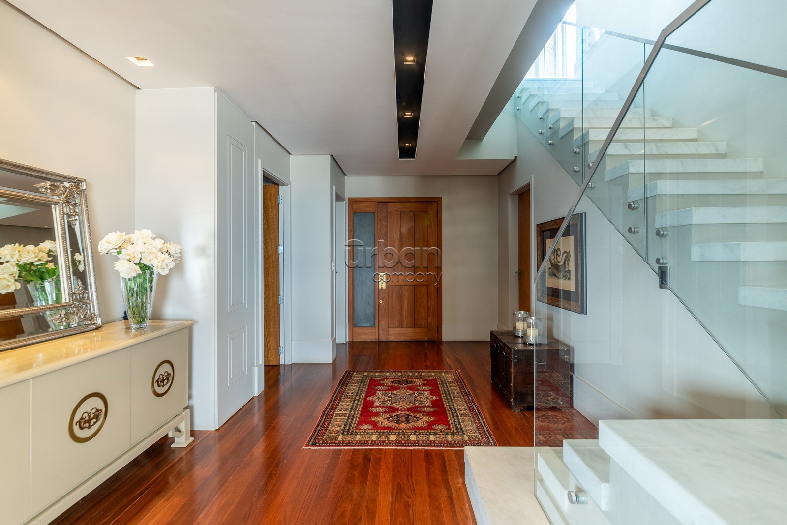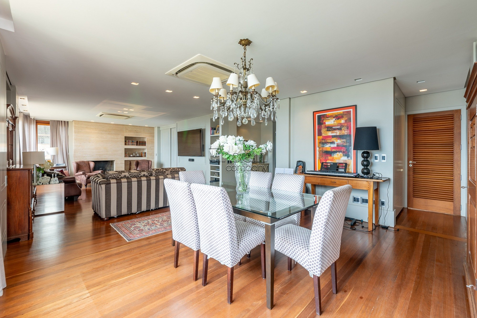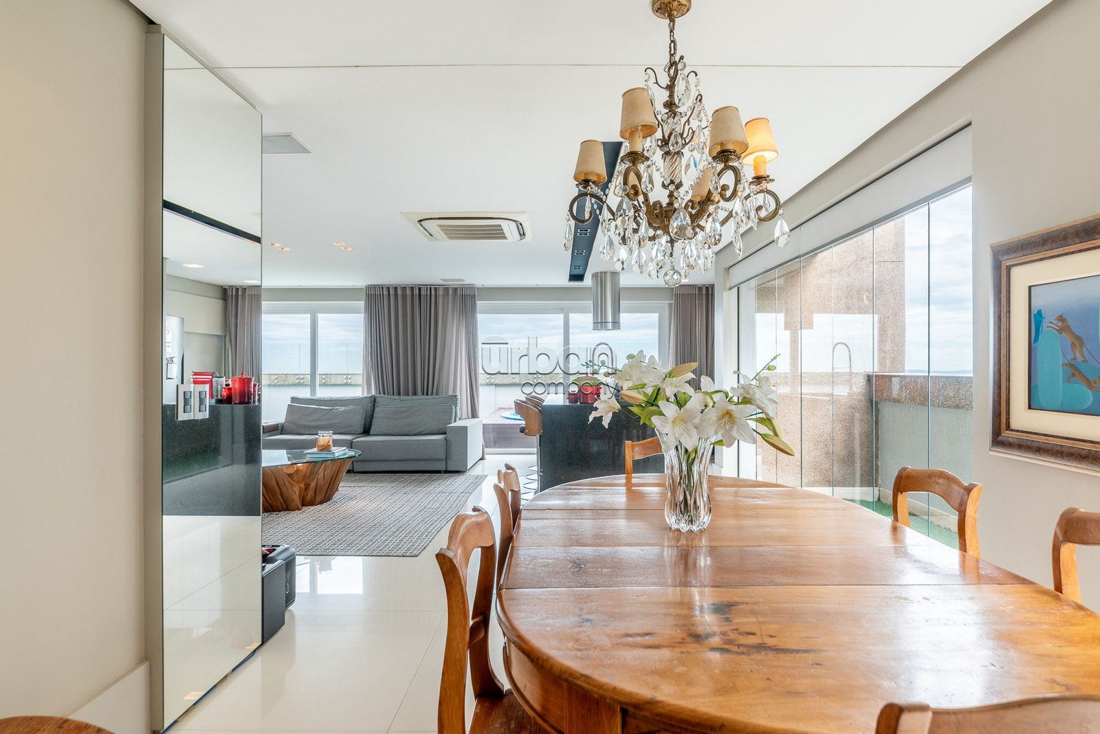 O primeiro pavimento conta com um amplo living revestido com piso em taboão, ideal para três ambientes integrados, além de grandes janelas que proporcionam uma vista espetacular do Guaíba.