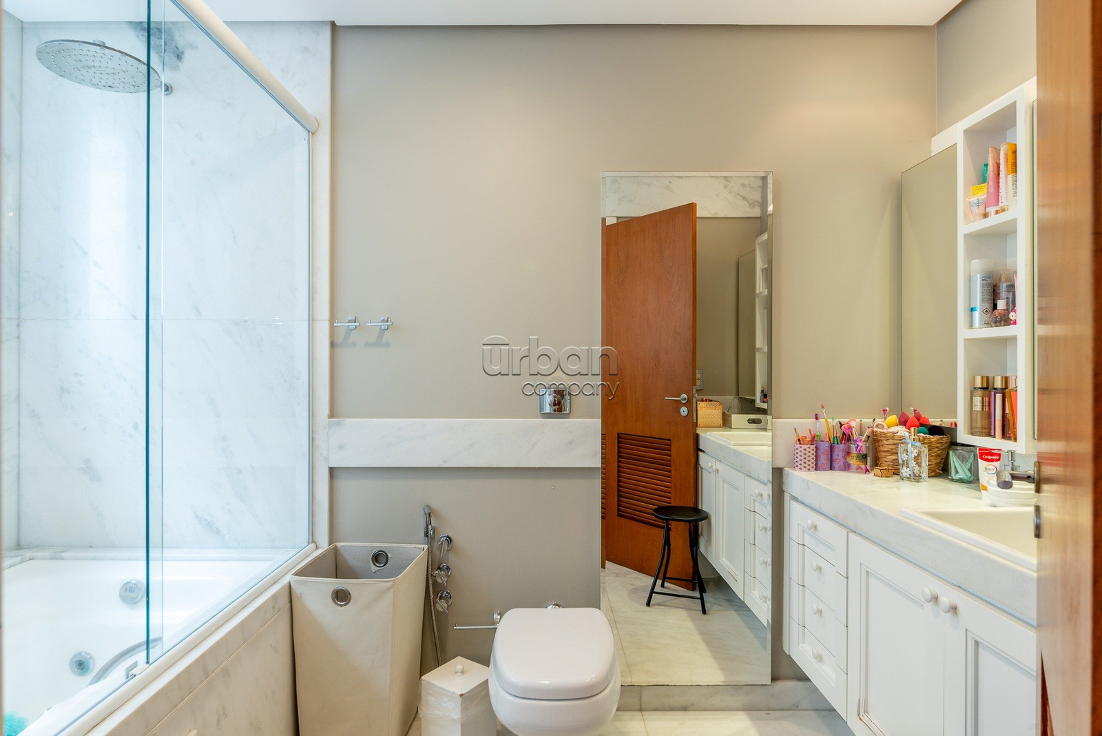 Também neste andar, encontra-se um lavabo, um gabinete, uma copa, uma cozinha planejada e uma área de serviço completa. As quatro suítes são cuidadosamente projetadas, destacando-se a suíte master do casal, que oferece dois closets e um banheiro revestido em mármore, equipado com hidromassagem, chuveiro separado e bancada dupla.