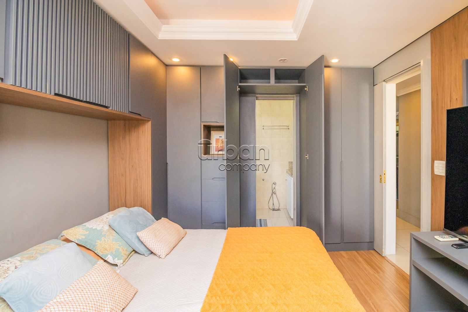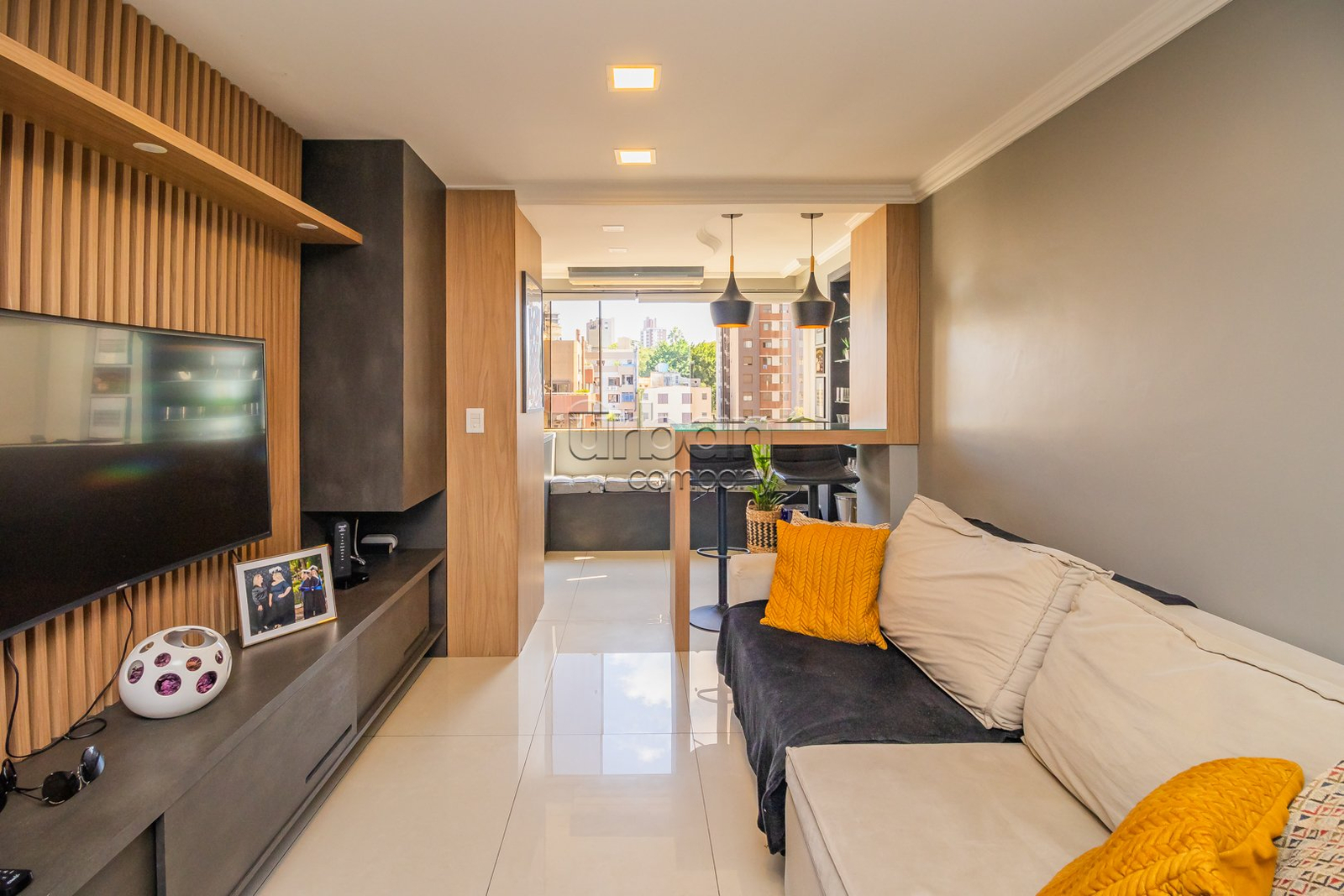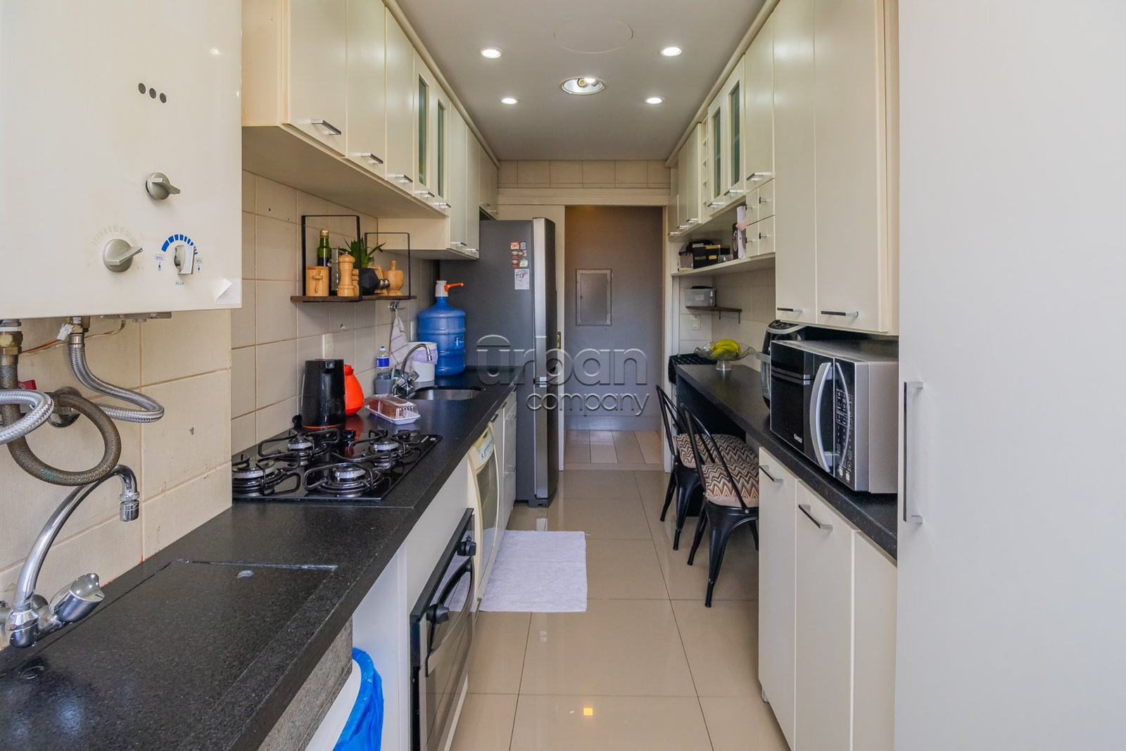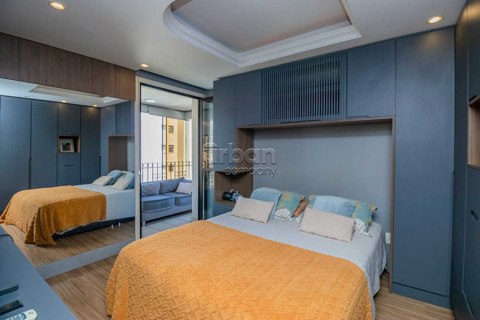 Apartamento de 2 dormitórios sendo um suíte com sacada, 1 banheiro social, cozinha com lavanderia integrada, posição lateral Leste, arejado, com incidência solar norte no período da tarde. Sala com churrasqueira e móveis planejados. No corredor rouparia, suíte com móveis planejados, segundo dormitório é usado como escritório e closet, mas tranquilamente pode ser revertido como dormitório.