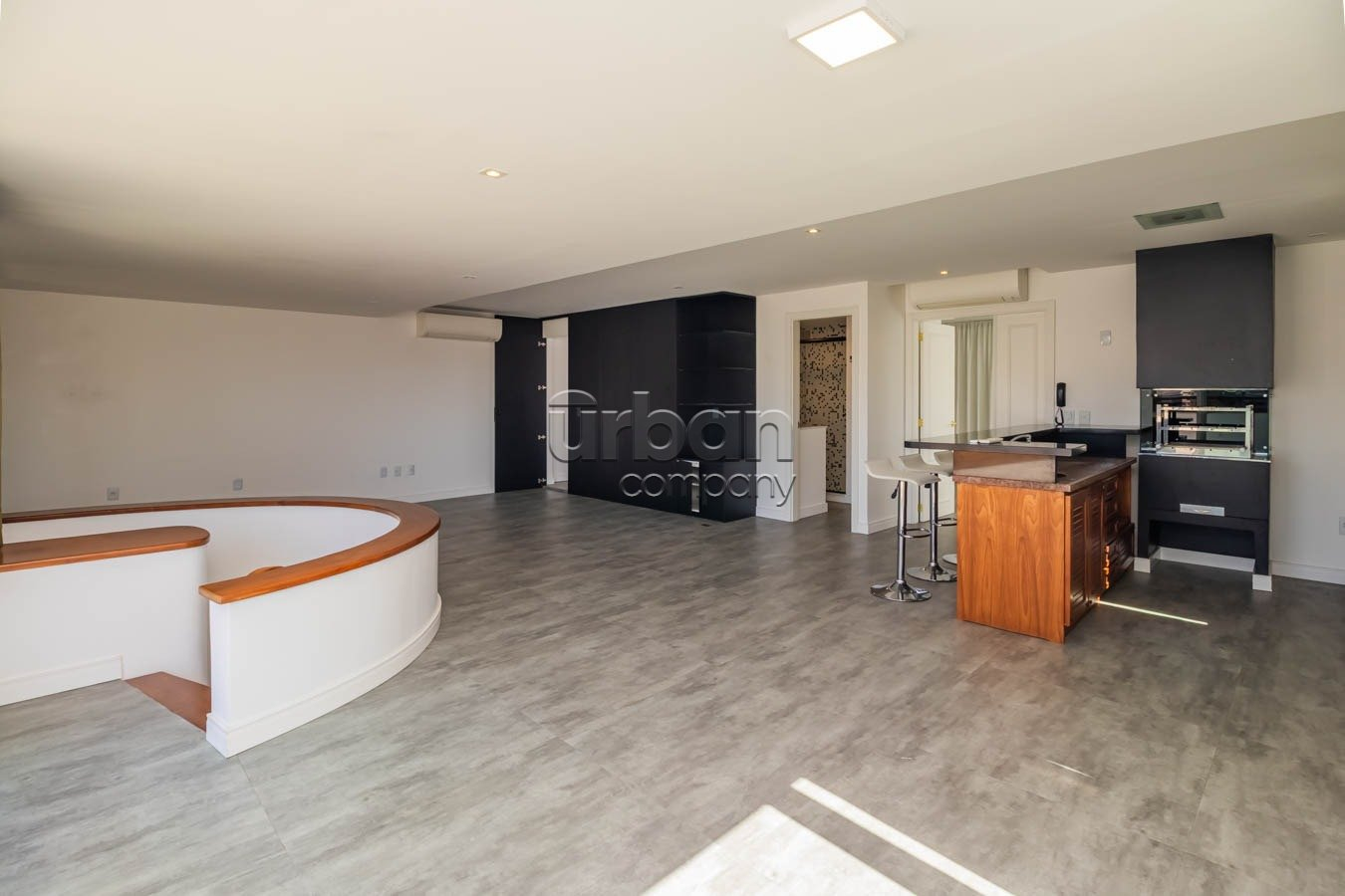 Ambiente social espaçoso, com living integrado e vista panorâmica permanente para o Parcão. O terraço conta com hidromassagem e elevador cápsula que conecta os dois níveis da unidade.