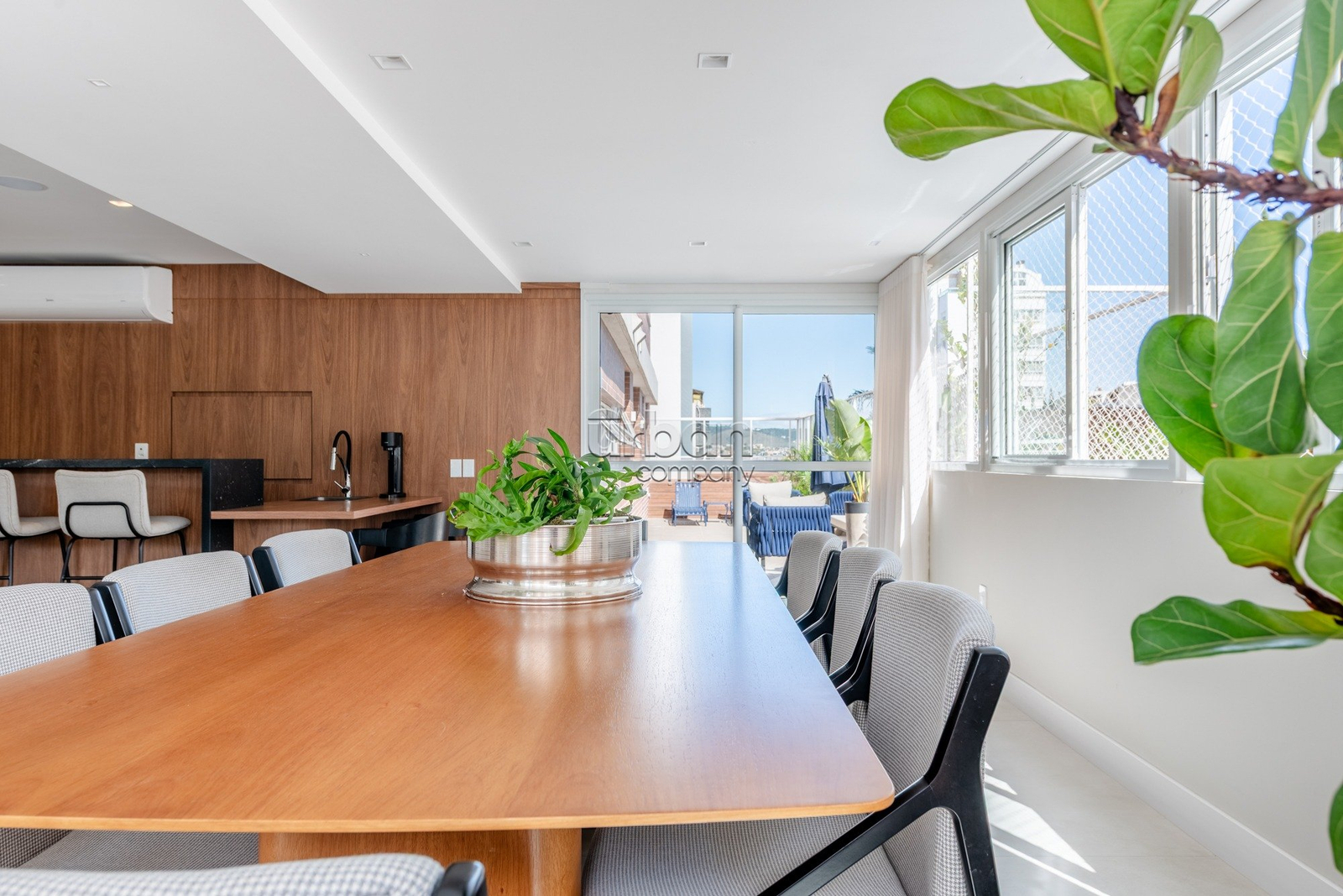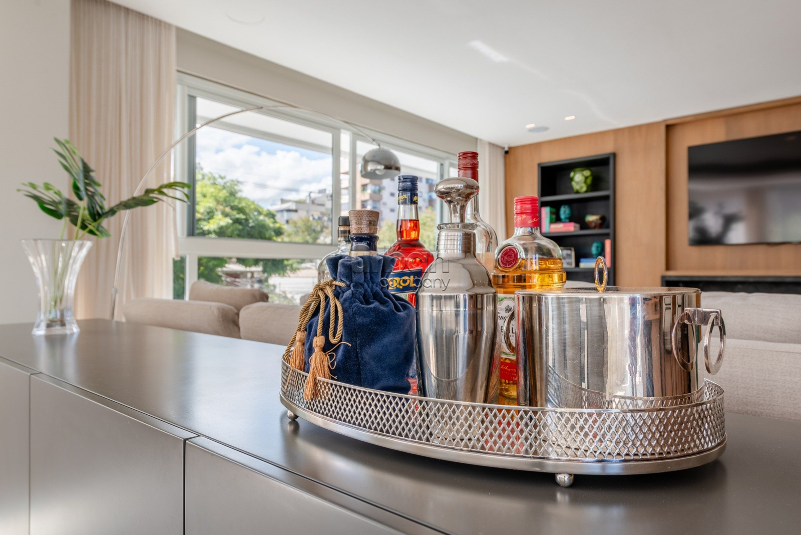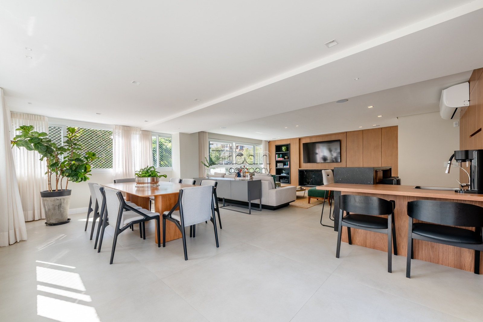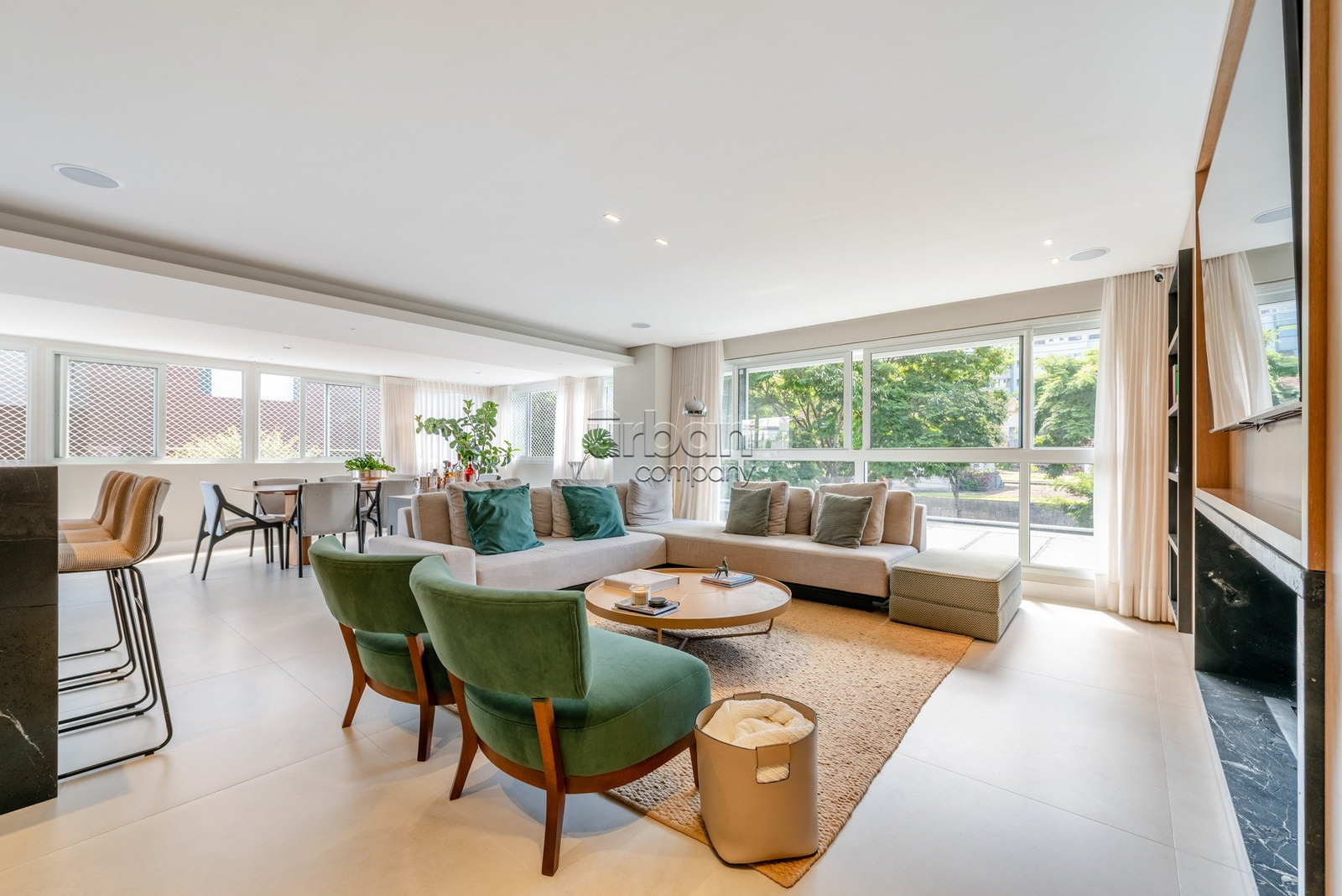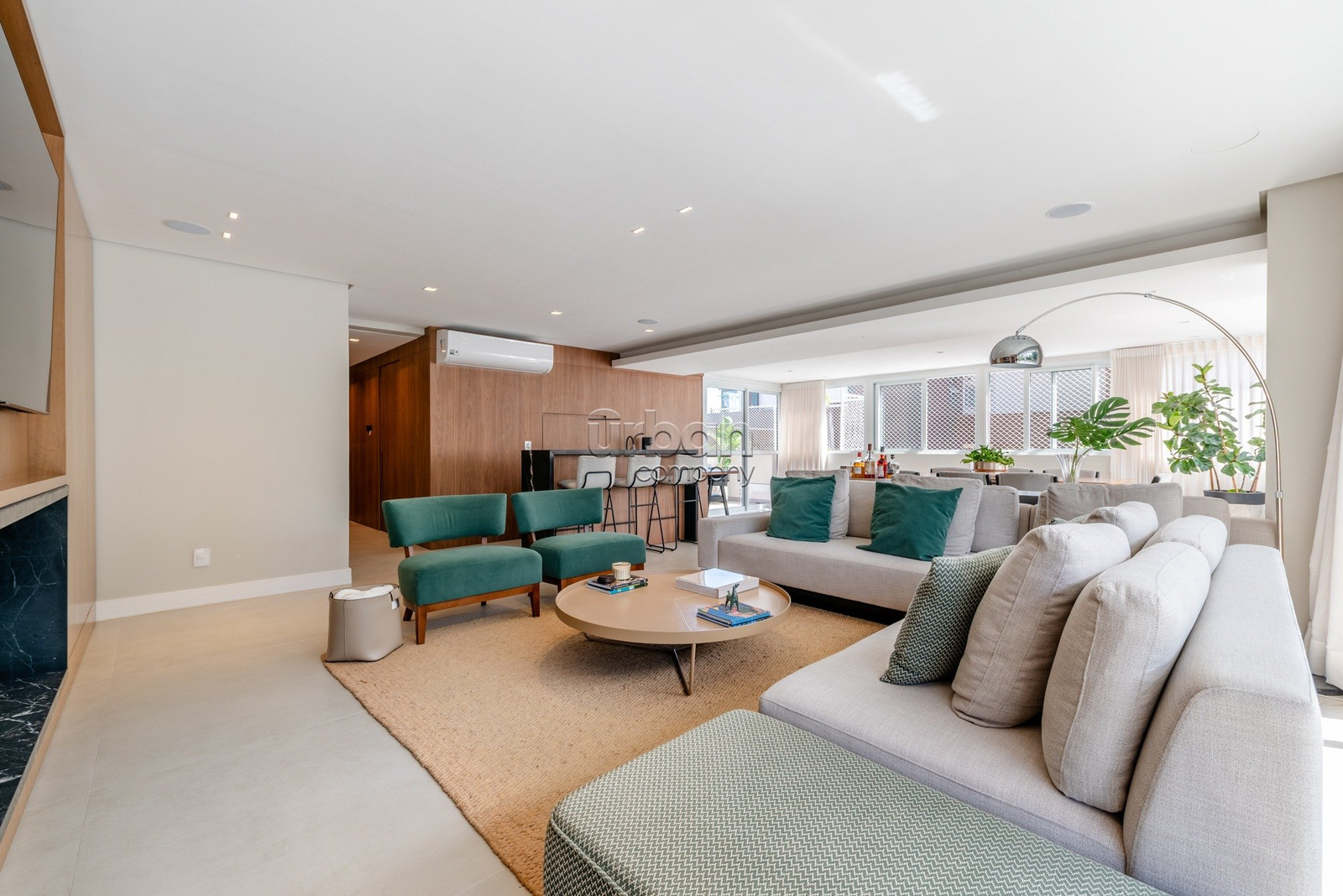 Apartamento semimobiliado, com móveis planejados. Na área íntima, são 3 suítes, sendo a master com closet. Todos os dormitórios contam com janelas automatizadas e vidros duplos. A cozinha é prática e possui churrasqueira acoplada. Living para 3 ambientes, muito iluminado, com amplas aberturas piso-teto.