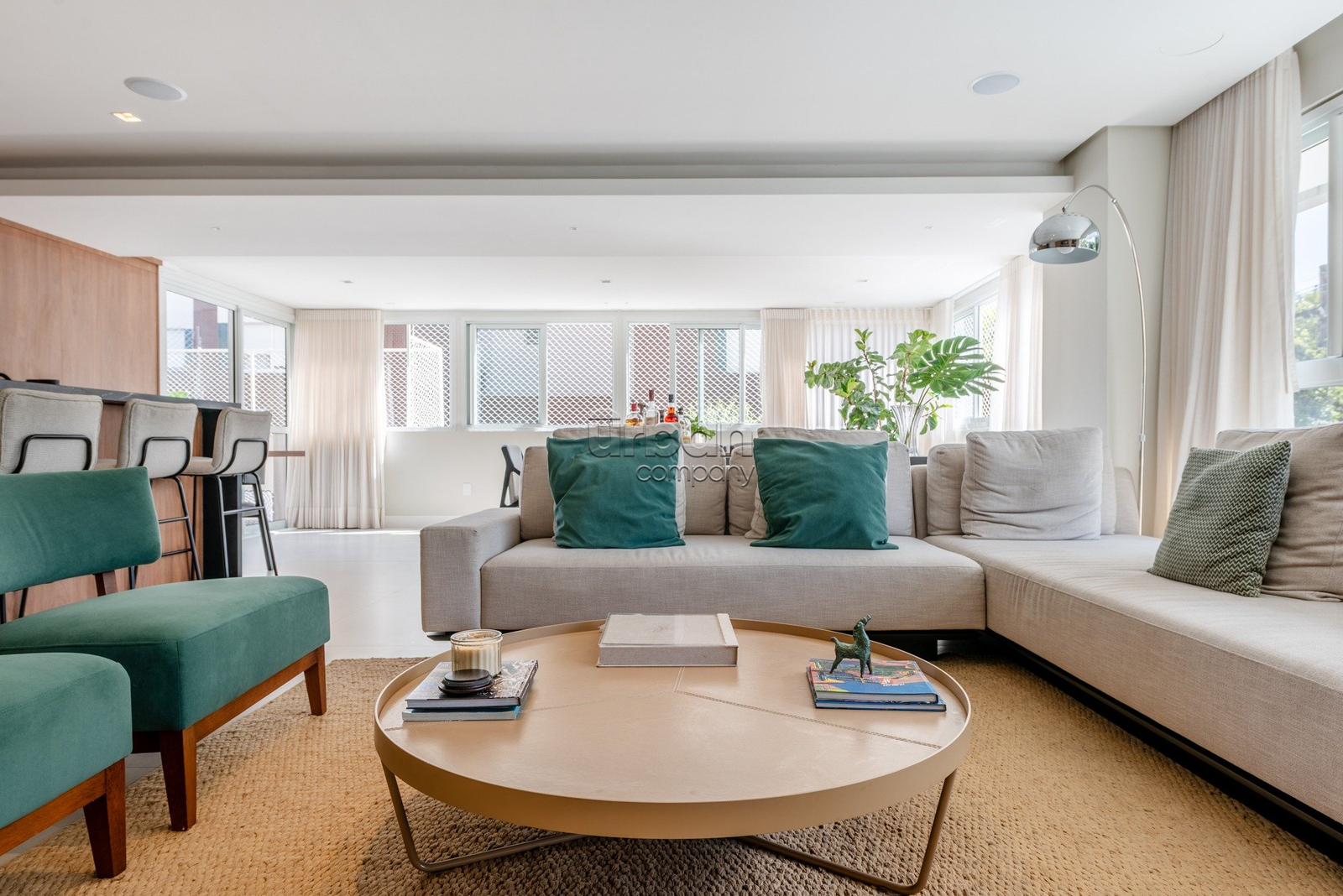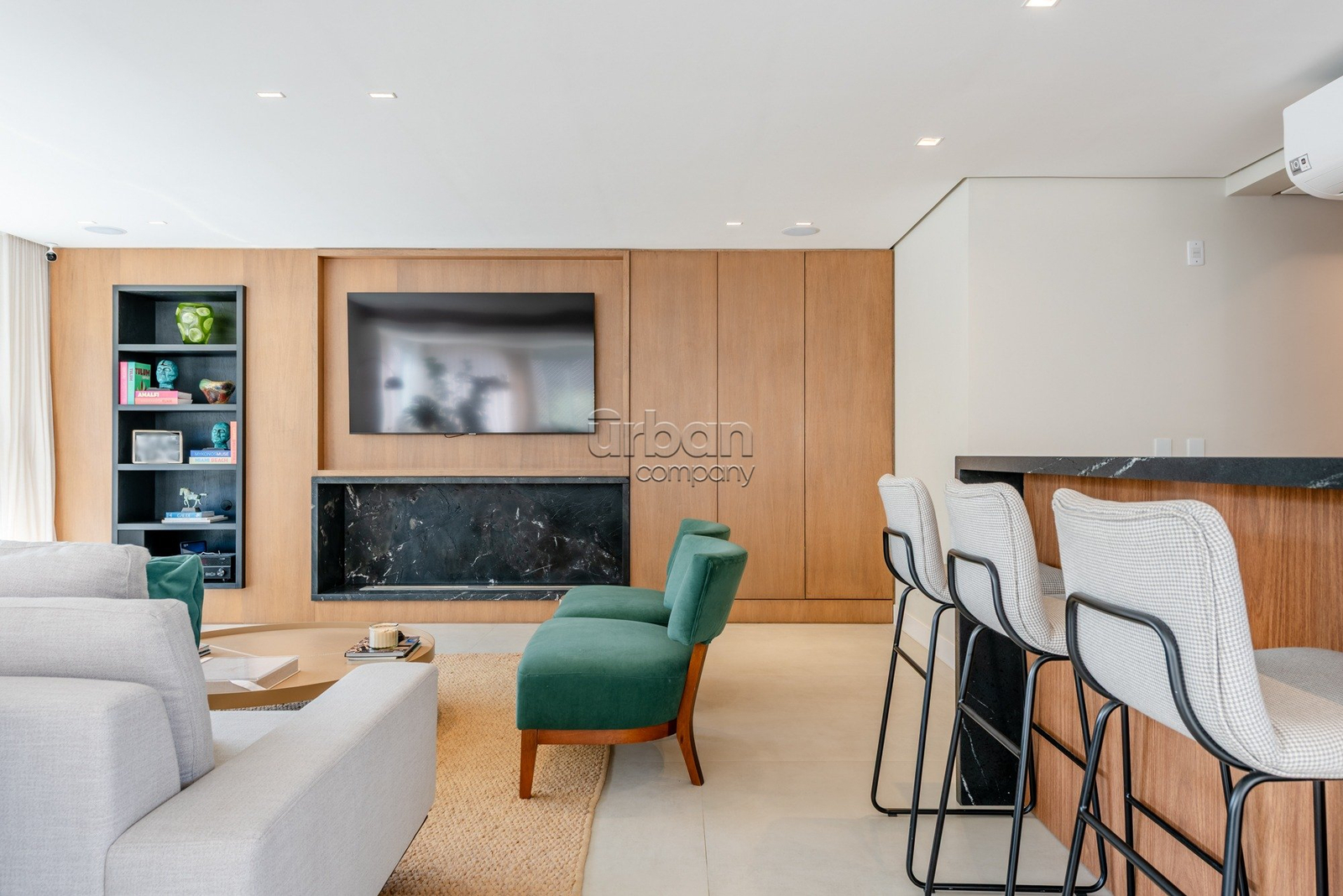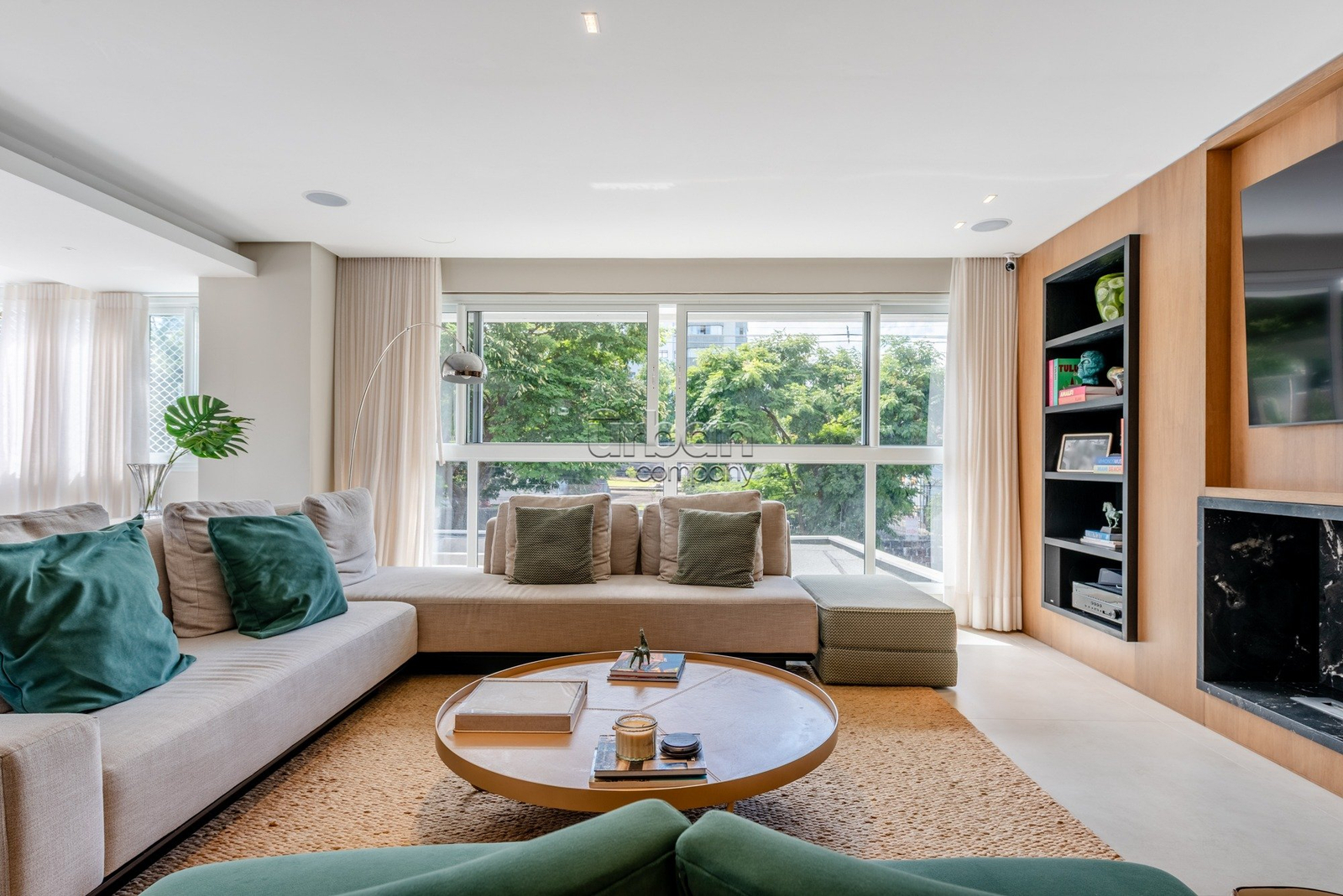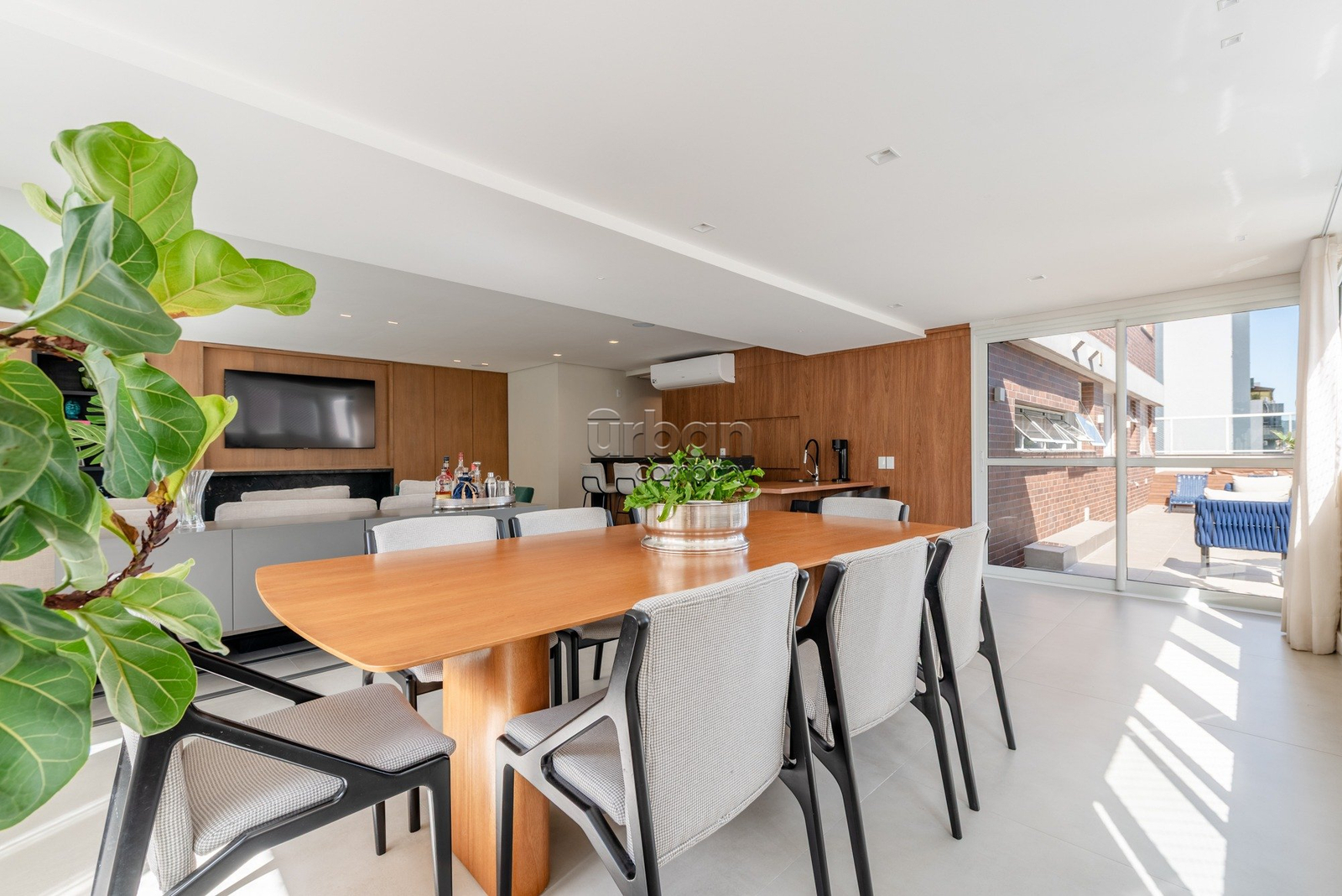 Apartamento semimobiliado, com móveis planejados. Na área íntima, são 3 suítes, sendo a master com closet. Todos os dormitórios contam com janelas automatizadas e vidros duplos. A cozinha é prática e possui churrasqueira acoplada. Living para 3 ambientes, muito iluminado, com amplas aberturas piso-teto.