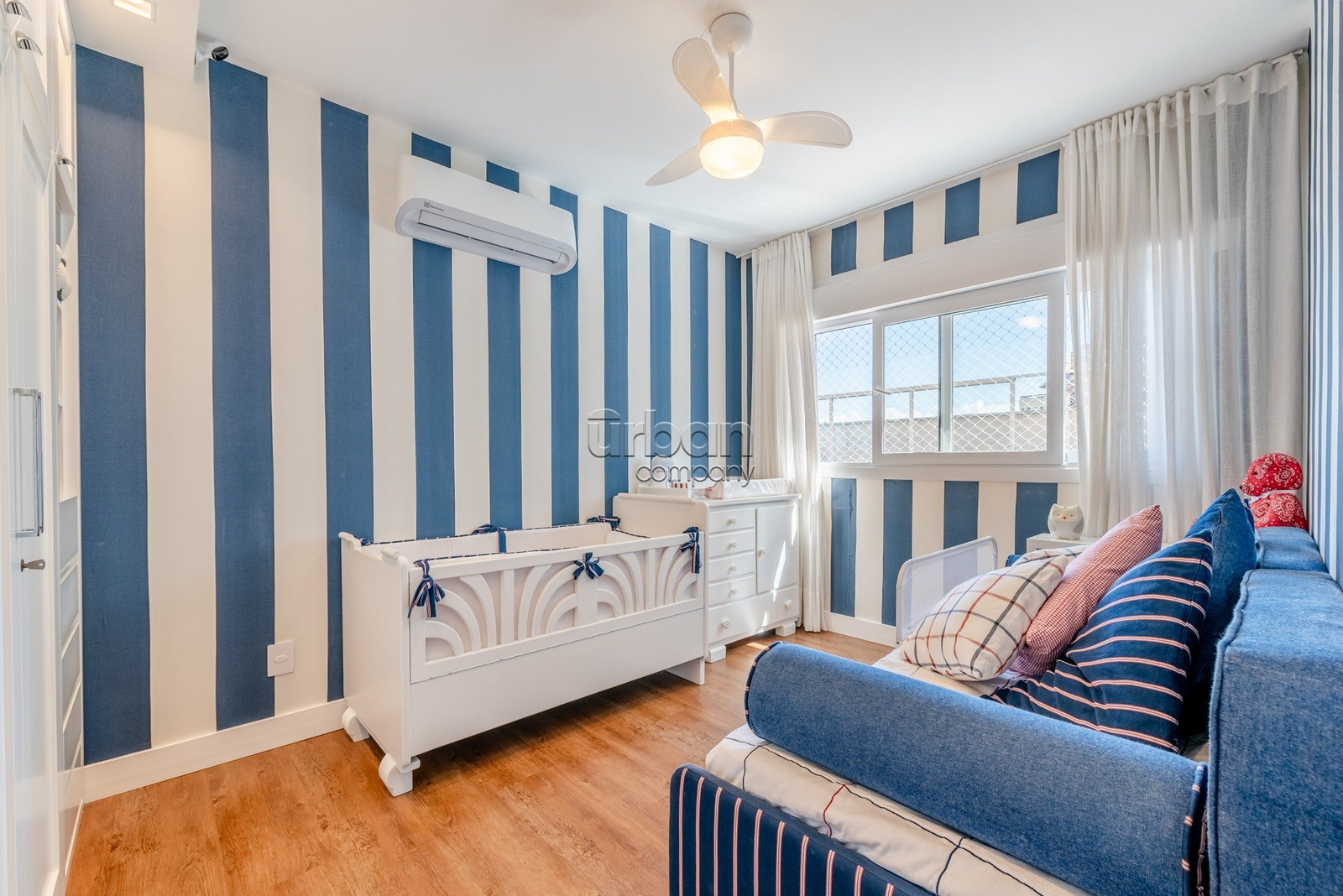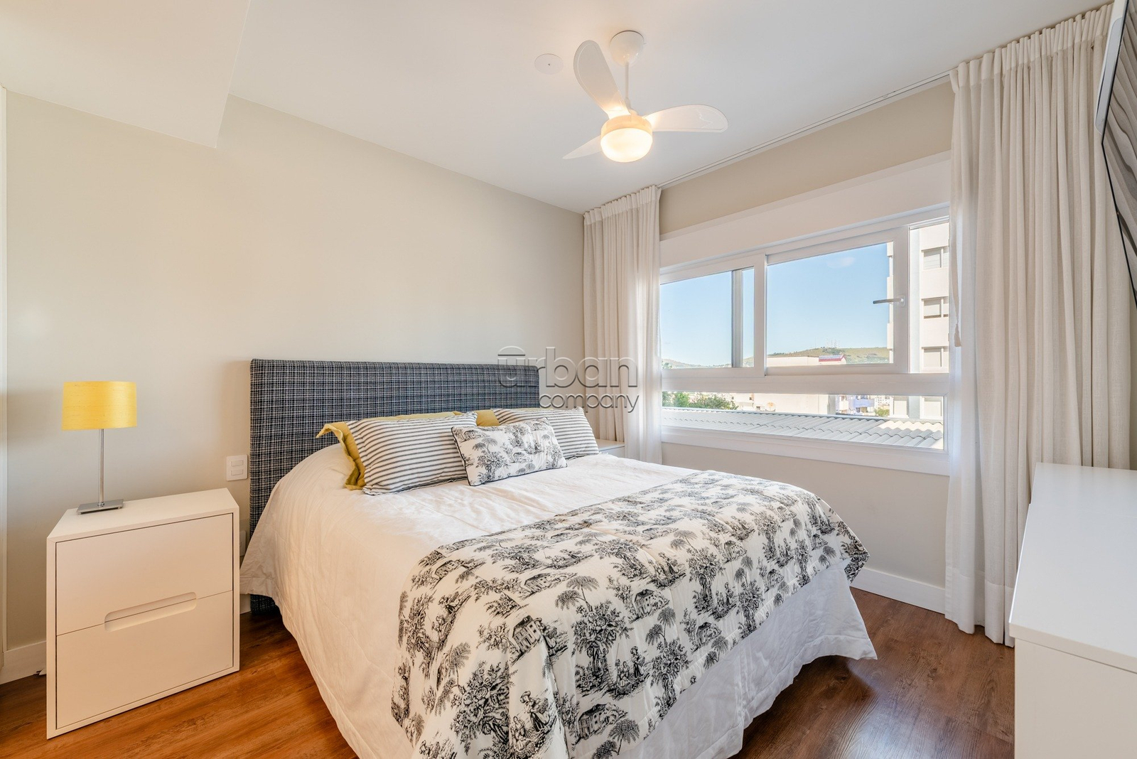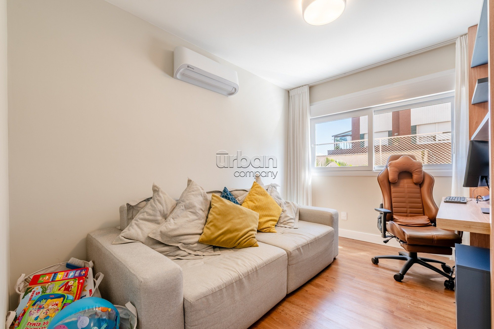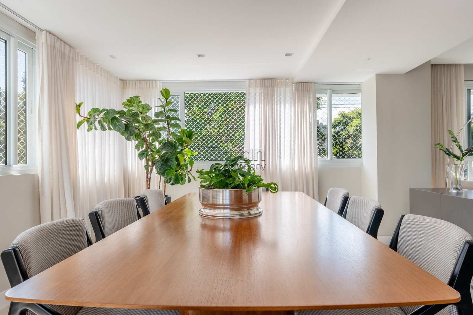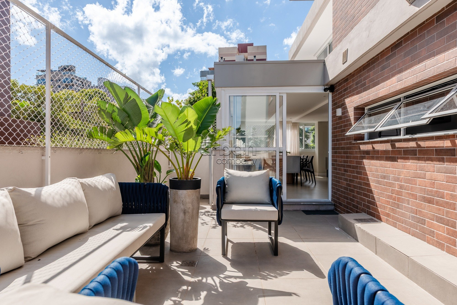 Apartamento semimobiliado, com móveis planejados. Na área íntima, são 3 suítes, sendo a master com closet. Todos os dormitórios contam com janelas automatizadas e vidros duplos. A cozinha é prática e possui churrasqueira acoplada. Living para 3 ambientes, muito iluminado, com amplas aberturas piso-teto.