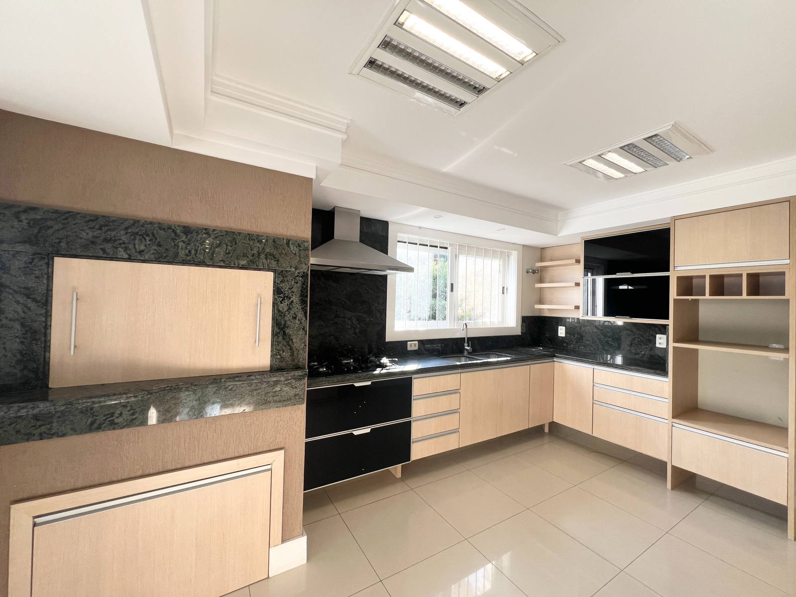 1 máster com sacada e mais 1 banheiro social. No piso inferior possui living para 3 ambientes, com sala de estar e jantar com lareira, sala de TV integrada à cozinha estilo conceito aberto, lavabo, lavanderia, despensa, banheiro auxiliar, pátio com piscina e garagem para 5 carros.