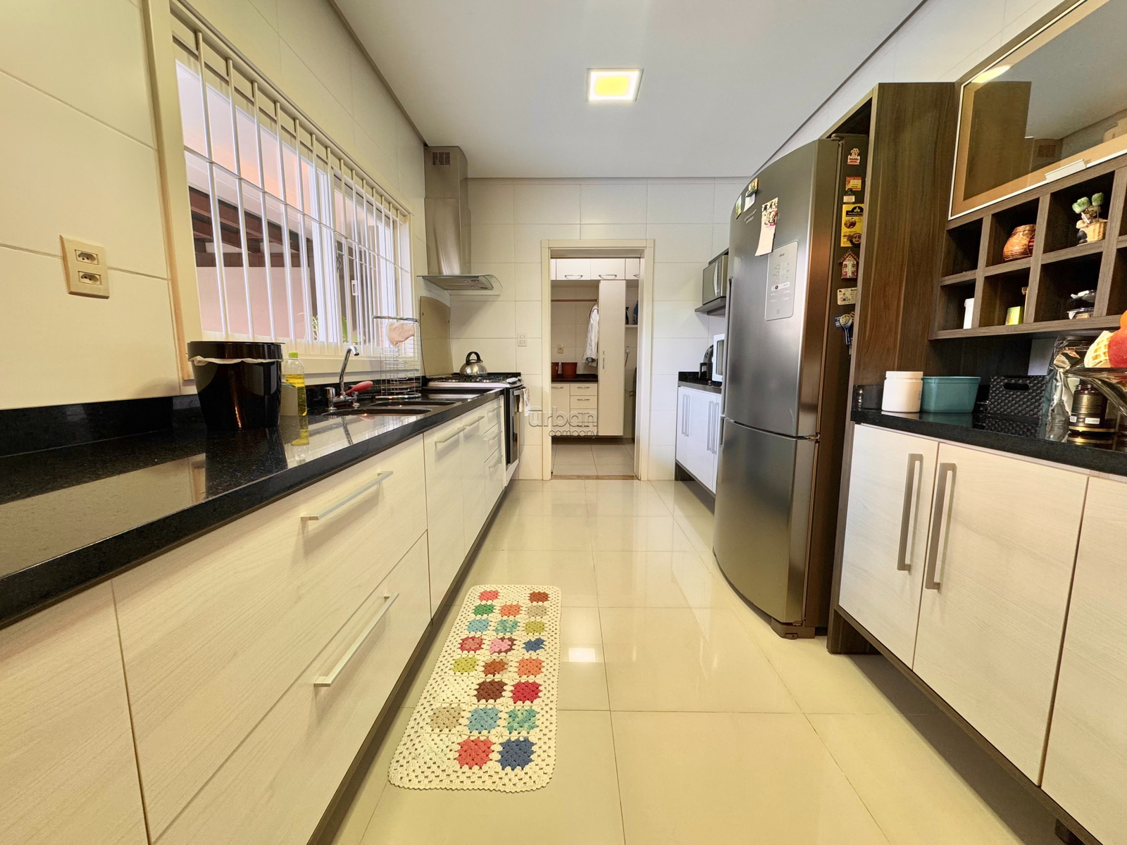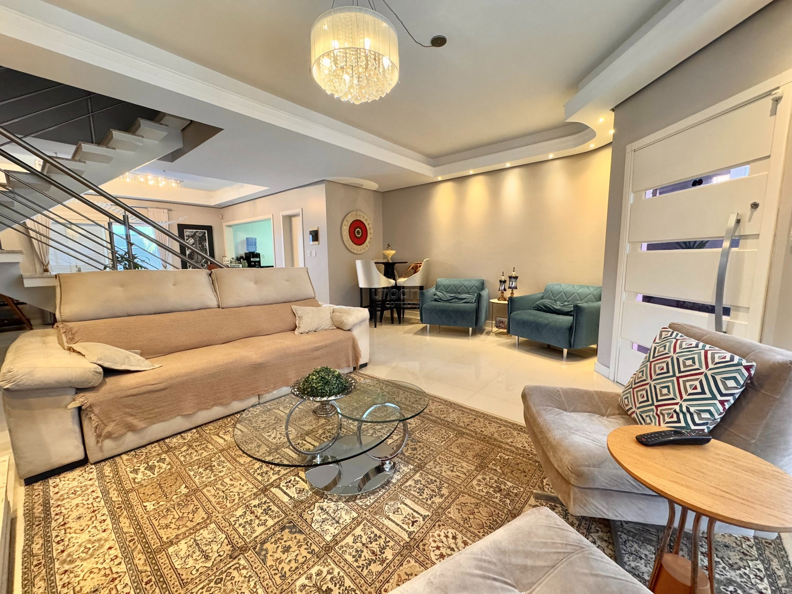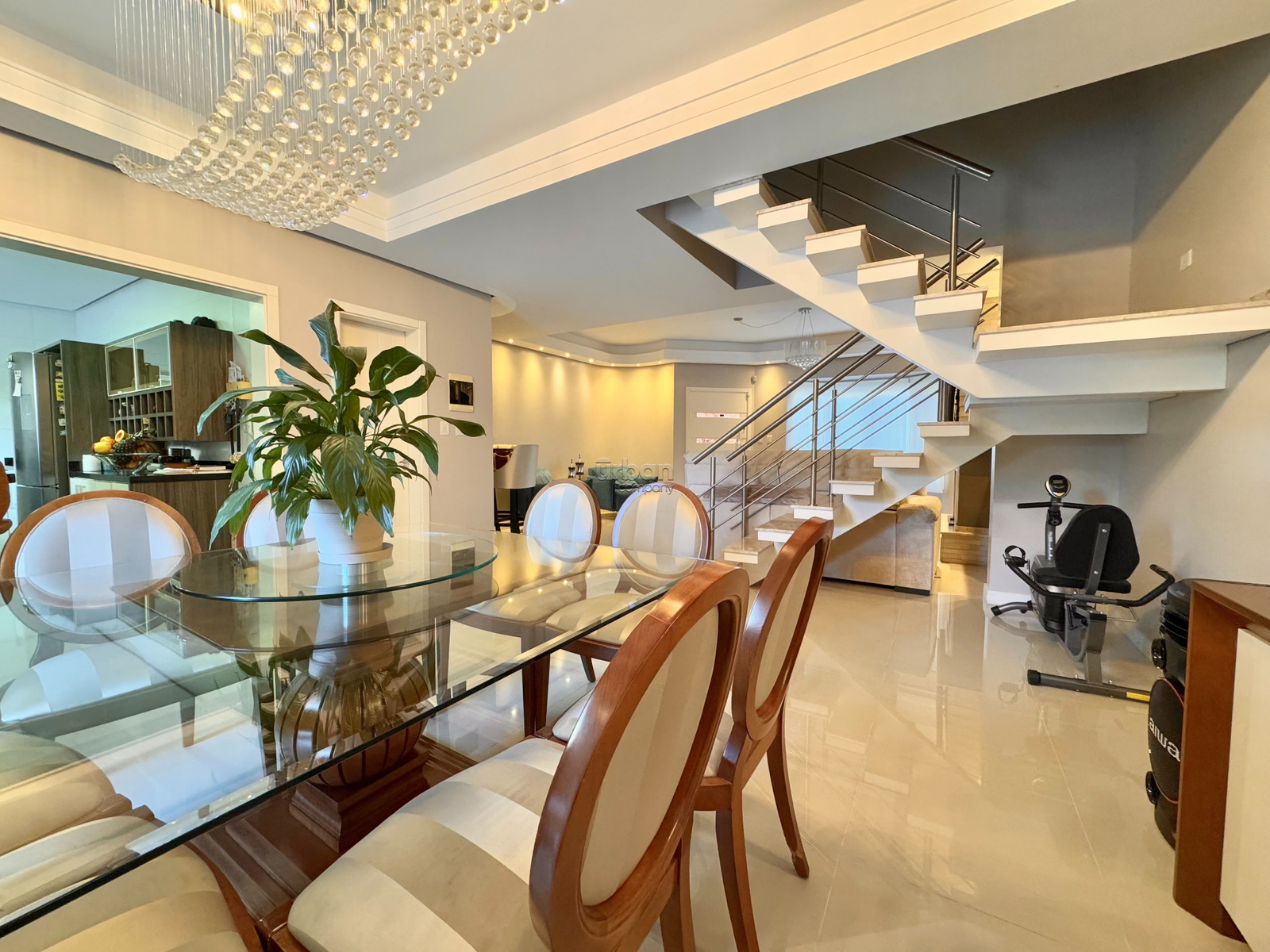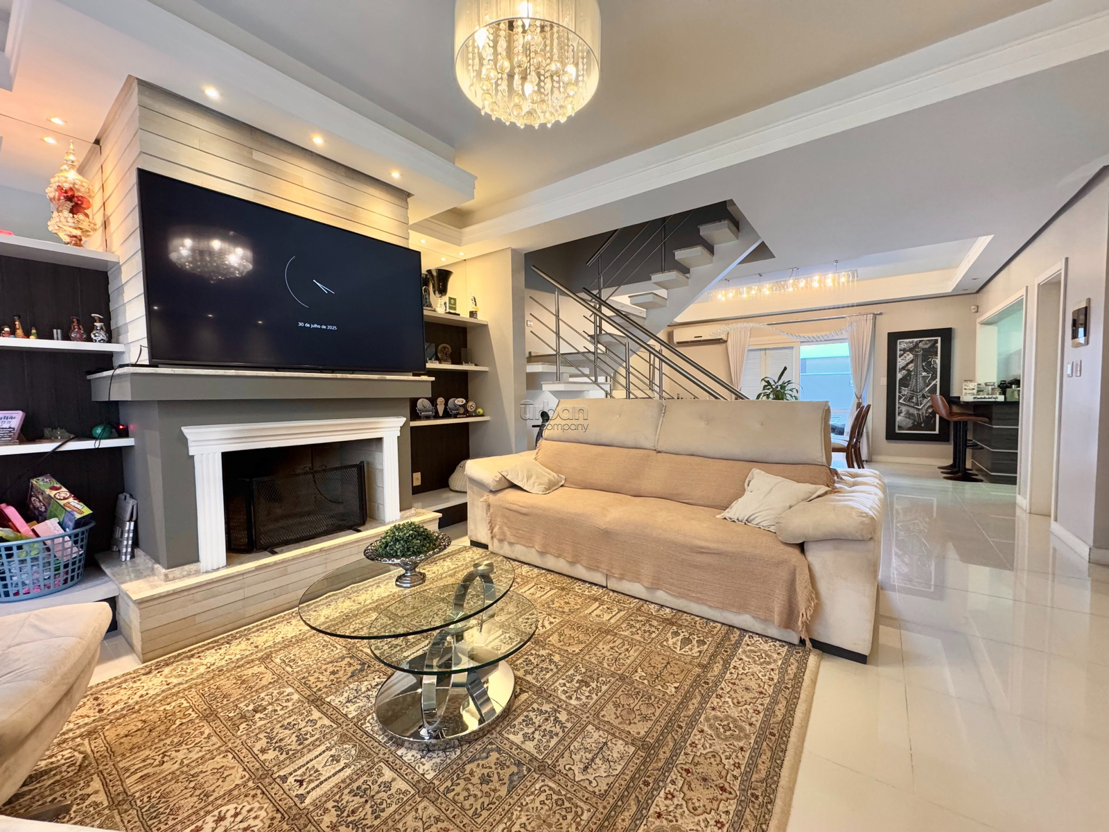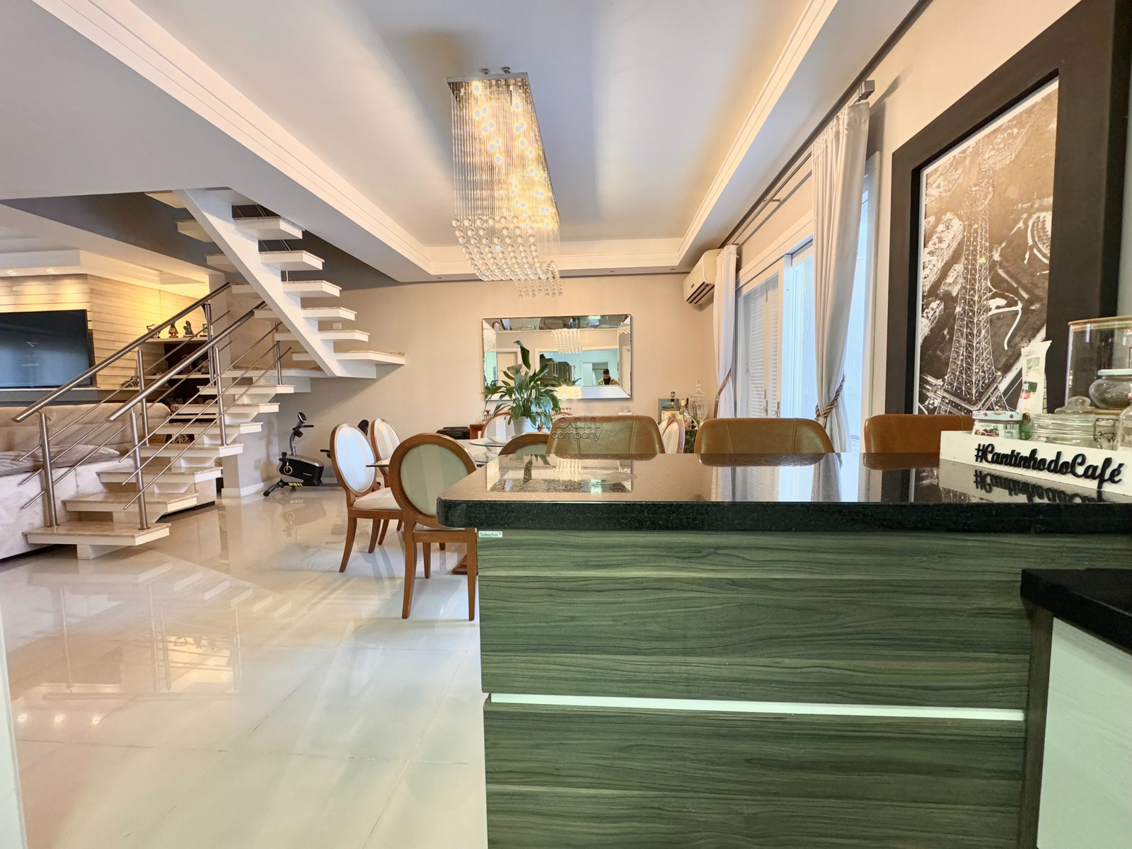 Possui amplo living dois ambientes com lareira, lavabo e acesso a área da piscina. Cozinha americana equipada com móveis planejados, lavanderia, área externa com uma piscina aquecida, churrasqueira, espaço gourmet, banheiro e depósito. A garagem conta com quatro vagas, oferecendo mais segurança e praticidade.