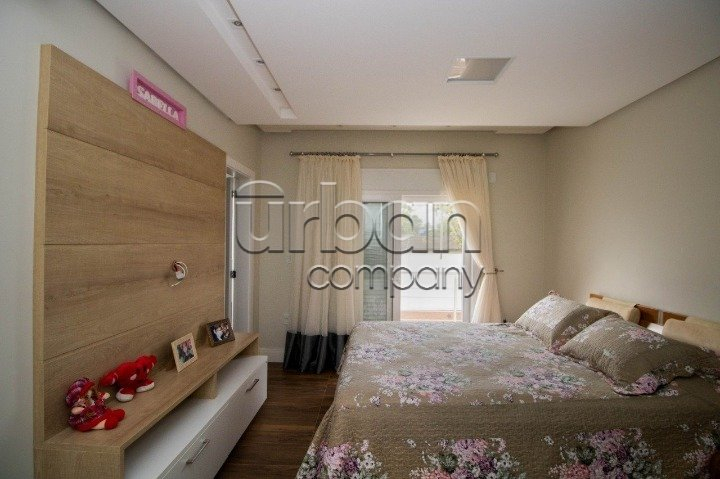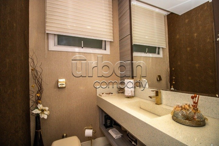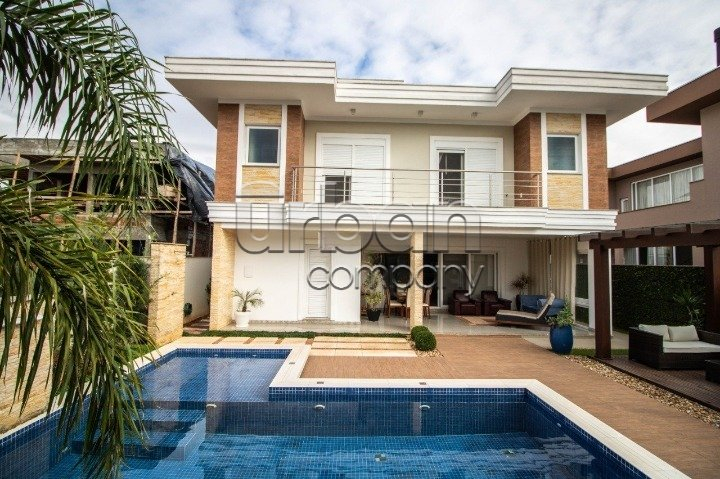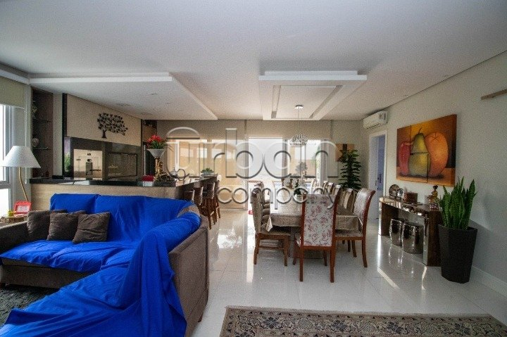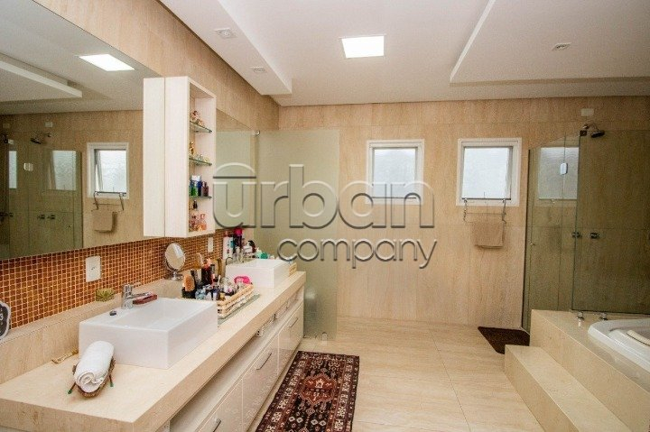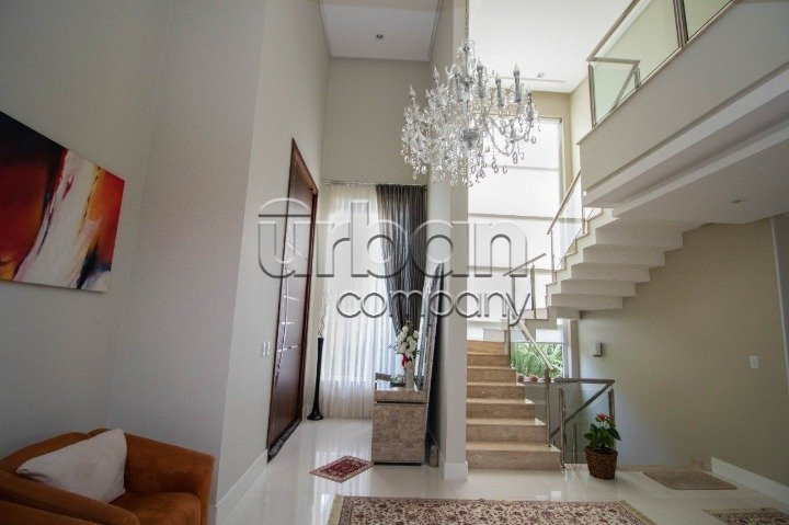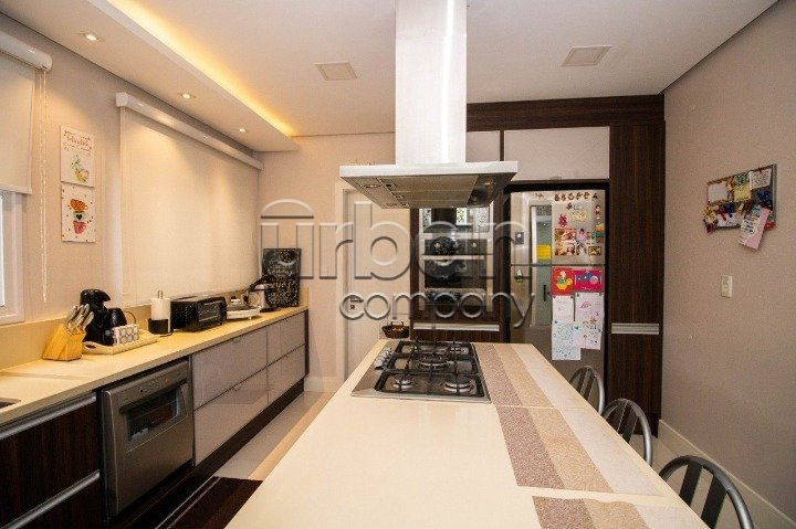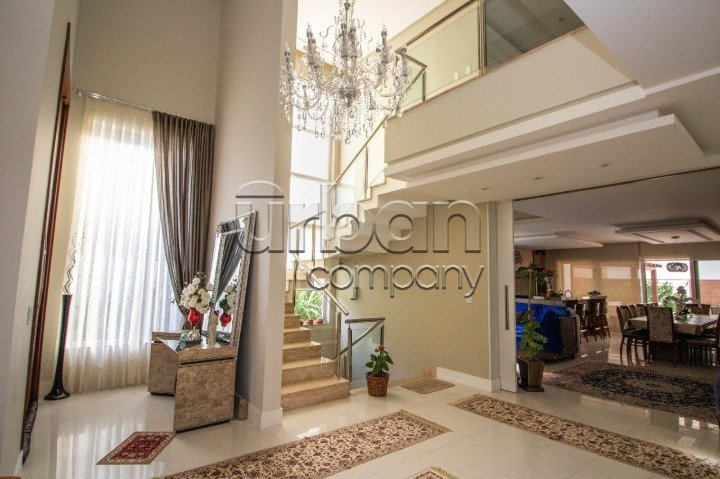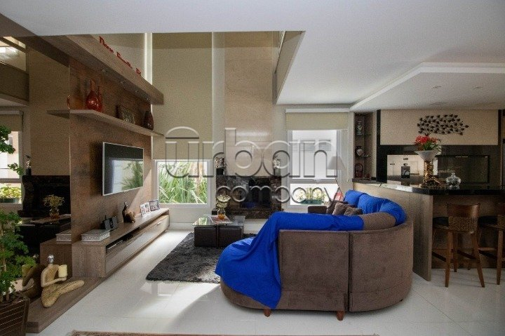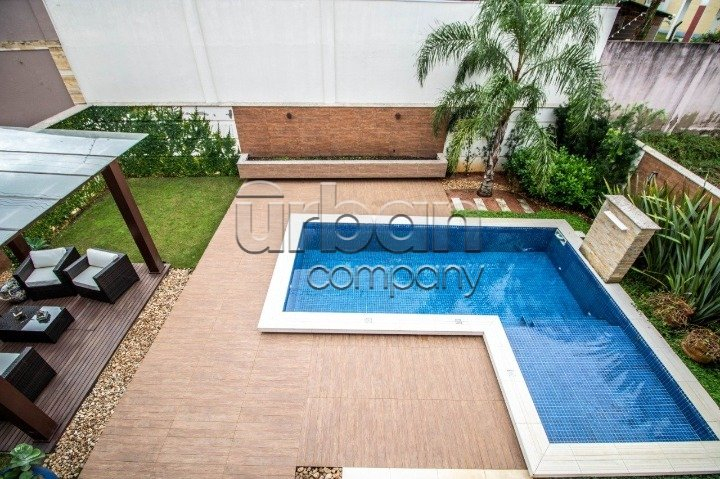 No pavimento do meio temos living amplo para dois ambientes, temos outra sala de estar e jantar bem ampla com lareira, duas cozinhas, uma delas isolada com ilha e dispensa, a outra integra com a sala de jantar, churrasqueira e espaço gourmet. Nos fundos uma área coberta com toda vista para piscina, mais outra churrasqueira com armário e pia. No pavimento térreo temos quatro vagas cobertas para carro, adega e lavanderia. Sótão grande no último pavimento com acesso por escada camuflada. Todas as esquadrias em PVC com vidros duplos. Piso em porcelanato no térreo e laminado na parte superior. Todos os ambientes com splits, espera para calefação, espera para automação, sistema de aquecimento solar de banho com reservatório de 800 litros.