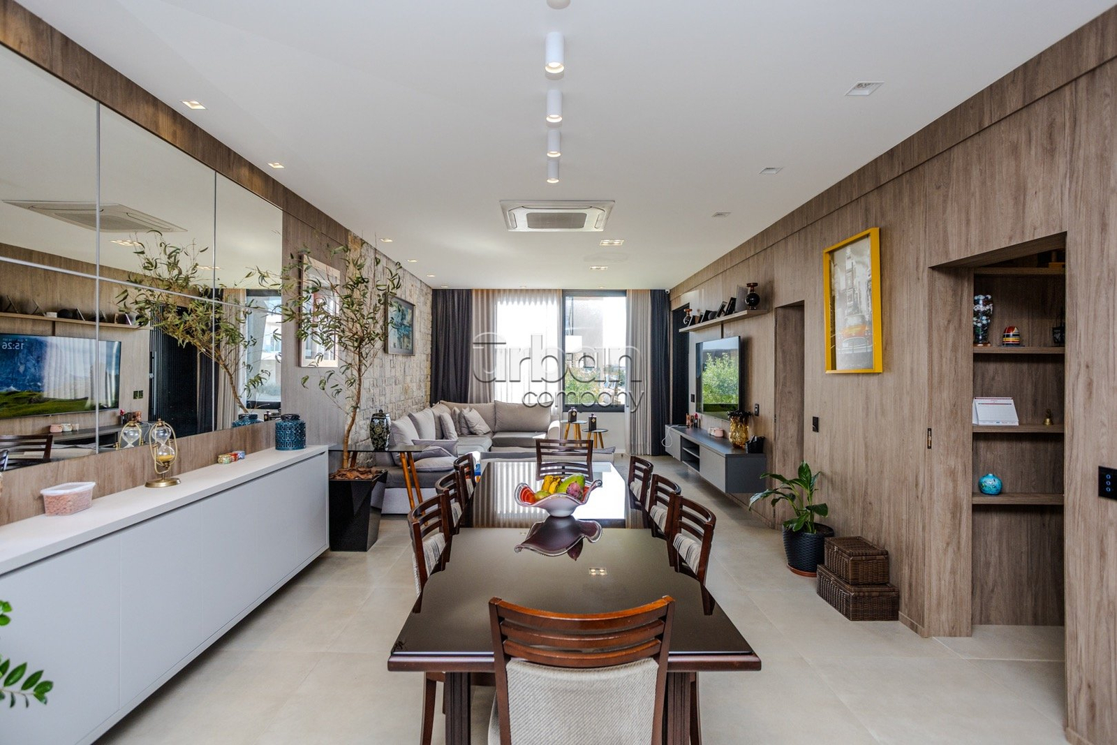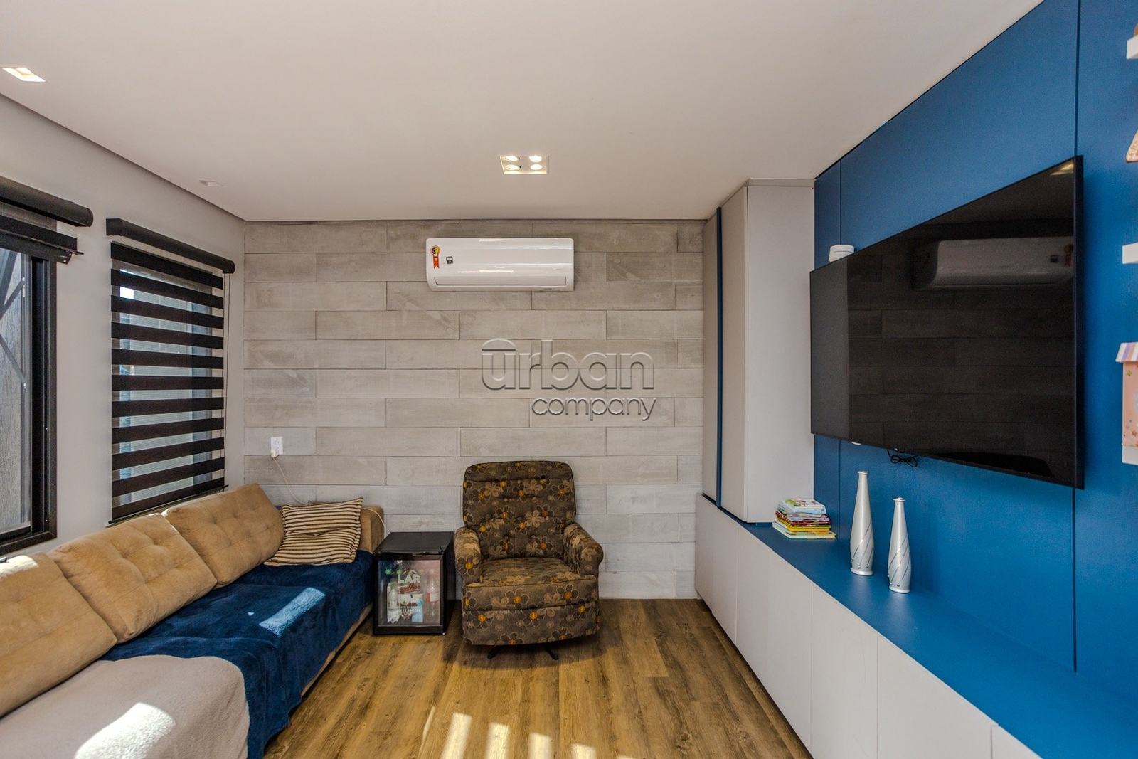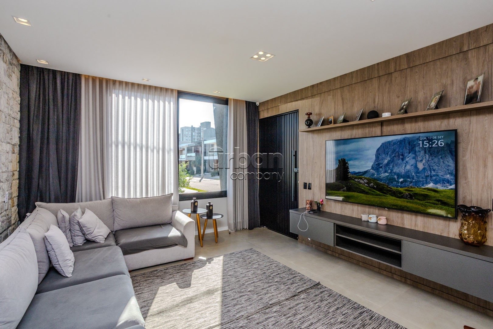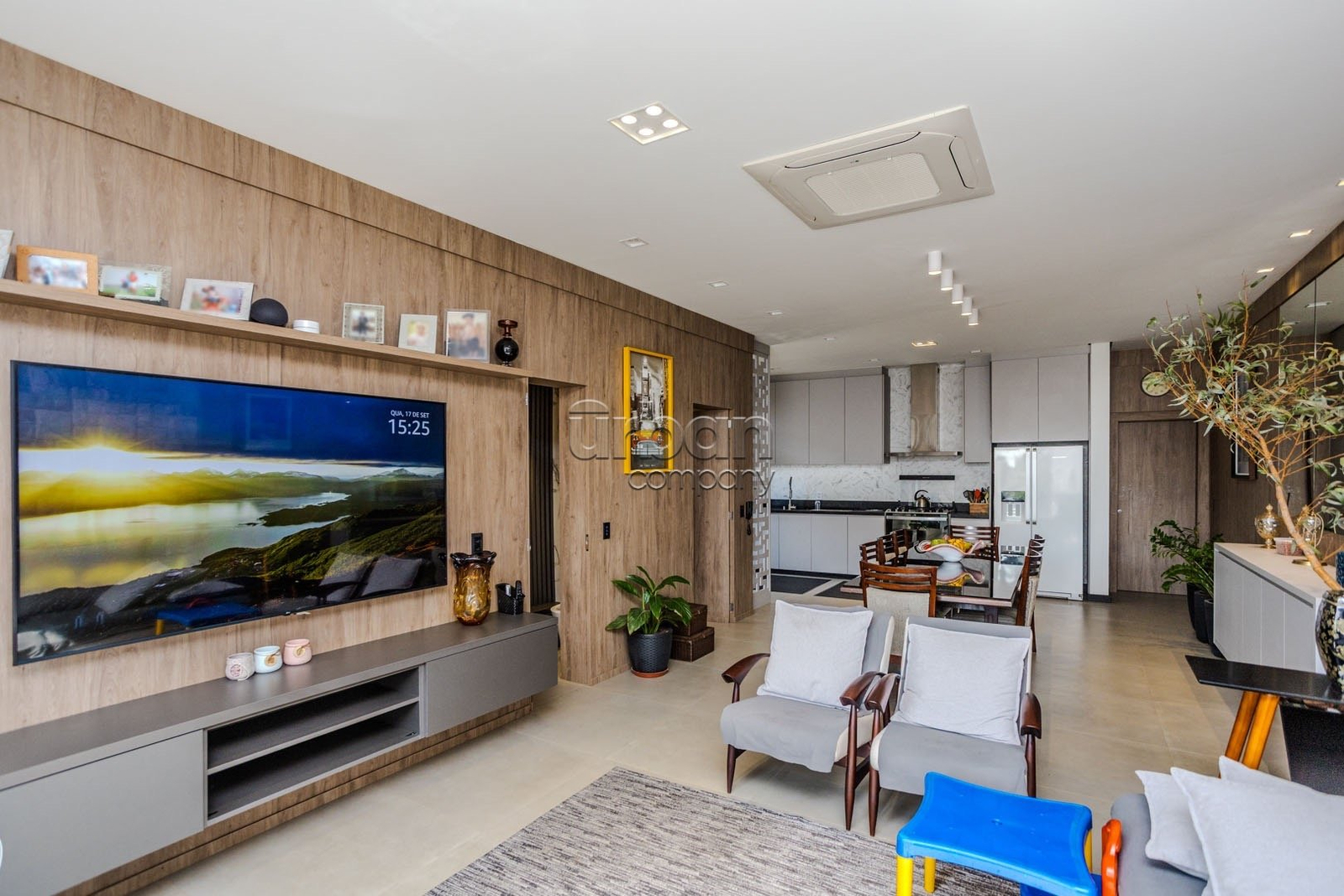 - Sala de estar decorada, contendo sofá de canto, televisão de 75 polegadas, ar condicionado central de 48.000 btus;