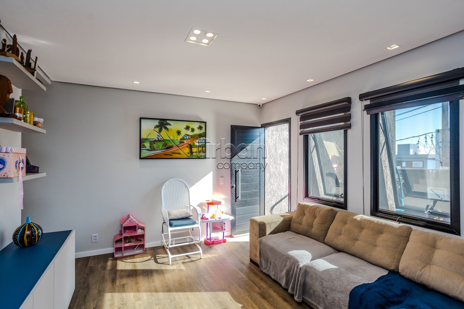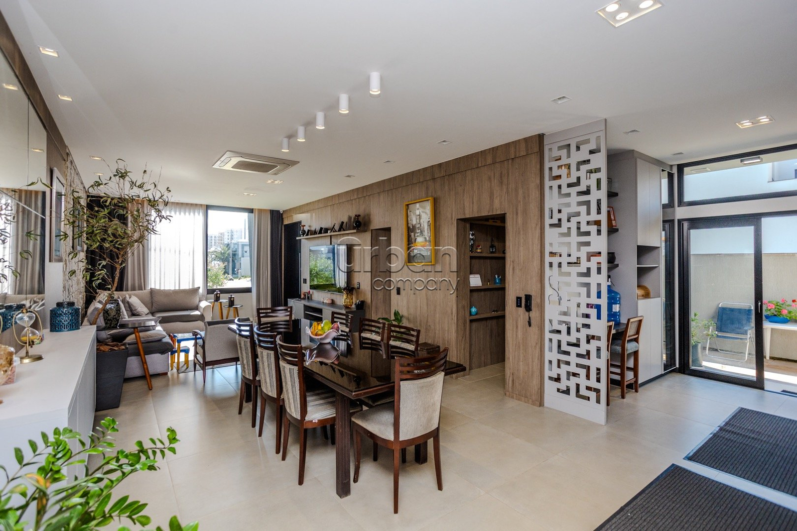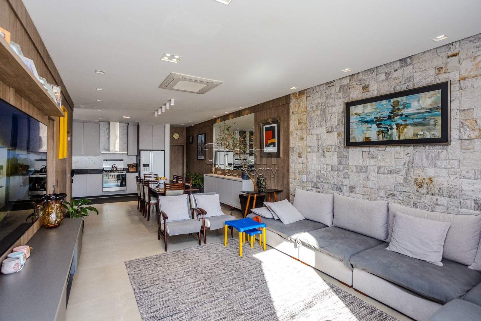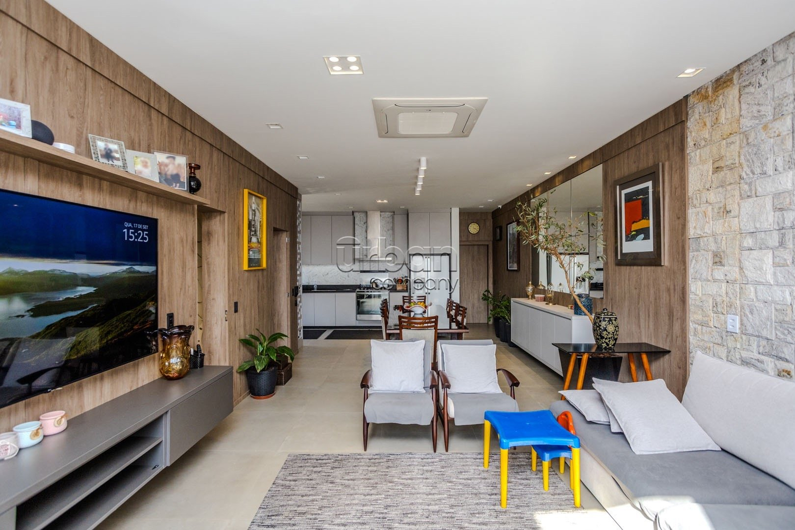 - Sala de estar decorada, contendo sofá de canto, televisão de 75 polegadas, ar condicionado central de 48.000 btus;